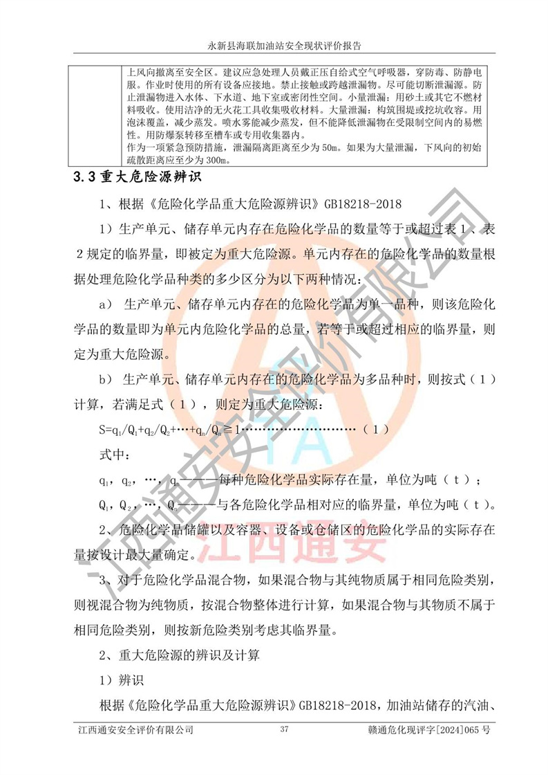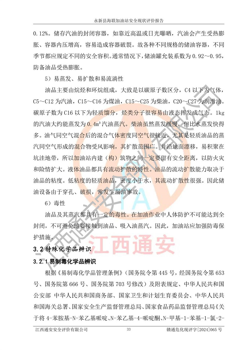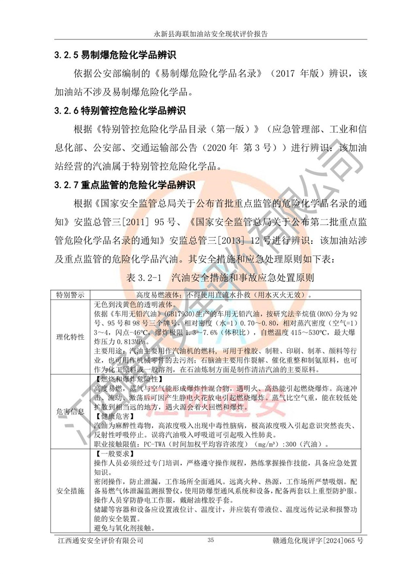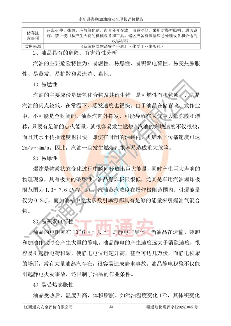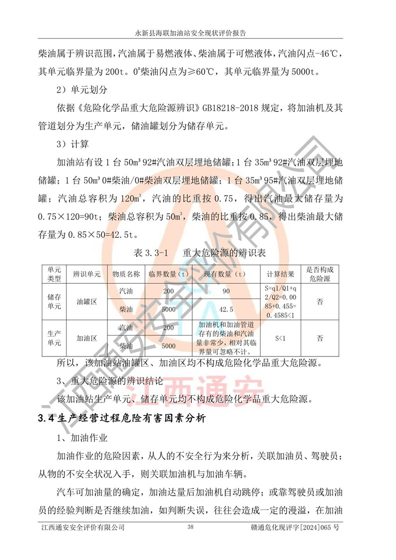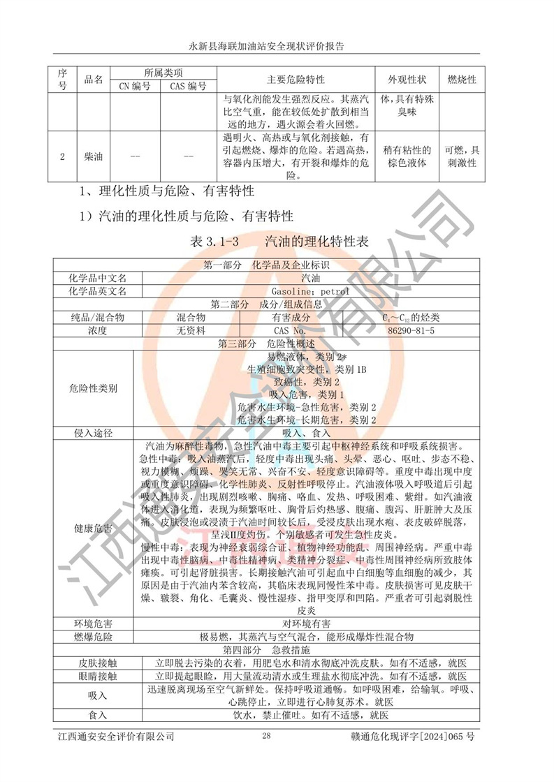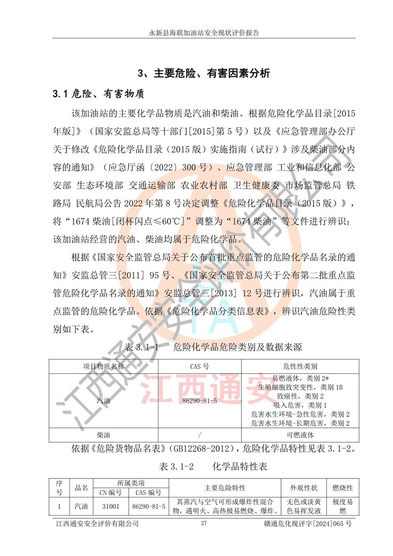 項(xiàng)目簡(jiǎn)介 | 永新縣海聯(lián)加油站成立于2009年9月8日,住所位于江西省吉安市永新縣高市鄉(xiāng)蘆溪村319國(guó)道旁。該加油站經(jīng)營(yíng)許可范圍:許可項(xiàng)目:成品油零售(依法須經(jīng)批準(zhǔn)的項(xiàng)目,經(jīng)相關(guān)部門批準(zhǔn)后方可開(kāi)展經(jīng)營(yíng)活動(dòng),具體經(jīng)營(yíng)項(xiàng)目以相關(guān)部門批準(zhǔn)文件或許可證件為準(zhǔn))。 永新縣海聯(lián)加油站設(shè)2臺(tái)0#柴油/0#柴油雙槍加油機(jī),2臺(tái)92#汽油/95#汽油雙槍加油機(jī),1臺(tái)92#汽油/92#汽油雙槍加油機(jī);設(shè)置4臺(tái)SF雙層埋地儲(chǔ)罐,其中包括:1臺(tái)50m392#汽油雙層埋地儲(chǔ)罐;1臺(tái)35m392#汽油雙層埋地儲(chǔ)罐;1臺(tái)50m30#柴油雙層埋地儲(chǔ)罐;1臺(tái)35m395#汽油雙層埋地儲(chǔ)罐;總儲(chǔ)量為170m3,柴油折半后總?cè)莘e為145m3,加油站等級(jí)為二級(jí),汽油卸油、加油設(shè)置了油氣回收系統(tǒng)。 該加油站的主要化學(xué)品物質(zhì)是汽油和柴油。根據(jù)危險(xiǎn)化學(xué)品目錄[2015年版]》(**安監(jiān)總局等十部門[2015]第5號(hào))以及《應(yīng)急管理部辦公廳關(guān)于修改《危險(xiǎn)化學(xué)品目錄(2015版)實(shí)施指南(試行)》涉及柴油部分內(nèi)容的通知》(應(yīng)急廳函〔2022〕300號(hào))、應(yīng)急管理部 工業(yè)和信息化部 公安部 生態(tài)環(huán)境部 交通運(yùn)輸部 農(nóng)業(yè)農(nóng)村部 衛(wèi)生健康委 市場(chǎng)監(jiān)管總局 鐵路局 民航局公告2022年第8號(hào)決定調(diào)整《危險(xiǎn)化學(xué)品目錄(2015版)》,將“1674柴油[閉杯閃點(diǎn)≤60℃]”調(diào)整為“1674柴油”等文件進(jìn)行辨識(shí):該加油站經(jīng)營(yíng)的汽油、柴油均屬于危險(xiǎn)化學(xué)品。 | |||