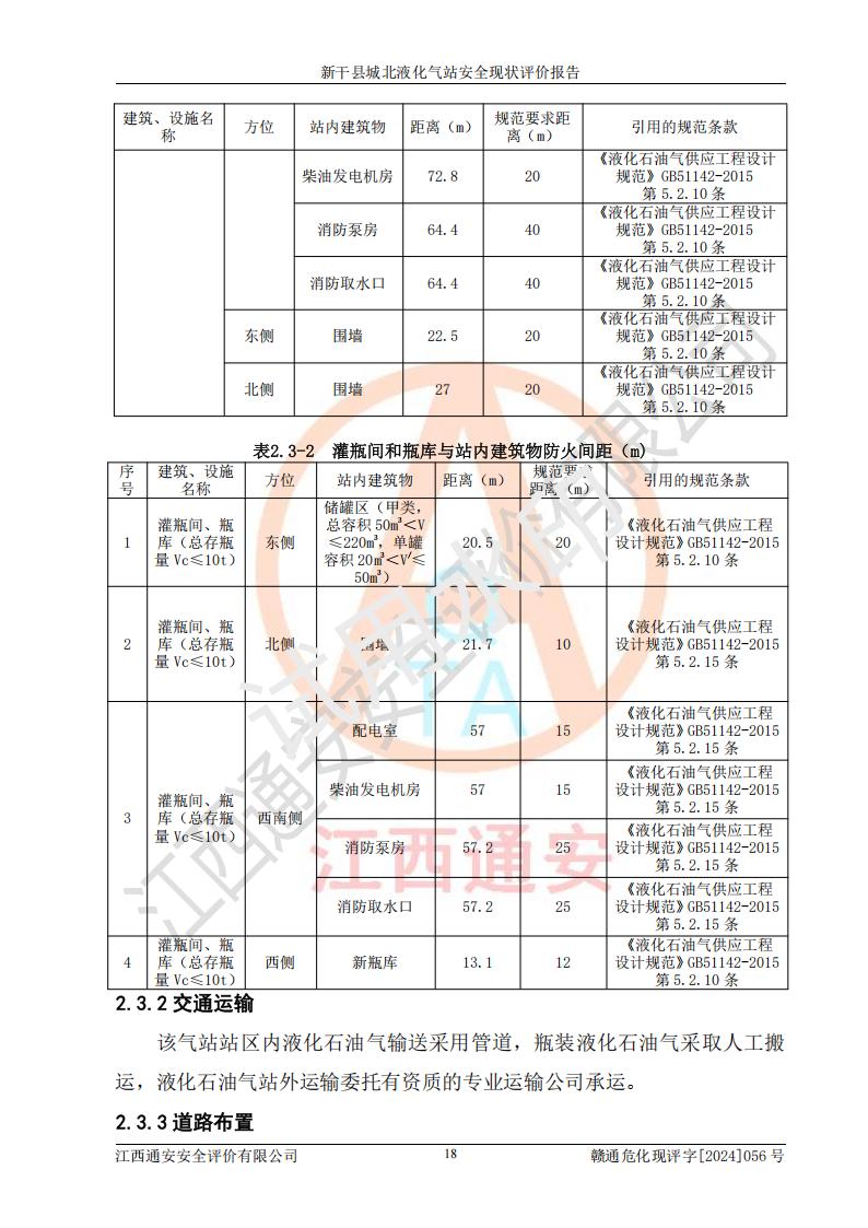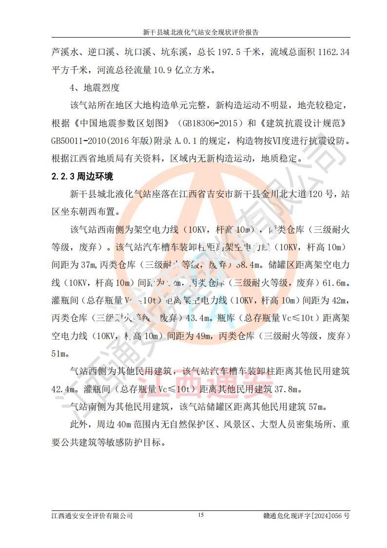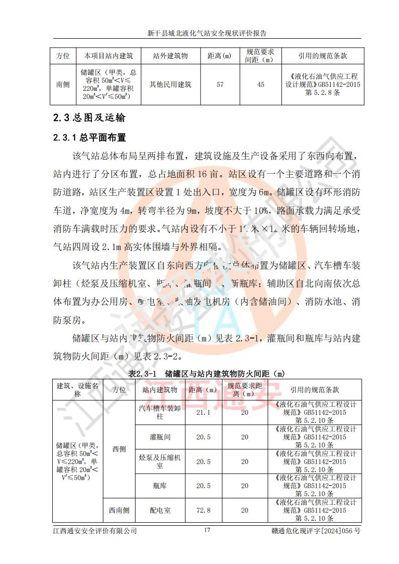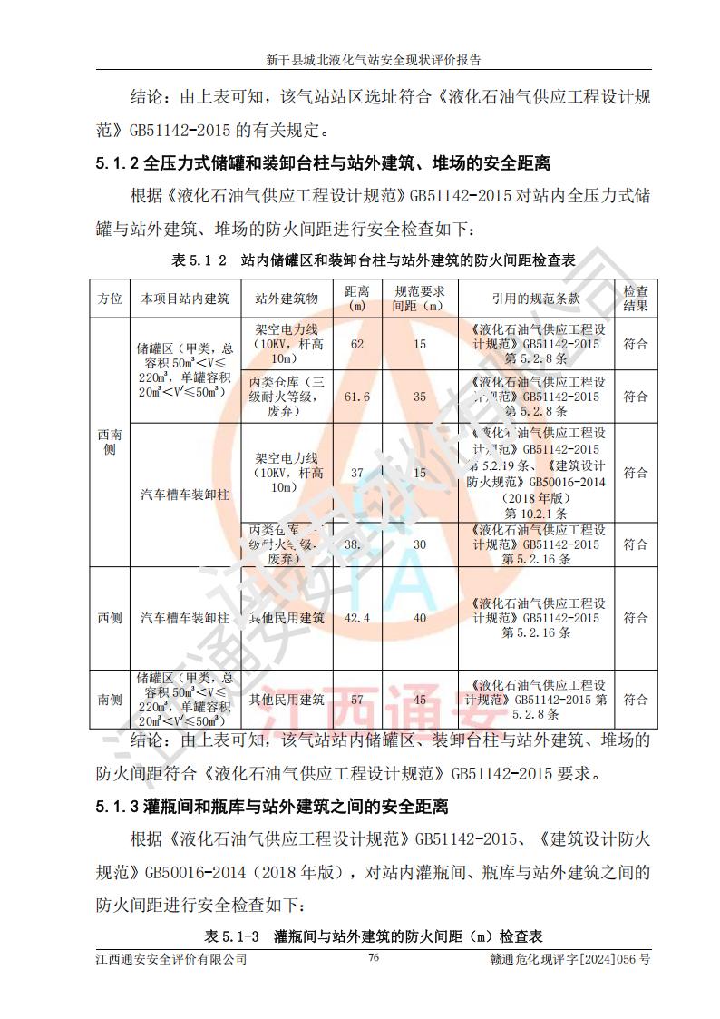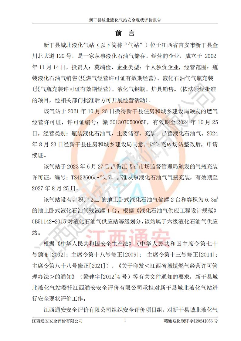 項目簡介 | 新干縣城北液化氣站(以下簡稱“氣站”)位于江西省吉安市新干縣金川北大道120號,是一家從事液化石油氣儲存、經營的企業(yè),成立于 2002年11月14日,投資人:莫端儉,企業(yè)類型:個人獨資企業(yè),經營范圍:瓶裝液化石油氣銷售(憑燃氣經營許可證**期經營)、液化石油氣氣瓶充裝(憑氣瓶充裝許可證**期經營)、液化氣鋼瓶、爐具銷售。(依法須經批準的項目,經相關部門批準后方可開展經營活動)。 該氣站于2021年10月26日換得新干縣住房和城鄉(xiāng)建設局頒發(fā)的燃氣經營許可證,許可證編號:贛201307050005P,**期至2024年10月25日,經營類別:瓶裝液化石油氣,主要儲存、充裝、經營液化石油氣。2024年8月23日經新干縣住房和城鄉(xiāng)建設局同意,該站完成場站整改后,申請續(xù)證。 該氣站于2023年6月27日換得江西省市場監(jiān)督管理局頒發(fā)的氣瓶充裝許可證,編號:TS4236060-2027,獲準從事液化石油氣氣瓶充裝,**期至2027年8月25日。 該氣站設有容積為24m3的地上臥式液化石油氣儲罐2臺和容積為6.3m3的地上臥式液化石油氣殘液罐1臺。根據《液化石油氣供應工程設計規(guī)范》GB51142-2015對液化石油氣供應站等級劃分,該站屬于六級液化石油氣供應站。 | ||||