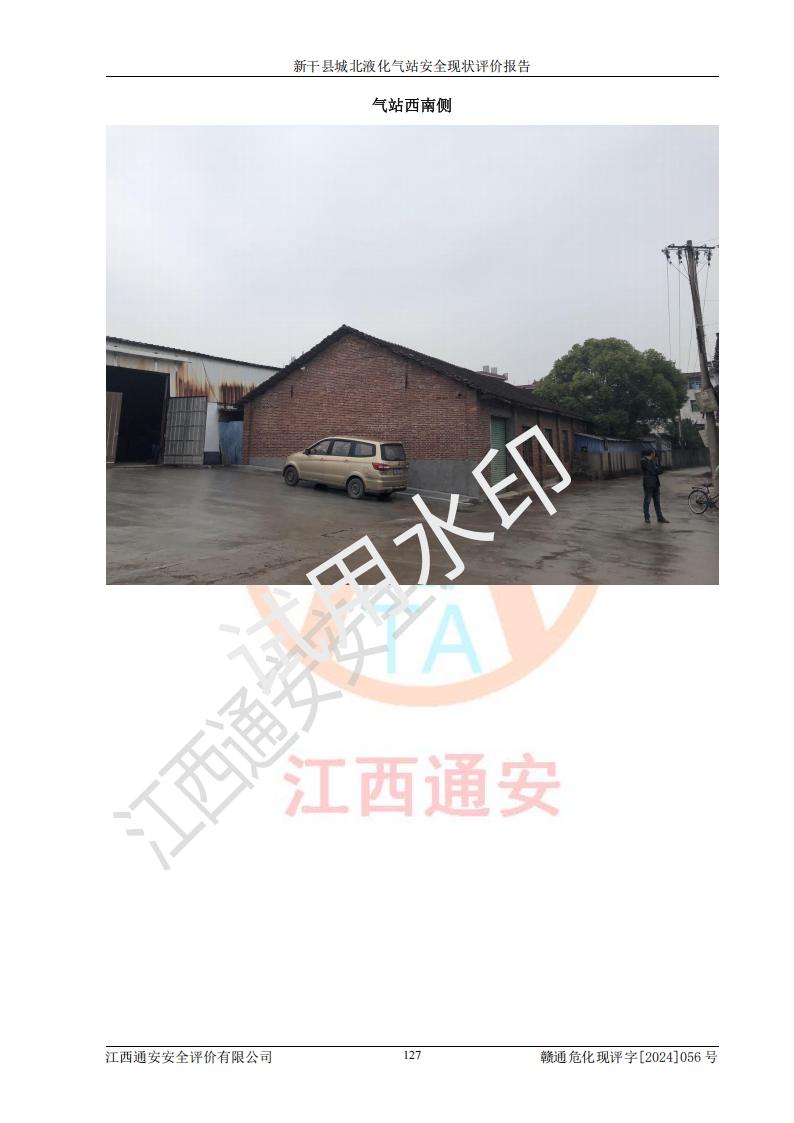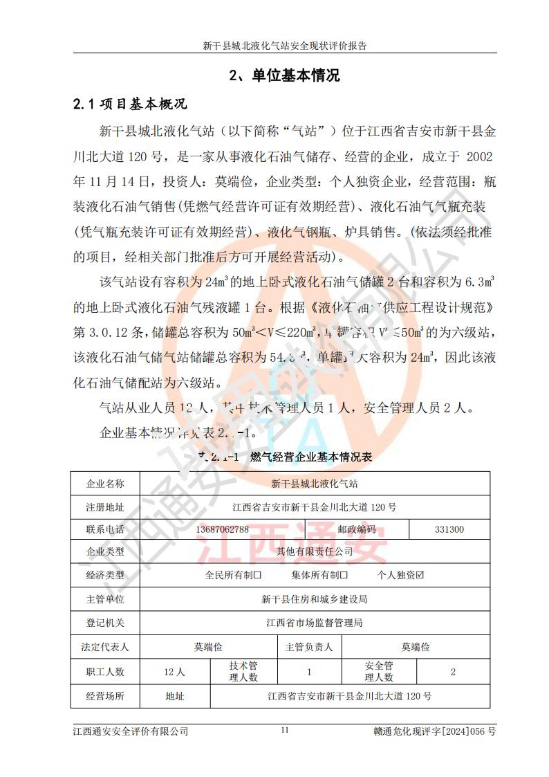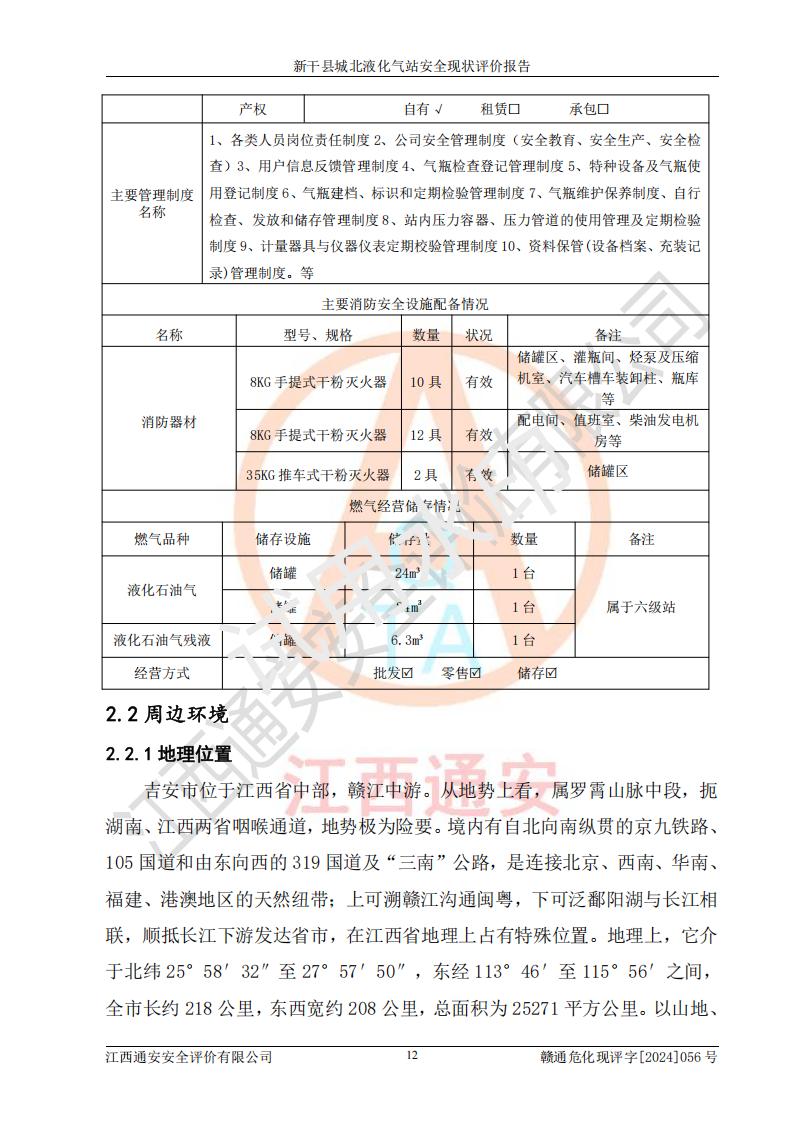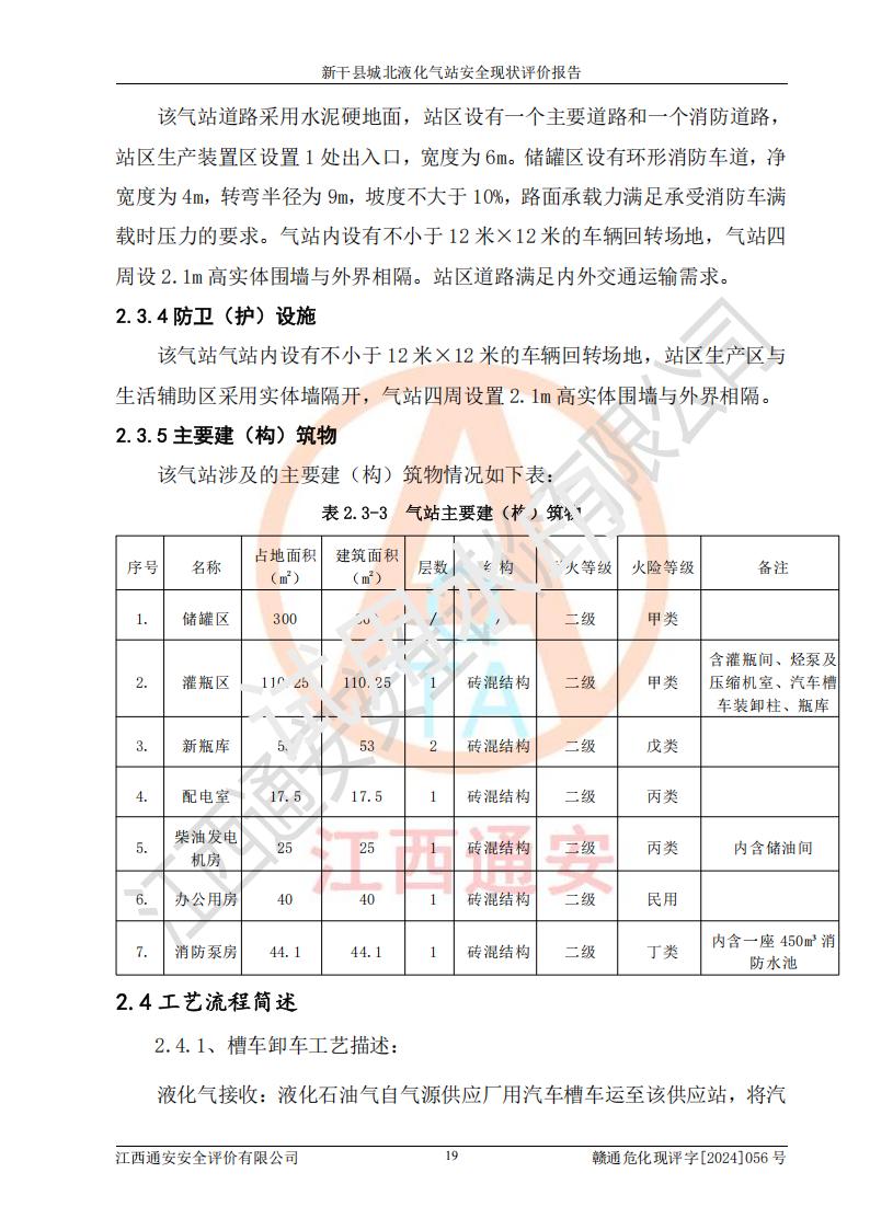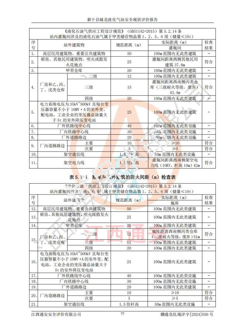 項目簡介 | 新干縣城北液化氣站(以下簡稱“氣站”)位于江西省吉安市新干縣金川北大道120號,是一家從事液化石油氣儲存、經營的企業(yè),成立于 2002年11月14日,投資人:莫端儉,企業(yè)類型:個人獨資企業(yè),經營范圍:瓶裝液化石油氣銷售(憑燃氣經營許可證**期經營)、液化石油氣氣瓶充裝(憑氣瓶充裝許可證**期經營)、液化氣鋼瓶、爐具銷售。(依法須經批準的項目,經相關部門批準后方可開展經營活動)。 該氣站于2021年10月26日換得新干縣住房和城鄉(xiāng)建設局頒發(fā)的燃氣經營許可證,許可證編號:贛201307050005P,**期至2024年10月25日,經營類別:瓶裝液化石油氣,主要儲存、充裝、經營液化石油氣。2024年8月23日經新干縣住房和城鄉(xiāng)建設局同意,該站完成場站整改后,申請續(xù)證。 該氣站于2023年6月27日換得江西省市場監(jiān)督管理局頒發(fā)的氣瓶充裝許可證,編號:TS4236060-2027,獲準從事液化石油氣氣瓶充裝,**期至2027年8月25日。 該氣站設有容積為24m3的地上臥式液化石油氣儲罐2臺和容積為6.3m3的地上臥式液化石油氣殘液罐1臺。根據《液化石油氣供應工程設計規(guī)范》GB51142-2015對液化石油氣供應站等級劃分,該站屬于六級液化石油氣供應站。 | ||||