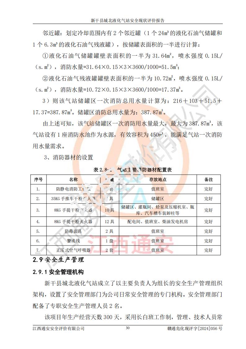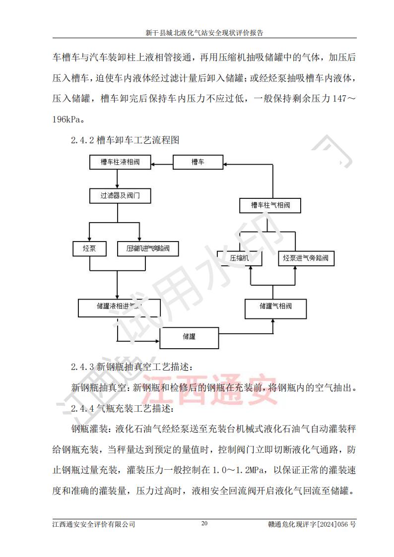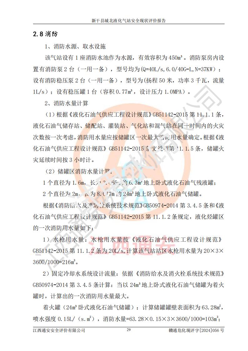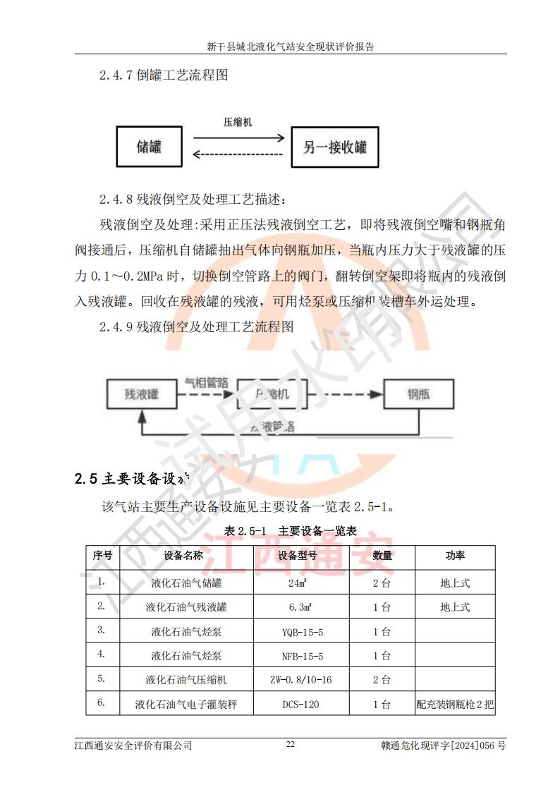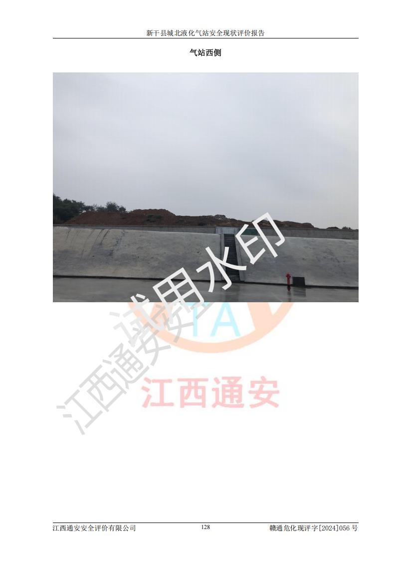 項目簡介 | 新干縣城北液化氣站(以下簡稱“氣站”)位于江西省吉安市新干縣金川北大道120號,是一家從事液化石油氣儲存、經營的企業(yè),成立于 2002年11月14日,投資人:莫端儉,企業(yè)類型:個人獨資企業(yè),經營范圍:瓶裝液化石油氣銷售(憑燃氣經營許可證**期經營)、液化石油氣氣瓶充裝(憑氣瓶充裝許可證**期經營)、液化氣鋼瓶、爐具銷售。(依法須經批準的項目,經相關部門批準后方可開展經營活動)。 該氣站于2021年10月26日換得新干縣住房和城鄉(xiāng)建設局頒發(fā)的燃氣經營許可證,許可證編號:贛201307050005P,**期至2024年10月25日,經營類別:瓶裝液化石油氣,主要儲存、充裝、經營液化石油氣。2024年8月23日經新干縣住房和城鄉(xiāng)建設局同意,該站完成場站整改后,申請續(xù)證。 該氣站于2023年6月27日換得江西省市場監(jiān)督管理局頒發(fā)的氣瓶充裝許可證,編號:TS4236060-2027,獲準從事液化石油氣氣瓶充裝,**期至2027年8月25日。 該氣站設有容積為24m3的地上臥式液化石油氣儲罐2臺和容積為6.3m3的地上臥式液化石油氣殘液罐1臺。根據《液化石油氣供應工程設計規(guī)范》GB51142-2015對液化石油氣供應站等級劃分,該站屬于六級液化石油氣供應站。 | ||||