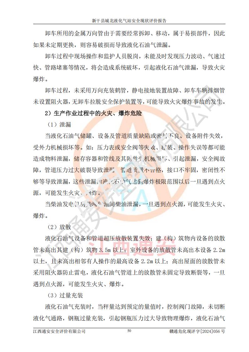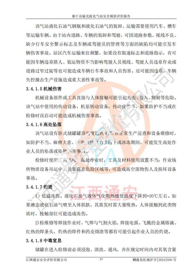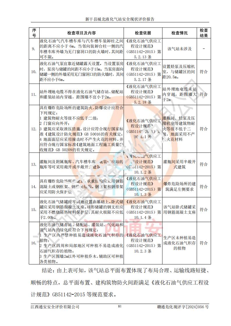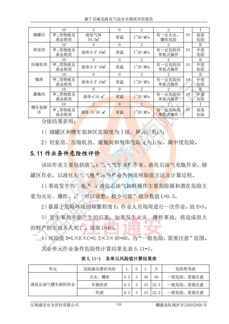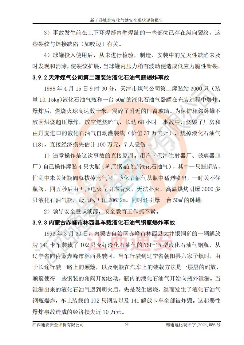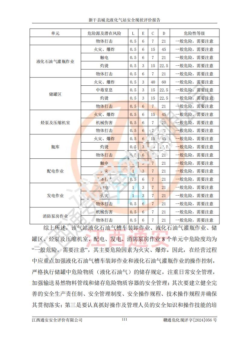 其它 | 在對該項目危險、有害因素辨識分析的基礎上,運用安全檢查表、預作業(yè)條件危險性分析法、危險度評價、重大事故后果分析結果等評價方法對該項目進行了分析評價,評價結果如下: 1、該項目位于江西省吉安市新干縣金川北大道120號,符合當地規(guī)劃,與周邊環(huán)境的距離符合有關標準、規(guī)范的要求。 2、總圖布置分區(qū)明確,布局合理,各建構筑物的防火間距滿足規(guī)范要求。 3、該項目無**明令淘汰的工藝,設備、設施與工藝條件、內部介質相適應,特種設備及設施較齊全,按規(guī)定設置防雷、防靜電接地,爆炸危險環(huán)境加油機按要求采用防爆型,符合相關標準規(guī)范要求。 5、企業(yè)設置了安全生產管理機構,配備了專職安全生產管理人員,建立了安全生產責任制和安全生產管理制度,編制了崗位操作規(guī)程,編制了生產安全事故應急預案,人員經過相應的培訓,企業(yè)的安全生產管理正常。 6、作業(yè)條件危險性評價結果:在選定的評價單元中,作業(yè)危險程度均為“一般危險,需要注意”,作業(yè)條件相對安全。 7、危險度評價結果:儲罐區(qū)和槽車裝卸區(qū)危險度為Ⅰ級,屬**危險;烴泵房、壓縮機房、灌瓶間和瓶庫危險度為Ⅱ級,屬中度危險。 評價結論: 新干縣城北液化氣站的安全設施、公用工程、輔助設施以及安全管理等符合**及有關部門關于安全生產法律、法規(guī)、標準的要求,安全風險是受控制的,其風險程度是可以接受的,符合安全生產條件,能夠滿足安全生產的要求。 | ||||