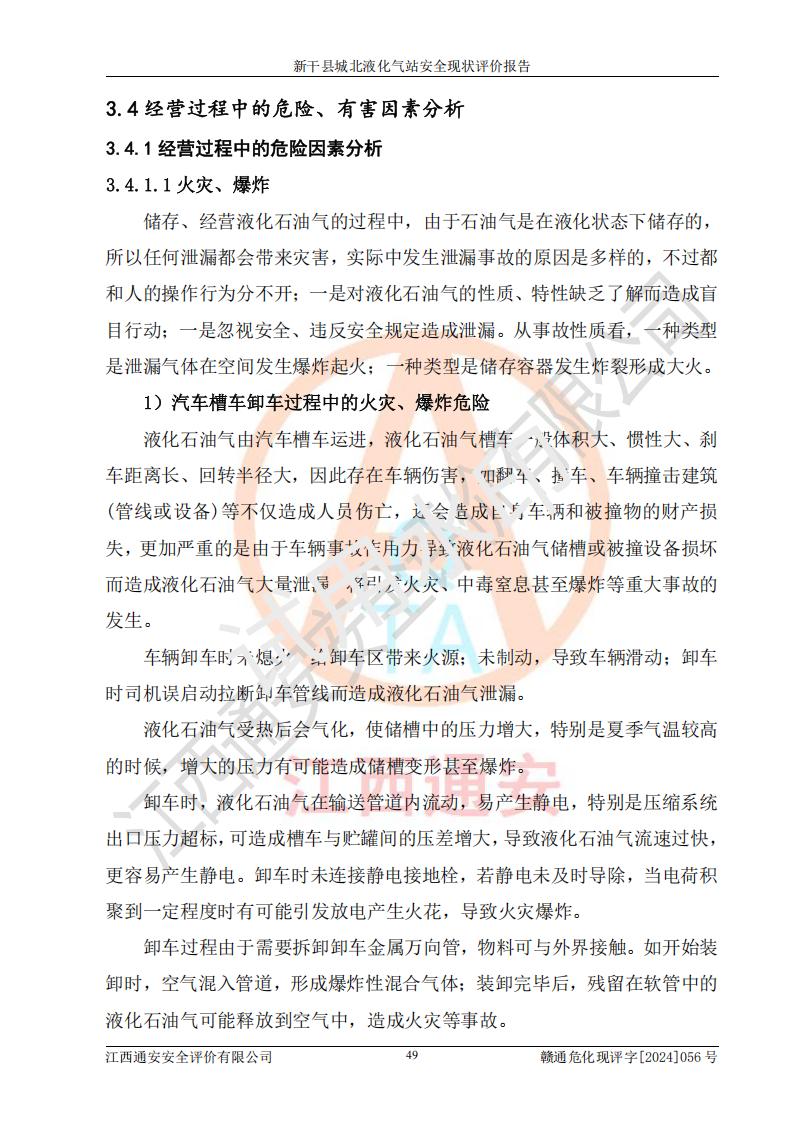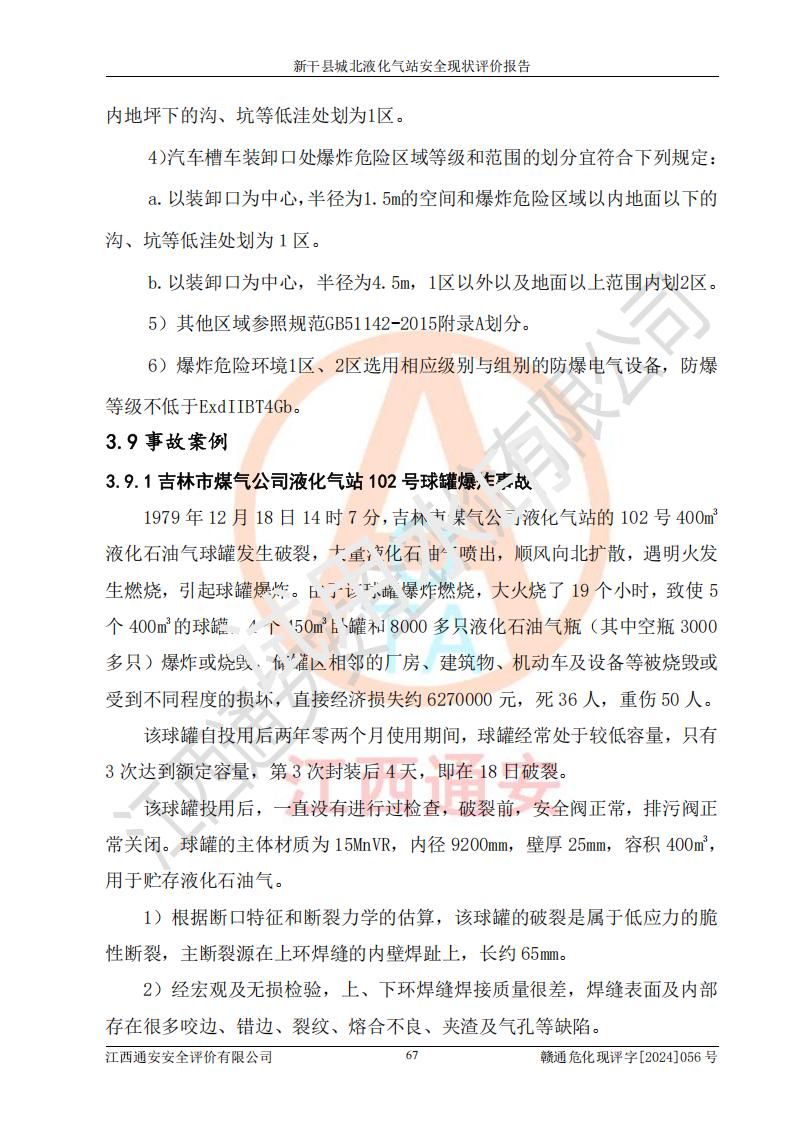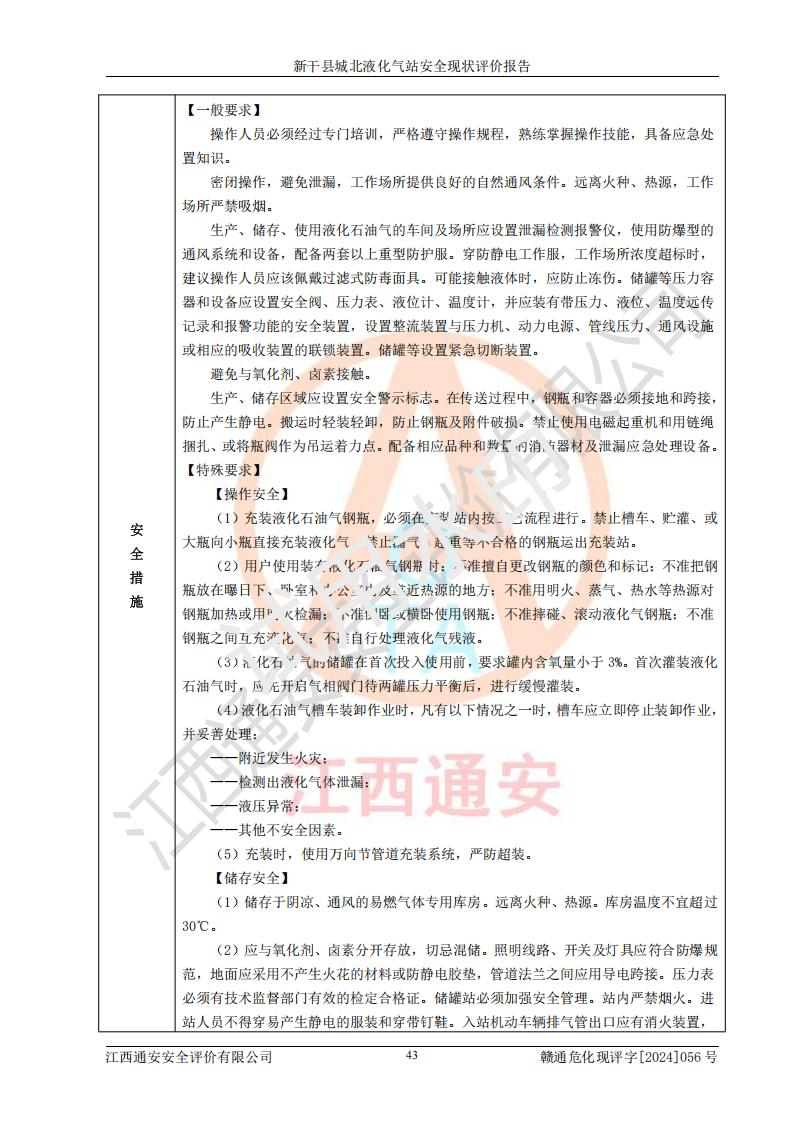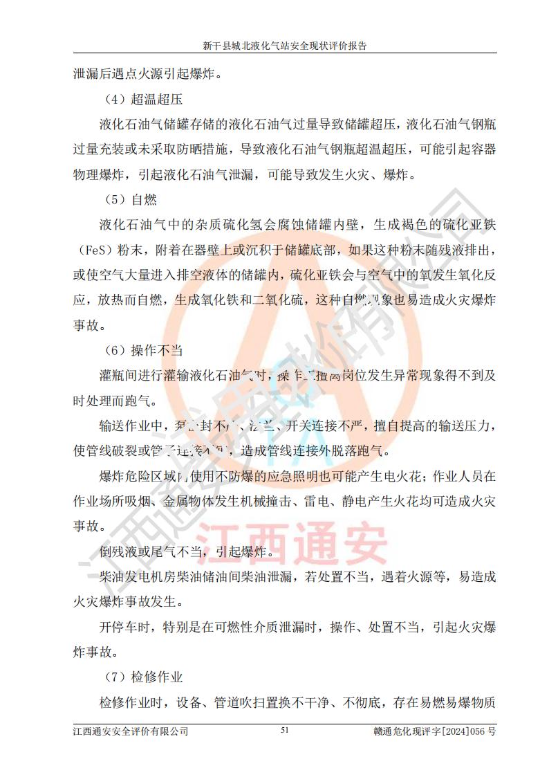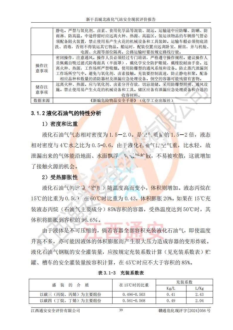 其它 | 在對該項目危險、有害因素辨識分析的基礎上,運用安全檢查表、預作業(yè)條件危險性分析法、危險度評價、重大事故后果分析結果等評價方法對該項目進行了分析評價,評價結果如下: 1、該項目位于江西省吉安市新干縣金川北大道120號,符合當地規(guī)劃,與周邊環(huán)境的距離符合有關標準、規(guī)范的要求。 2、總圖布置分區(qū)明確,布局合理,各建構筑物的防火間距滿足規(guī)范要求。 3、該項目無**明令淘汰的工藝,設備、設施與工藝條件、內部介質相適應,特種設備及設施較齊全,按規(guī)定設置防雷、防靜電接地,爆炸危險環(huán)境加油機按要求采用防爆型,符合相關標準規(guī)范要求。 5、企業(yè)設置了安全生產管理機構,配備了專職安全生產管理人員,建立了安全生產責任制和安全生產管理制度,編制了崗位操作規(guī)程,編制了生產安全事故應急預案,人員經過相應的培訓,企業(yè)的安全生產管理正常。 6、作業(yè)條件危險性評價結果:在選定的評價單元中,作業(yè)危險程度均為“一般危險,需要注意”,作業(yè)條件相對安全。 7、危險度評價結果:儲罐區(qū)和槽車裝卸區(qū)危險度為Ⅰ級,屬**危險;烴泵房、壓縮機房、灌瓶間和瓶庫危險度為Ⅱ級,屬中度危險。 評價結論: 新干縣城北液化氣站的安全設施、公用工程、輔助設施以及安全管理等符合**及有關部門關于安全生產法律、法規(guī)、標準的要求,安全風險是受控制的,其風險程度是可以接受的,符合安全生產條件,能夠滿足安全生產的要求。 | ||||