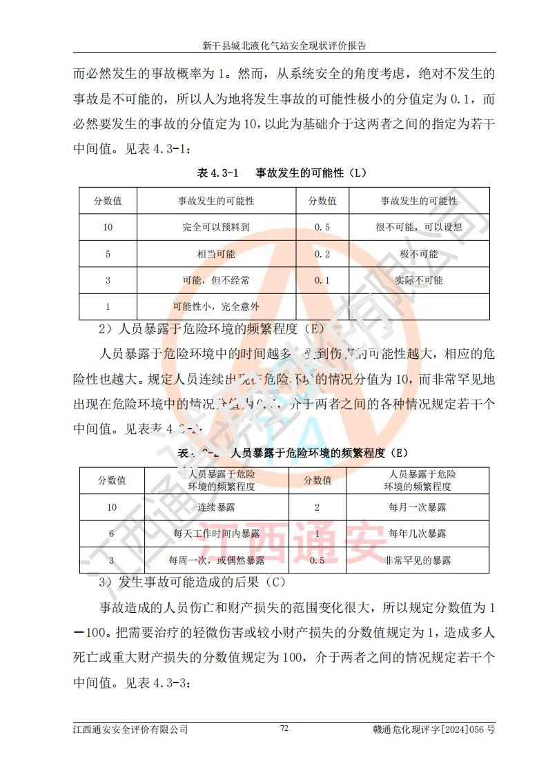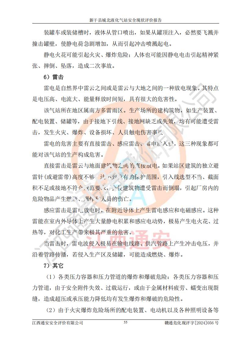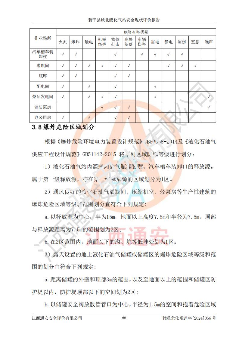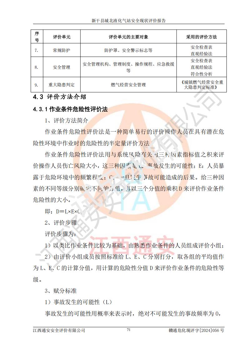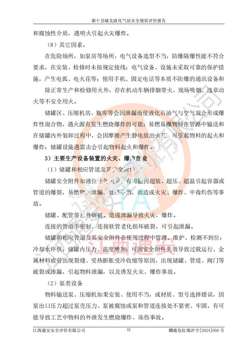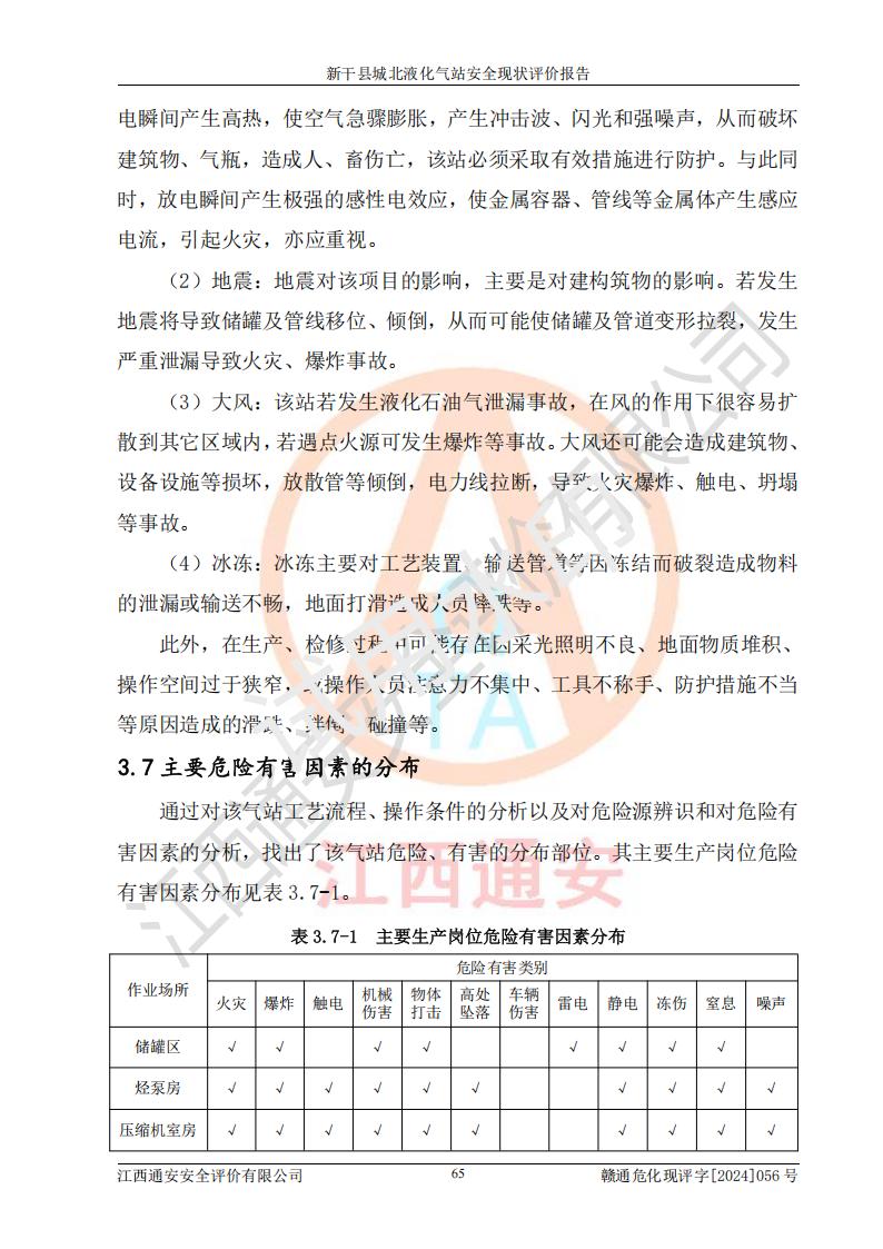其它 | 在對該項目危險、有害因素辨識分析的基礎上,運用安全檢查表、預作業(yè)條件危險性分析法、危險度評價、重大事故后果分析結果等評價方法對該項目進行了分析評價,評價結果如下: 1、該項目位于江西省吉安市新干縣金川北大道120號,符合當地規(guī)劃,與周邊環(huán)境的距離符合有關標準、規(guī)范的要求。 2、總圖布置分區(qū)明確,布局合理,各建構筑物的防火間距滿足規(guī)范要求。 3、該項目無**明令淘汰的工藝,設備、設施與工藝條件、內部介質相適應,特種設備及設施較齊全,按規(guī)定設置防雷、防靜電接地,爆炸危險環(huán)境加油機按要求采用防爆型,符合相關標準規(guī)范要求。 5、企業(yè)設置了安全生產管理機構,配備了專職安全生產管理人員,建立了安全生產責任制和安全生產管理制度,編制了崗位操作規(guī)程,編制了生產安全事故應急預案,人員經過相應的培訓,企業(yè)的安全生產管理正常。 6、作業(yè)條件危險性評價結果:在選定的評價單元中,作業(yè)危險程度均為“一般危險,需要注意”,作業(yè)條件相對安全。 7、危險度評價結果:儲罐區(qū)和槽車裝卸區(qū)危險度為Ⅰ級,屬**危險;烴泵房、壓縮機房、灌瓶間和瓶庫危險度為Ⅱ級,屬中度危險。 評價結論: 新干縣城北液化氣站的安全設施、公用工程、輔助設施以及安全管理等符合**及有關部門關于安全生產法律、法規(guī)、標準的要求,安全風險是受控制的,其風險程度是可以接受的,符合安全生產條件,能夠滿足安全生產的要求。 | ||||