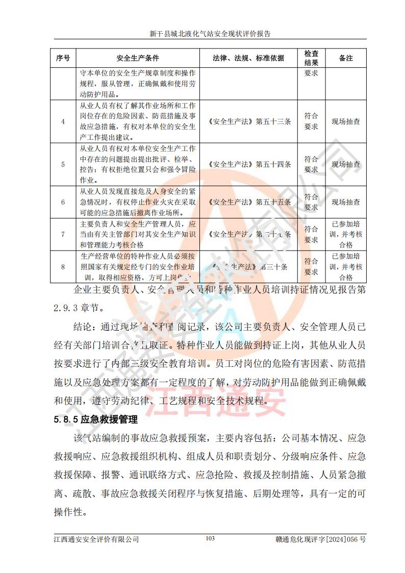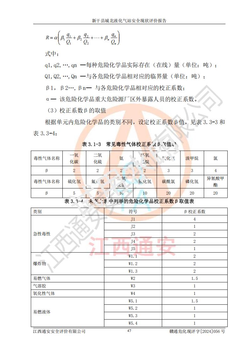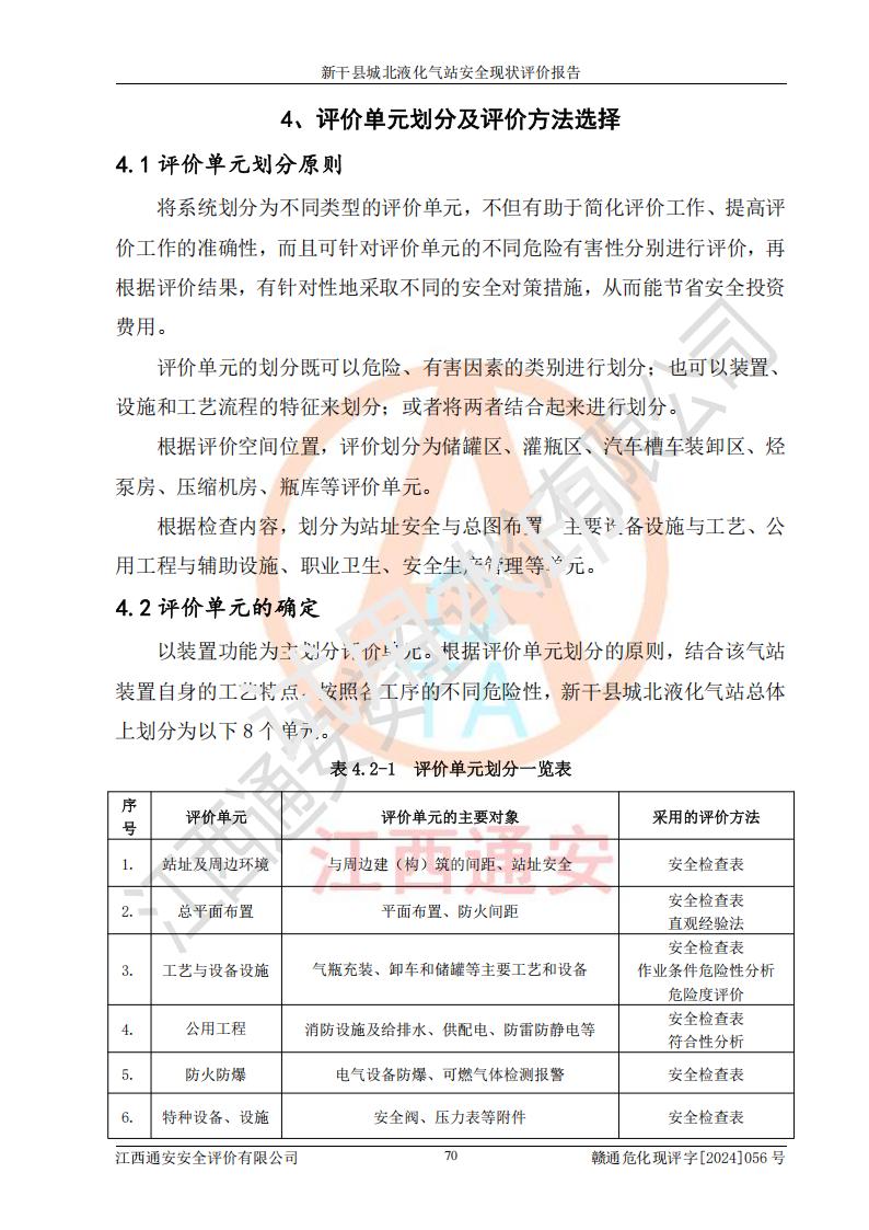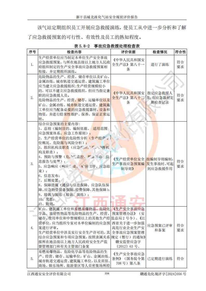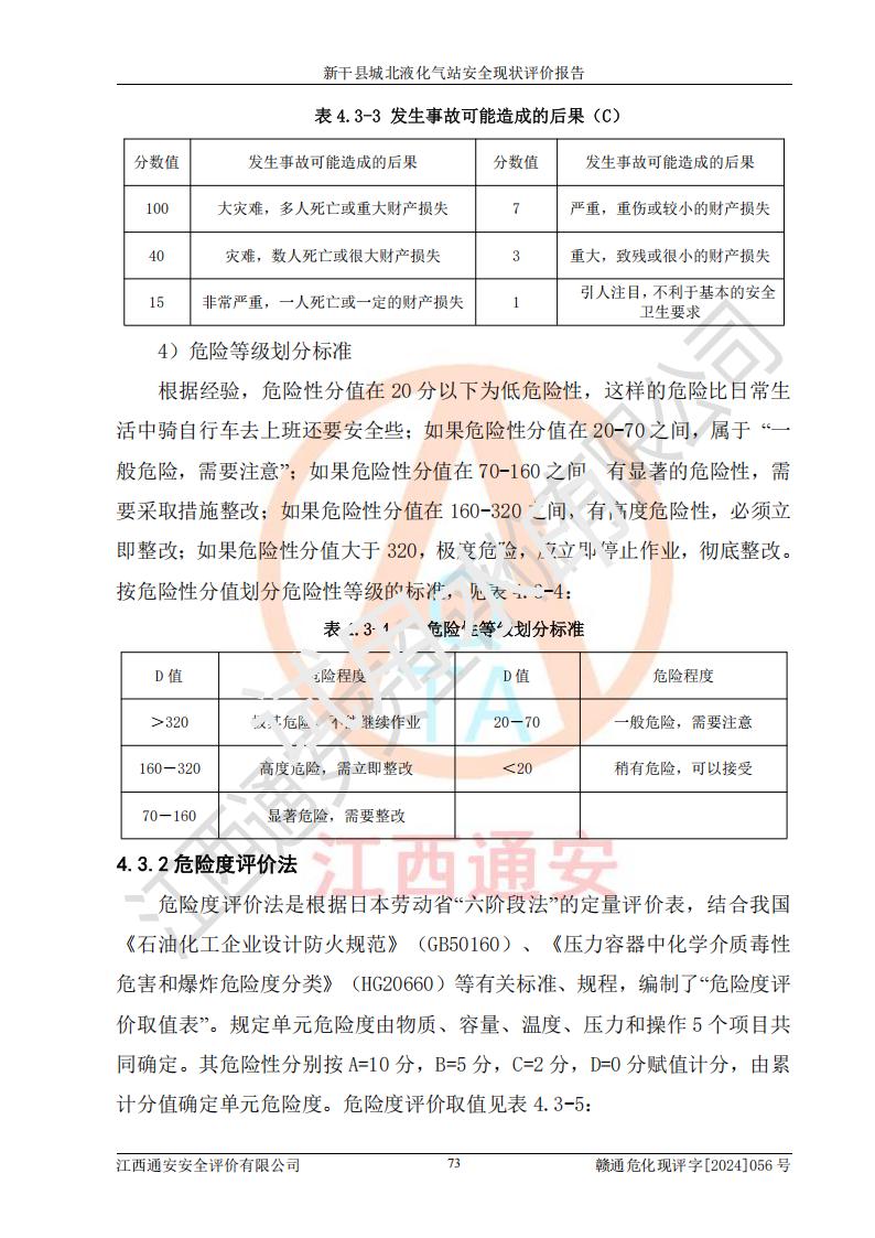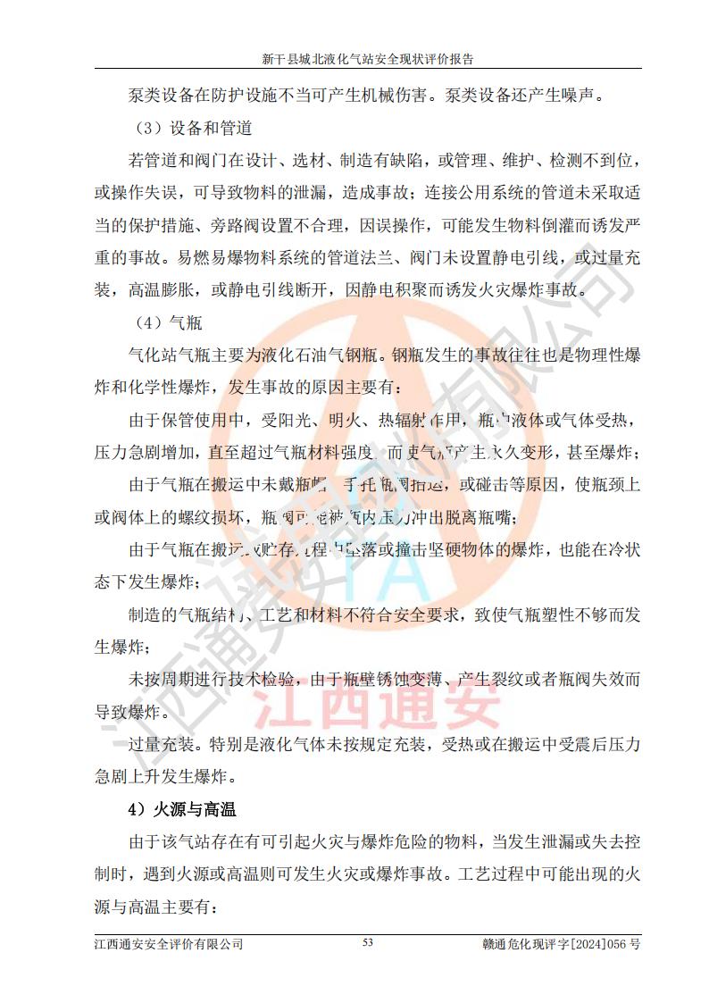 其它 | 在對該項目危險、有害因素辨識分析的基礎上,運用安全檢查表、預作業(yè)條件危險性分析法、危險度評價、重大事故后果分析結果等評價方法對該項目進行了分析評價,評價結果如下: 1、該項目位于江西省吉安市新干縣金川北大道120號,符合當地規(guī)劃,與周邊環(huán)境的距離符合有關標準、規(guī)范的要求。 2、總圖布置分區(qū)明確,布局合理,各建構筑物的防火間距滿足規(guī)范要求。 3、該項目無**明令淘汰的工藝,設備、設施與工藝條件、內部介質相適應,特種設備及設施較齊全,按規(guī)定設置防雷、防靜電接地,爆炸危險環(huán)境加油機按要求采用防爆型,符合相關標準規(guī)范要求。 5、企業(yè)設置了安全生產管理機構,配備了專職安全生產管理人員,建立了安全生產責任制和安全生產管理制度,編制了崗位操作規(guī)程,編制了生產安全事故應急預案,人員經過相應的培訓,企業(yè)的安全生產管理正常。 6、作業(yè)條件危險性評價結果:在選定的評價單元中,作業(yè)危險程度均為“一般危險,需要注意”,作業(yè)條件相對安全。 7、危險度評價結果:儲罐區(qū)和槽車裝卸區(qū)危險度為Ⅰ級,屬**危險;烴泵房、壓縮機房、灌瓶間和瓶庫危險度為Ⅱ級,屬中度危險。 評價結論: 新干縣城北液化氣站的安全設施、公用工程、輔助設施以及安全管理等符合**及有關部門關于安全生產法律、法規(guī)、標準的要求,安全風險是受控制的,其風險程度是可以接受的,符合安全生產條件,能夠滿足安全生產的要求。 | ||||