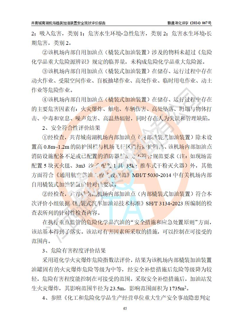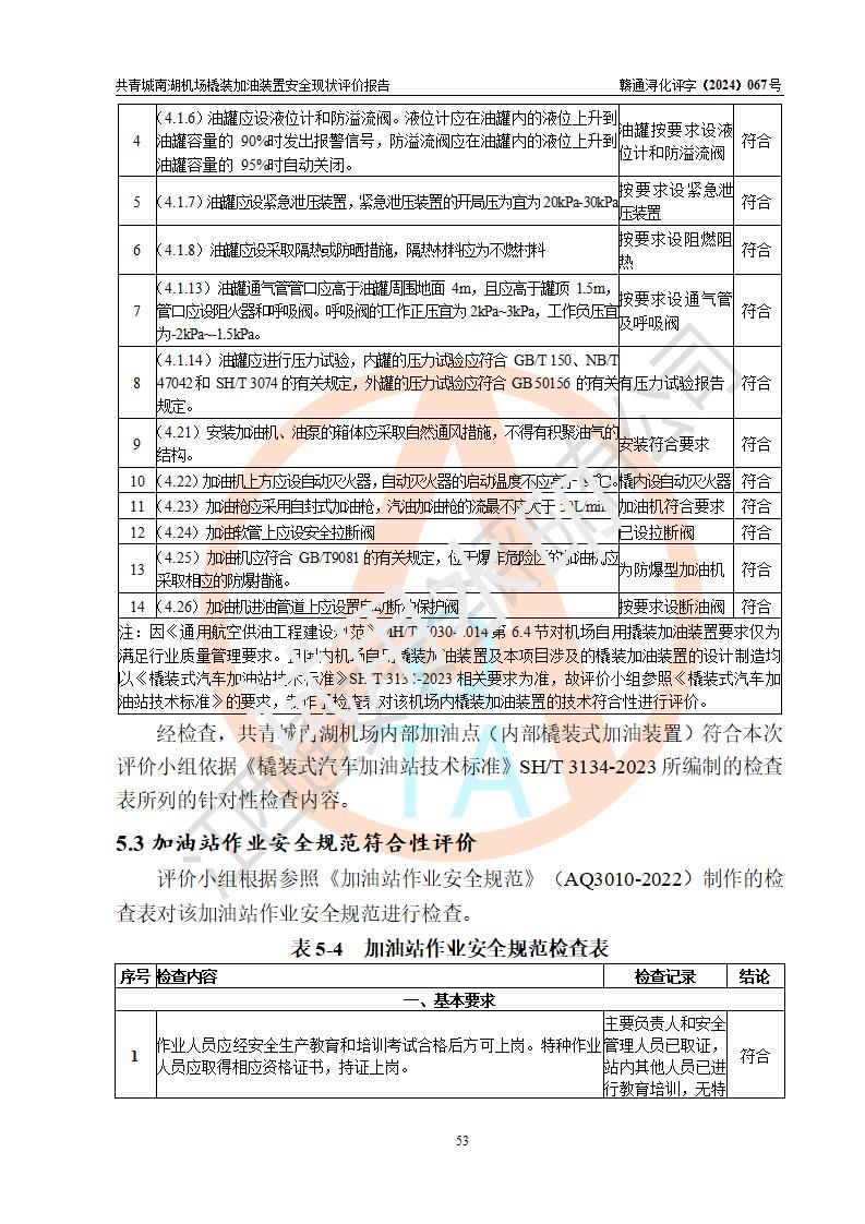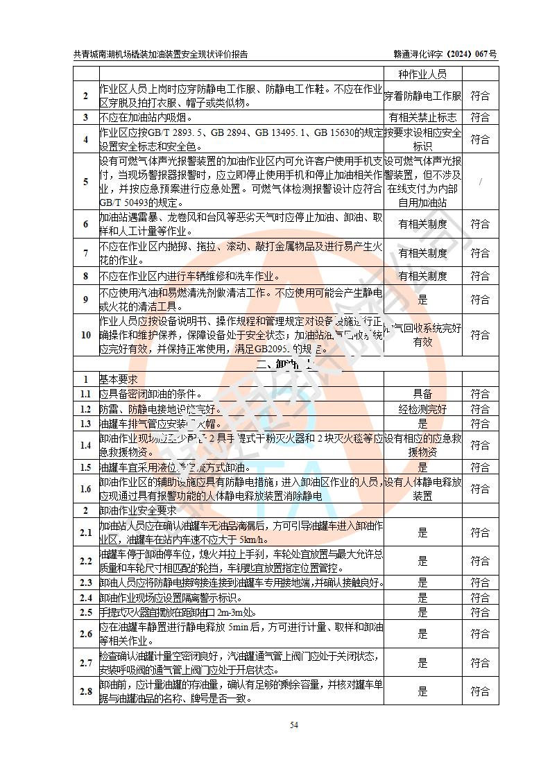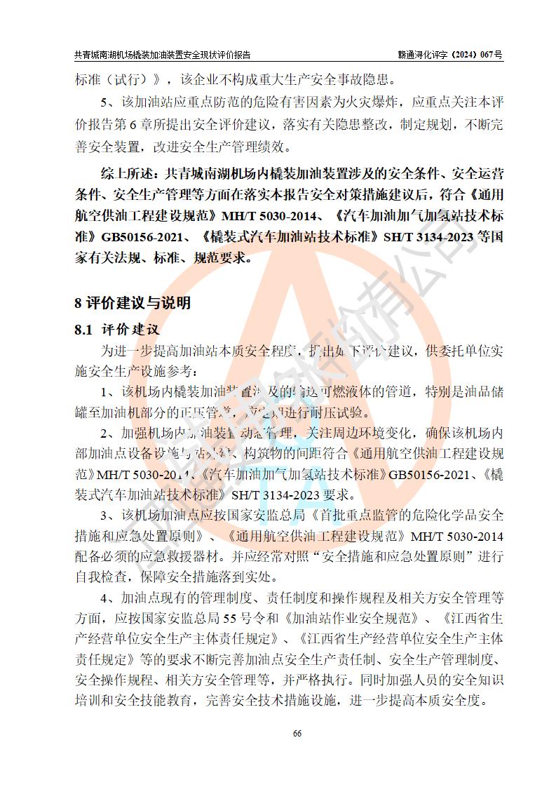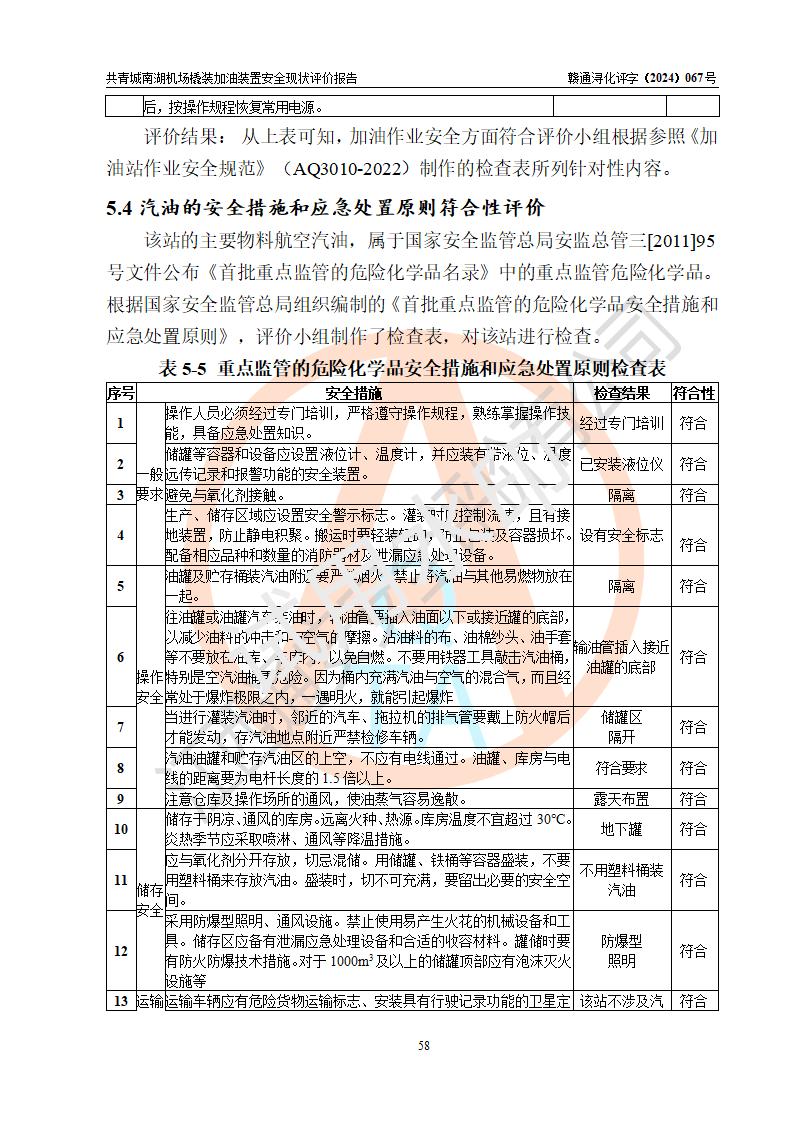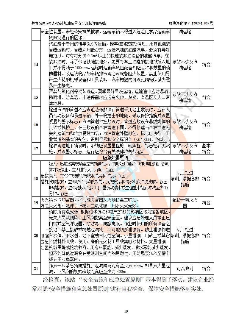 評價結(jié)論 | 九共青城南湖機(jī)場內(nèi)橇裝加油裝置涉及的安全條件、安全運營條件、安全生產(chǎn)管理等方面在落實本報告安全對策措施建議后,符合《通用航空供油工程建設(shè)規(guī)范》MH/T 5030-2014、《汽車加油加氣加氫站技術(shù)標(biāo)準(zhǔn)》GB50156-2021、《橇裝式汽車加油站技術(shù)標(biāo)準(zhǔn)》SH/T 3134-2023等**有關(guān)法規(guī)、標(biāo)準(zhǔn)、規(guī)范要求。 | |||