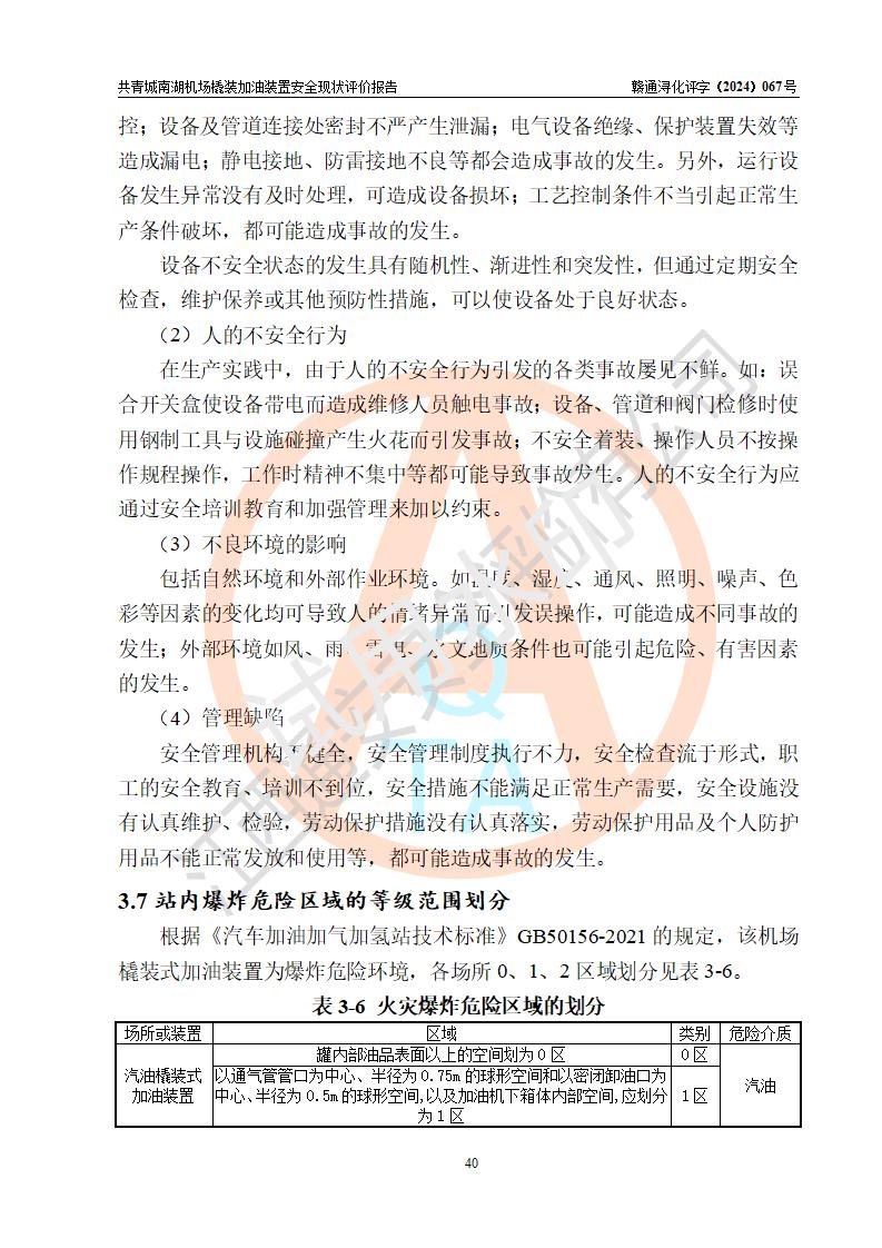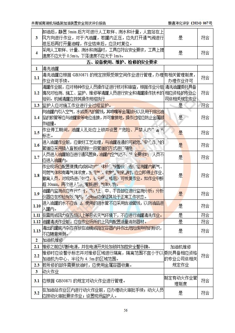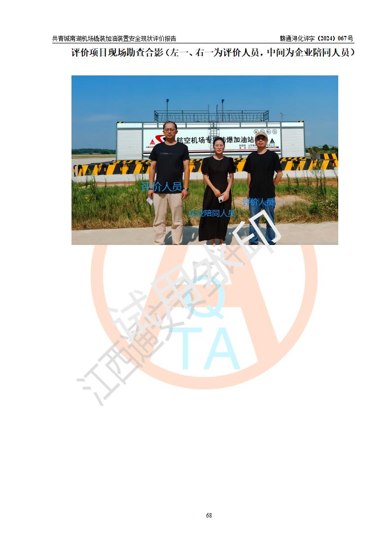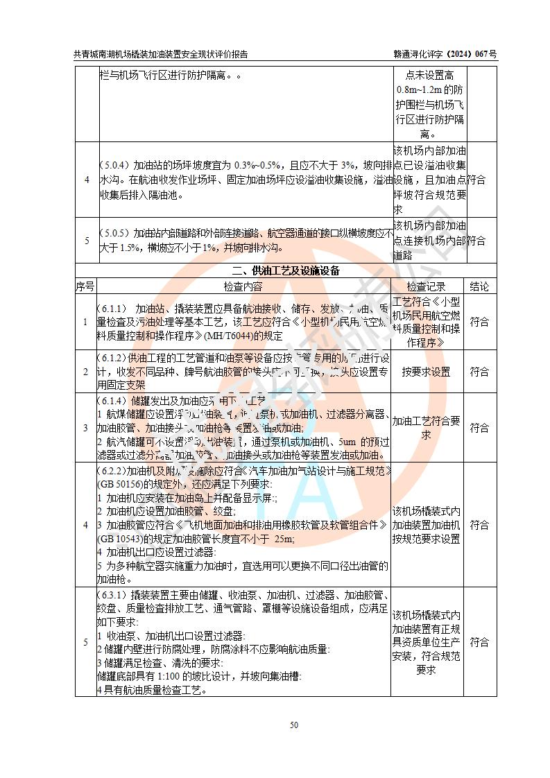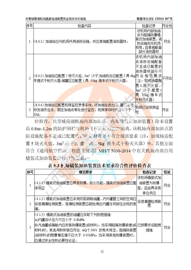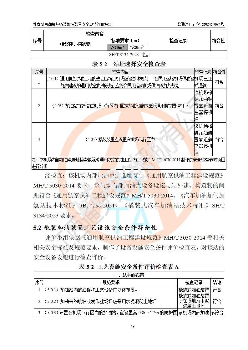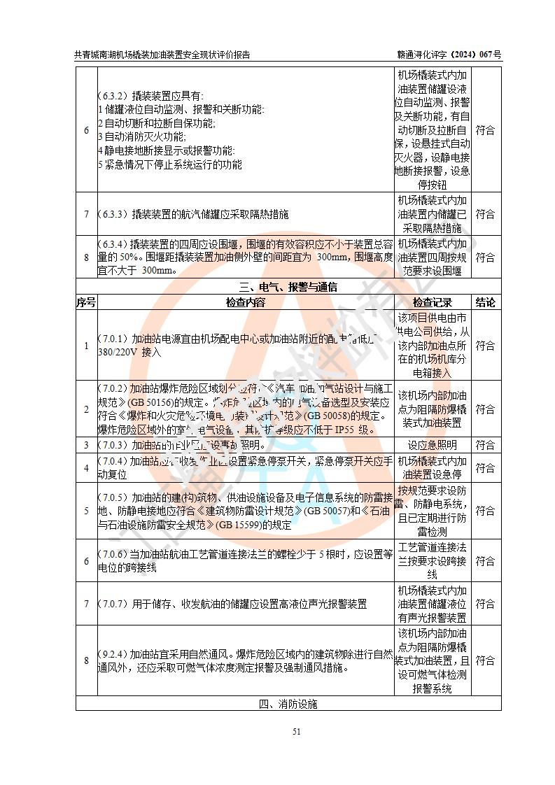 評價結(jié)論 | 九共青城南湖機(jī)場內(nèi)橇裝加油裝置涉及的安全條件、安全運營條件、安全生產(chǎn)管理等方面在落實本報告安全對策措施建議后,符合《通用航空供油工程建設(shè)規(guī)范》MH/T 5030-2014、《汽車加油加氣加氫站技術(shù)標(biāo)準(zhǔn)》GB50156-2021、《橇裝式汽車加油站技術(shù)標(biāo)準(zhǔn)》SH/T 3134-2023等**有關(guān)法規(guī)、標(biāo)準(zhǔn)、規(guī)范要求。 | |||