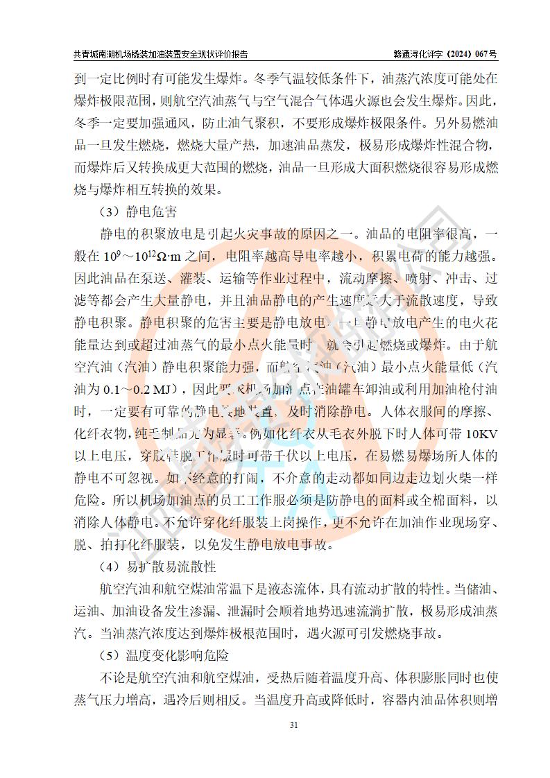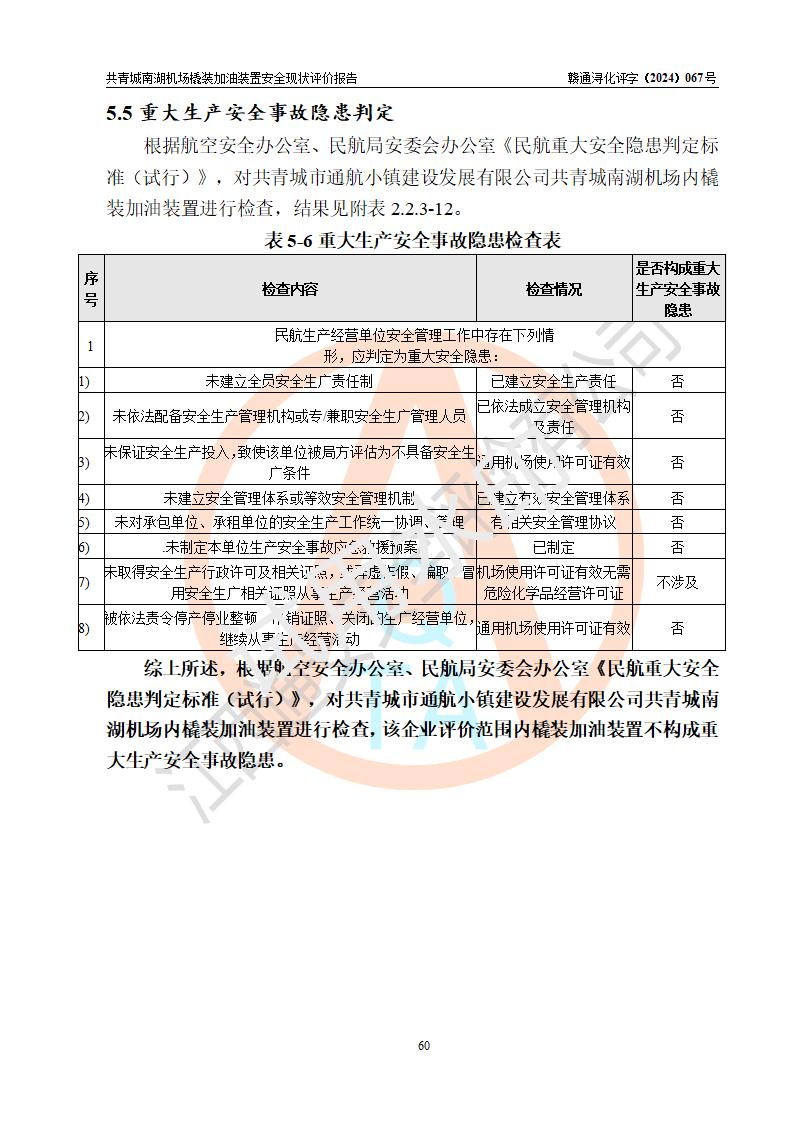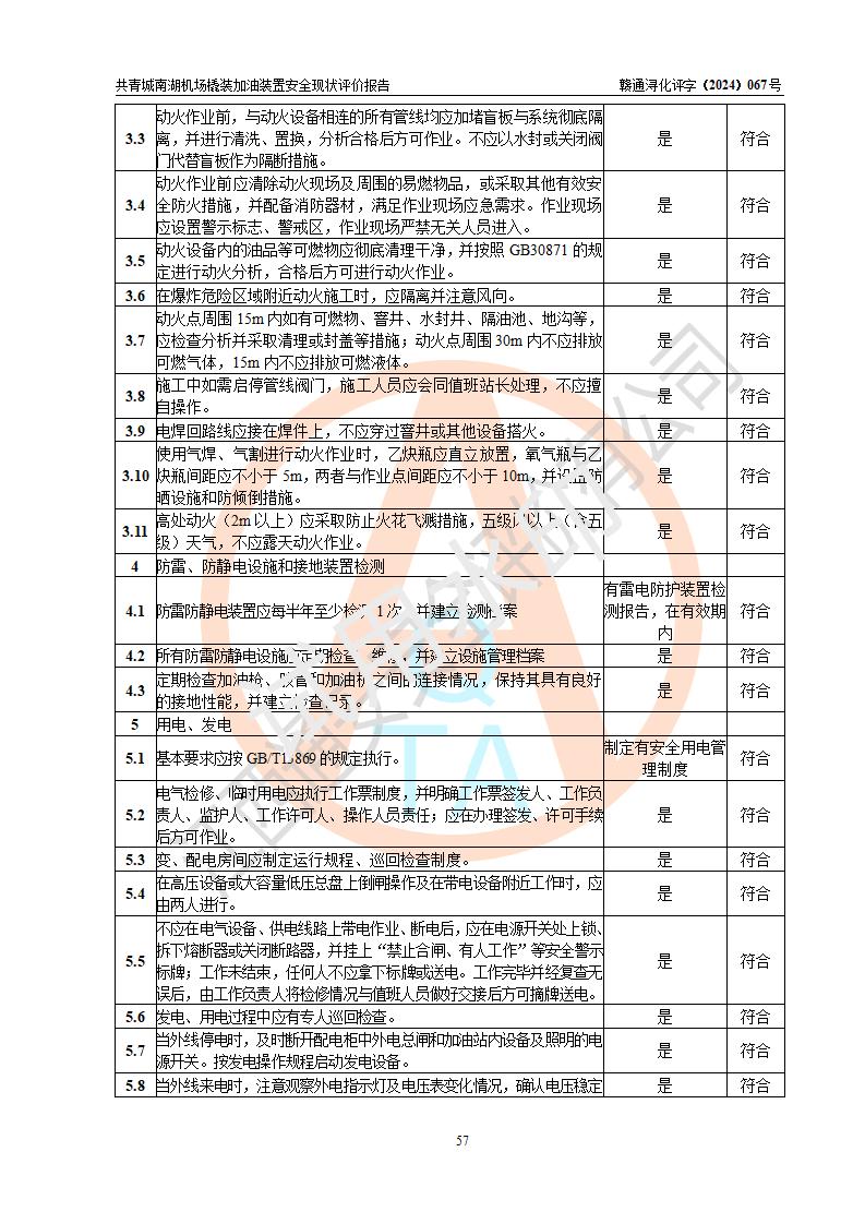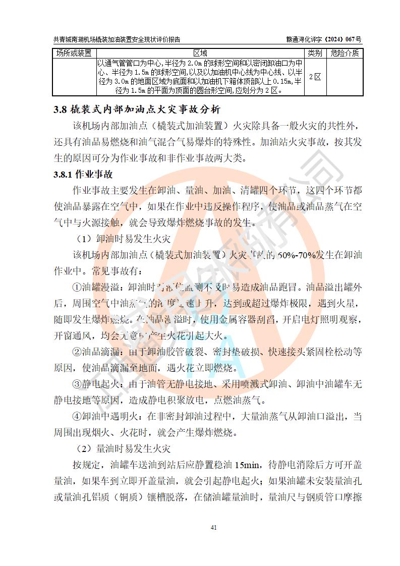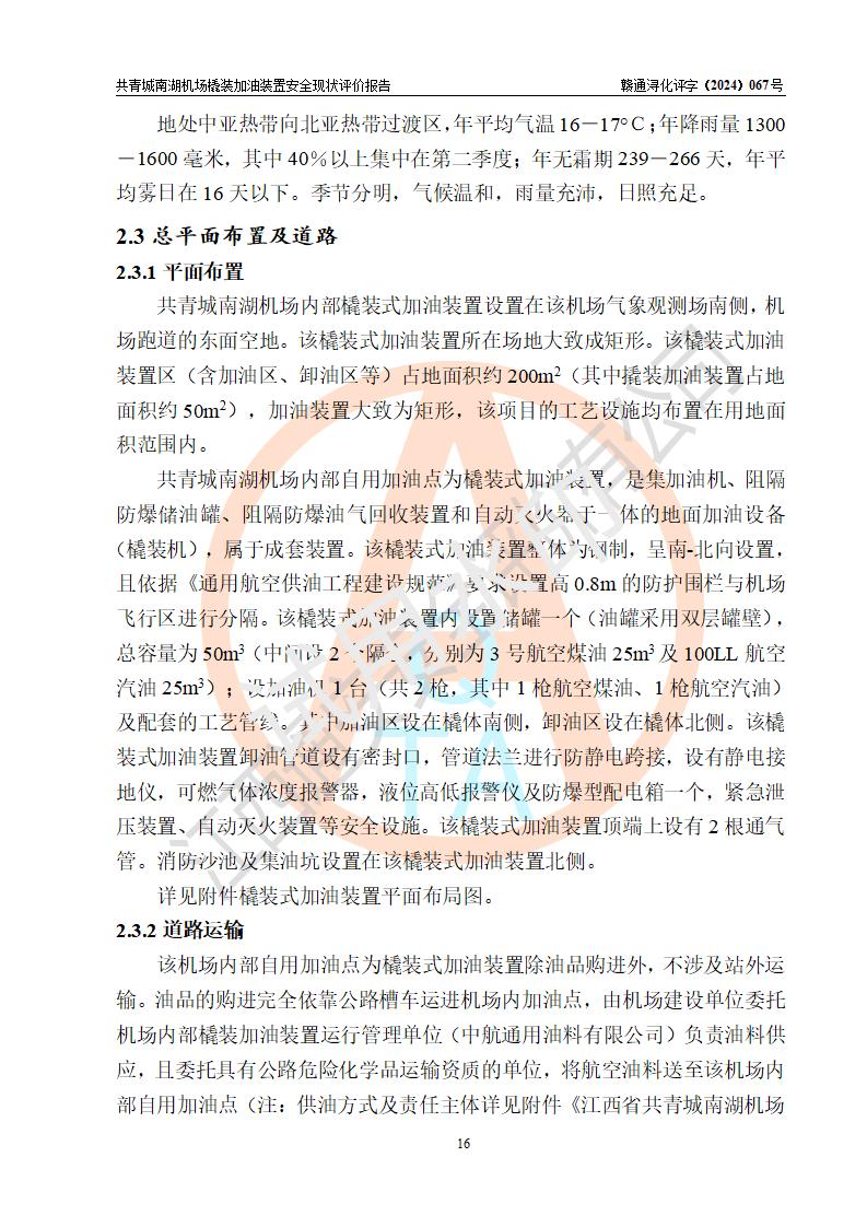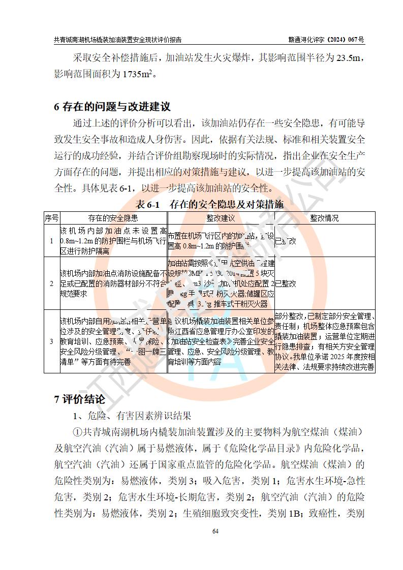 評價結(jié)論 | 九共青城南湖機(jī)場內(nèi)橇裝加油裝置涉及的安全條件、安全運營條件、安全生產(chǎn)管理等方面在落實本報告安全對策措施建議后,符合《通用航空供油工程建設(shè)規(guī)范》MH/T 5030-2014、《汽車加油加氣加氫站技術(shù)標(biāo)準(zhǔn)》GB50156-2021、《橇裝式汽車加油站技術(shù)標(biāo)準(zhǔn)》SH/T 3134-2023等**有關(guān)法規(guī)、標(biāo)準(zhǔn)、規(guī)范要求。 | |||