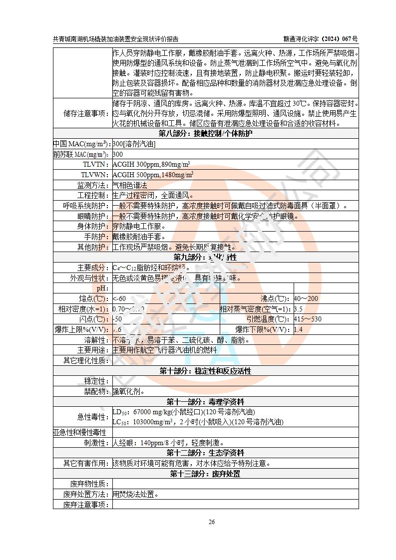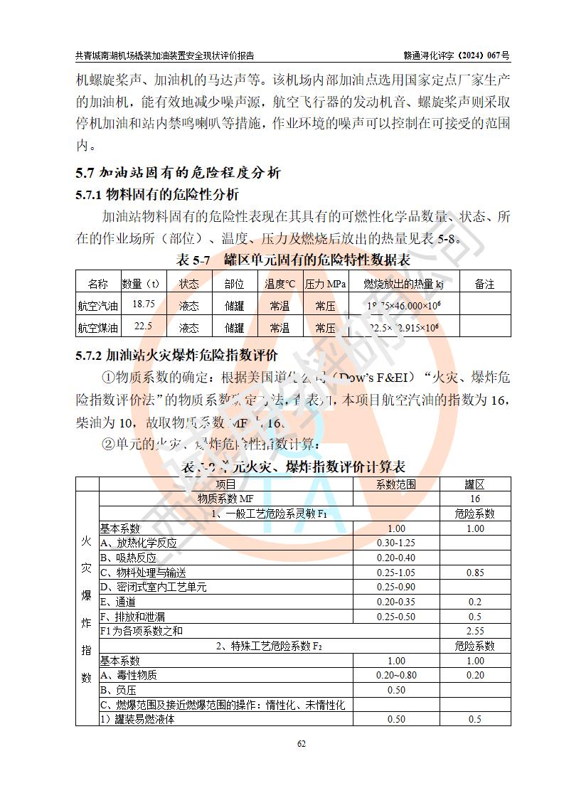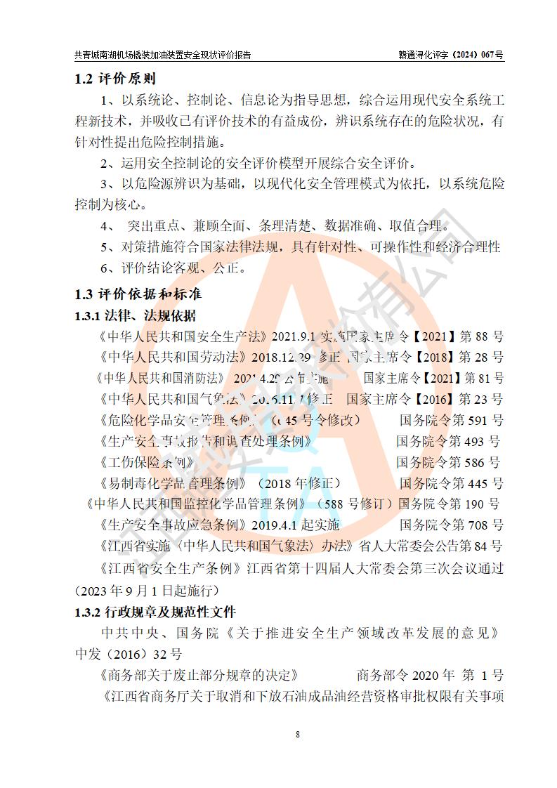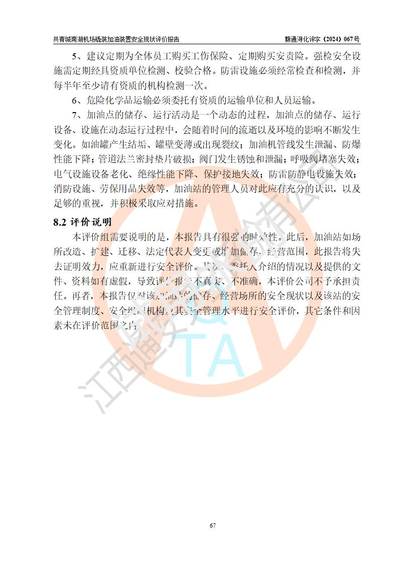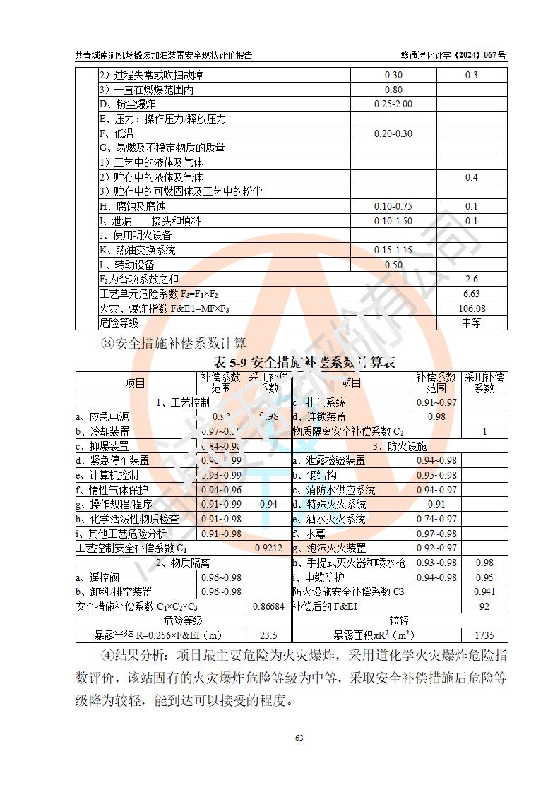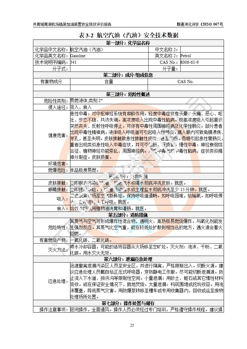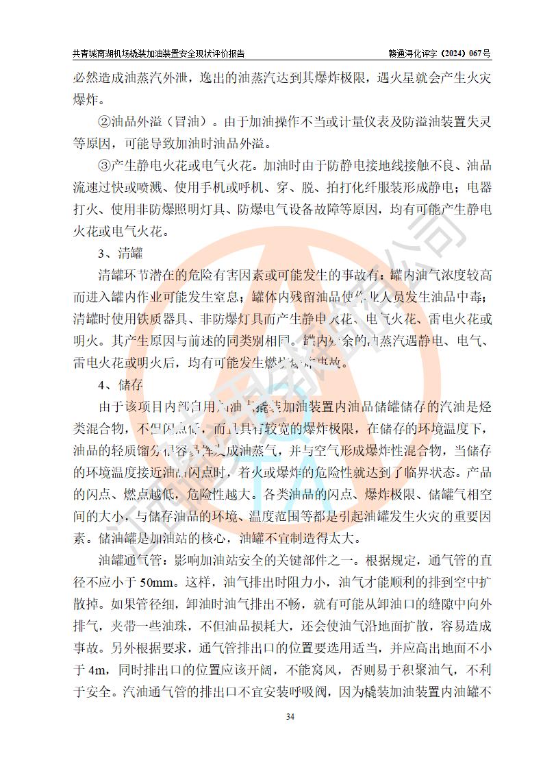 評價結(jié)論 | 九共青城南湖機(jī)場內(nèi)橇裝加油裝置涉及的安全條件、安全運營條件、安全生產(chǎn)管理等方面在落實本報告安全對策措施建議后,符合《通用航空供油工程建設(shè)規(guī)范》MH/T 5030-2014、《汽車加油加氣加氫站技術(shù)標(biāo)準(zhǔn)》GB50156-2021、《橇裝式汽車加油站技術(shù)標(biāo)準(zhǔn)》SH/T 3134-2023等**有關(guān)法規(guī)、標(biāo)準(zhǔn)、規(guī)范要求。 | |||