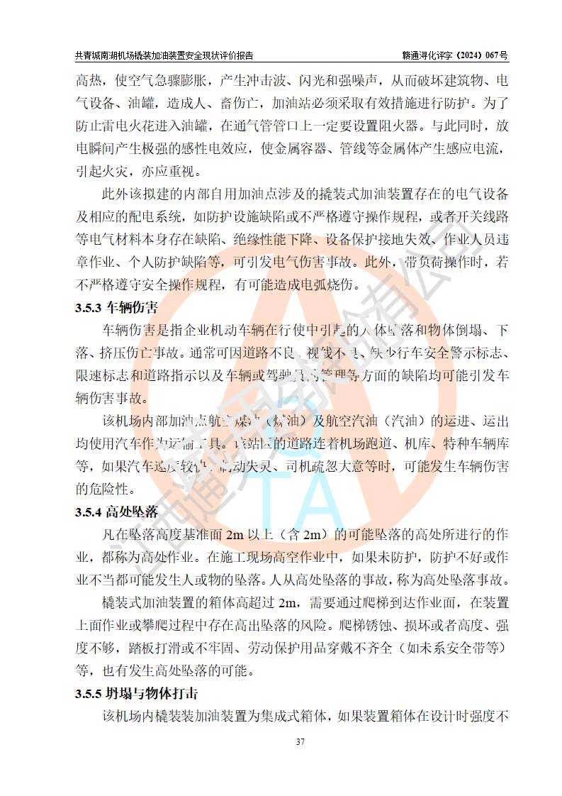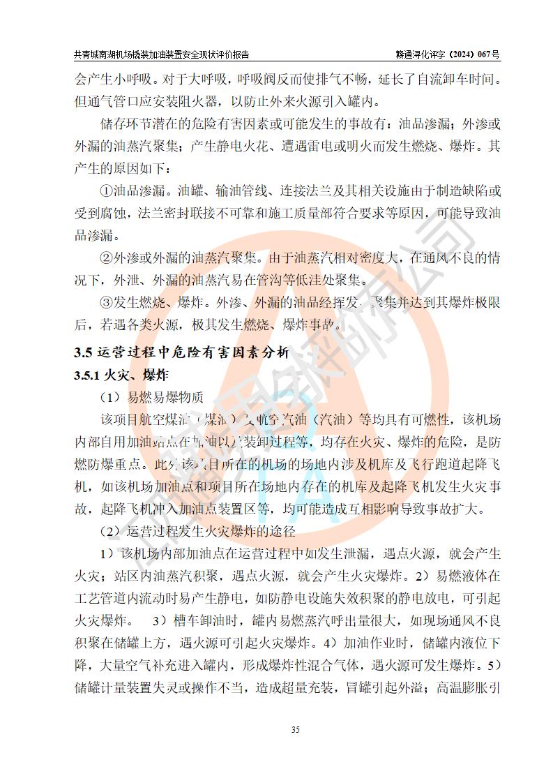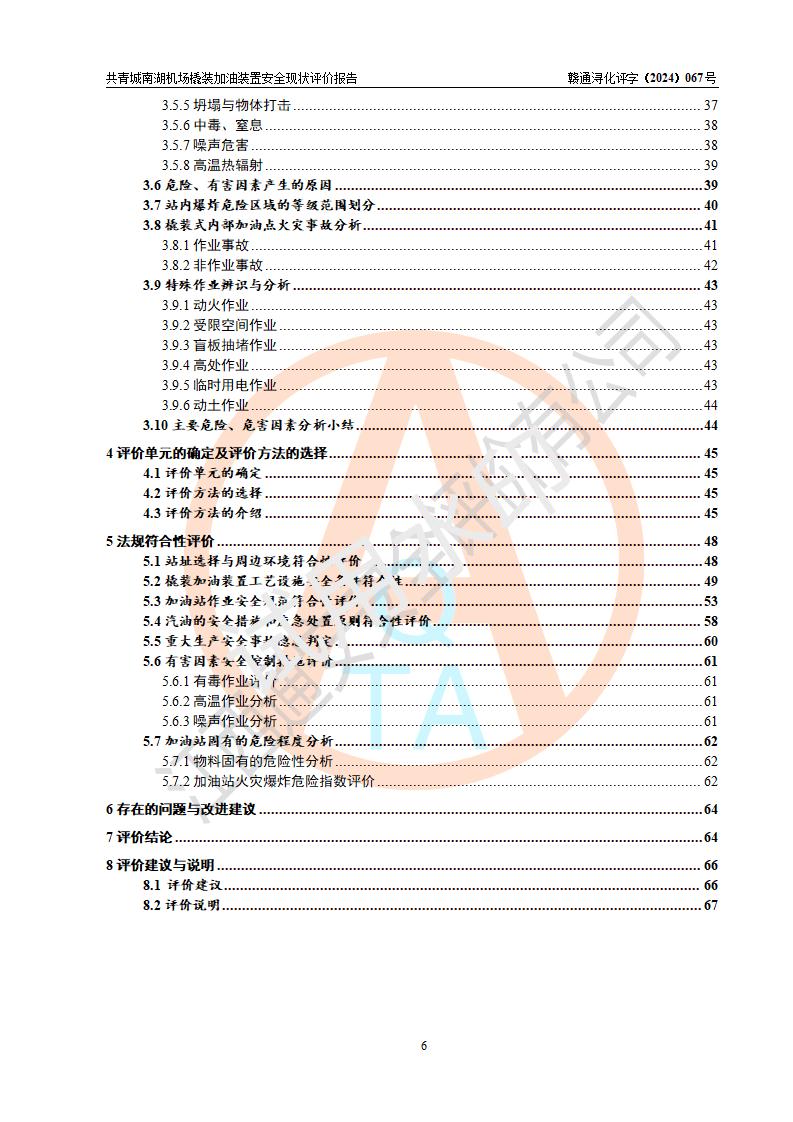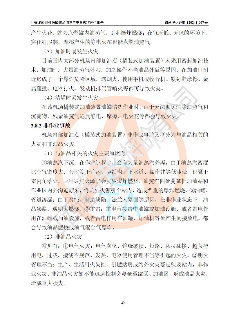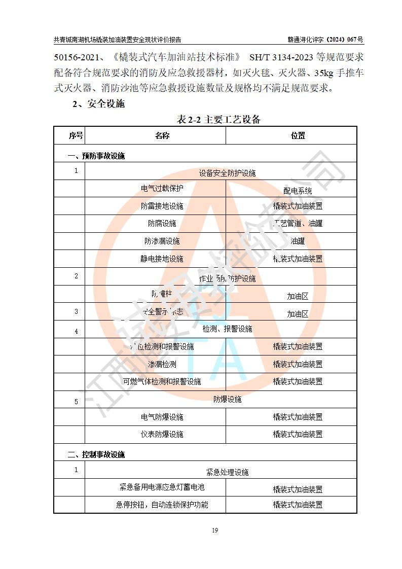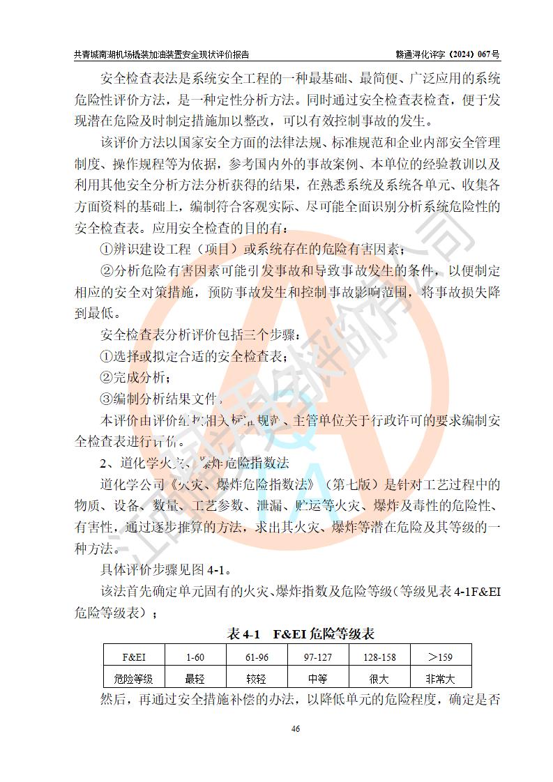 評價結(jié)論 | 九共青城南湖機(jī)場內(nèi)橇裝加油裝置涉及的安全條件、安全運營條件、安全生產(chǎn)管理等方面在落實本報告安全對策措施建議后,符合《通用航空供油工程建設(shè)規(guī)范》MH/T 5030-2014、《汽車加油加氣加氫站技術(shù)標(biāo)準(zhǔn)》GB50156-2021、《橇裝式汽車加油站技術(shù)標(biāo)準(zhǔn)》SH/T 3134-2023等**有關(guān)法規(guī)、標(biāo)準(zhǔn)、規(guī)范要求。 | |||