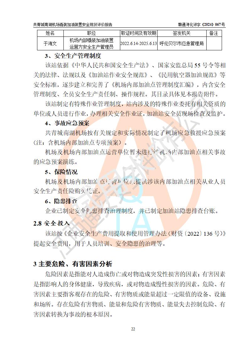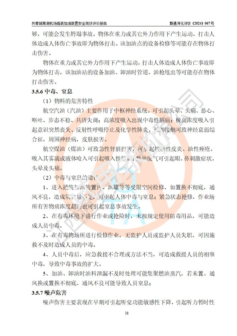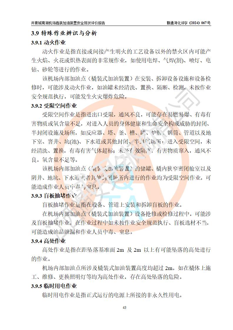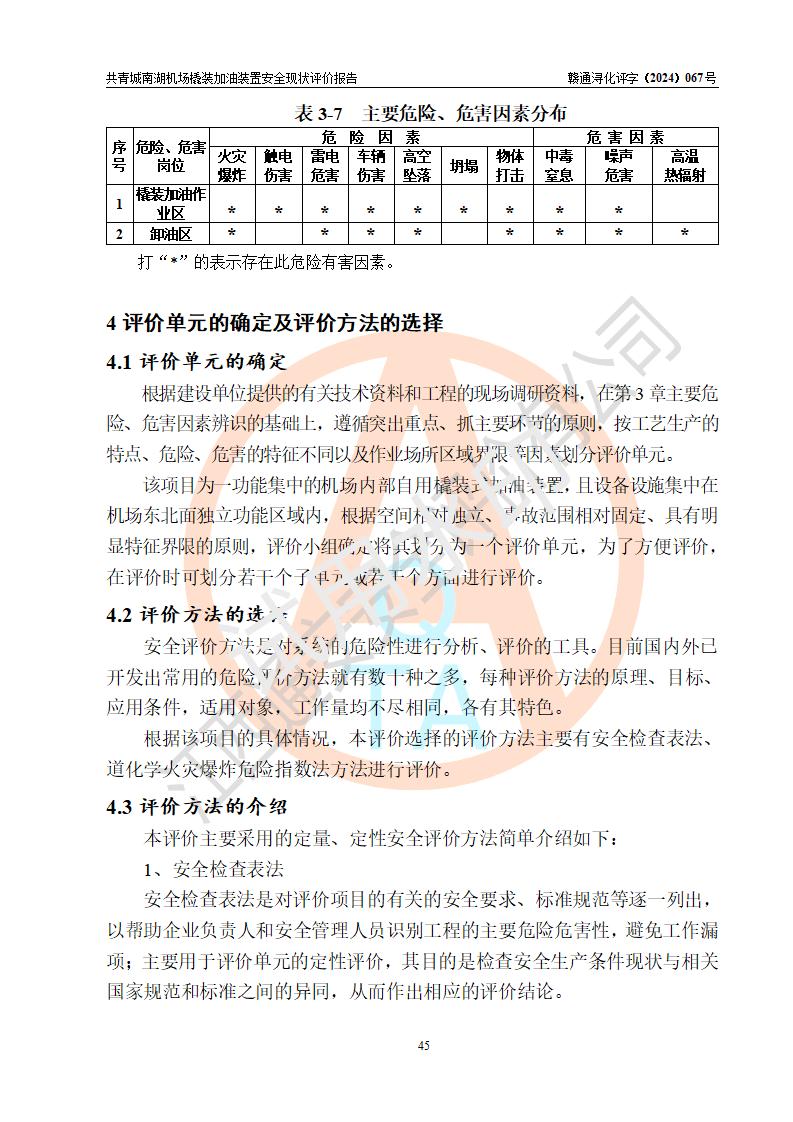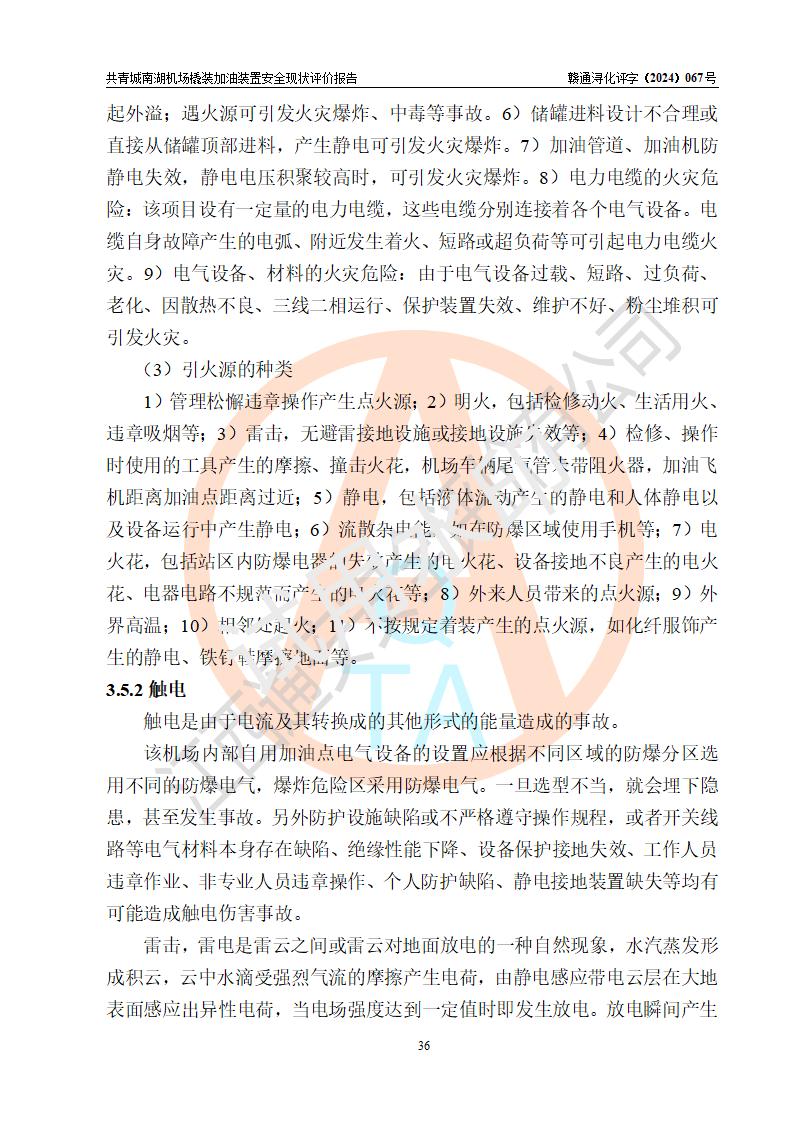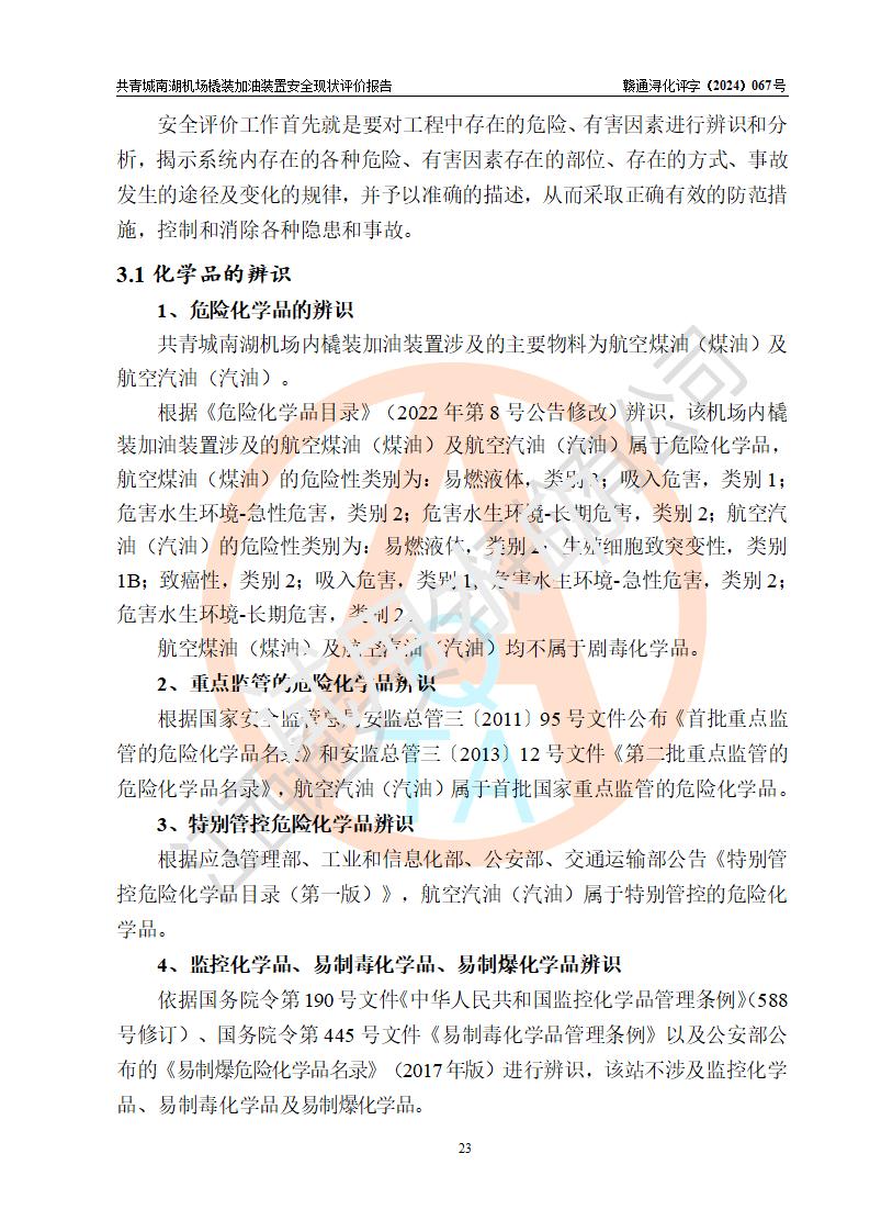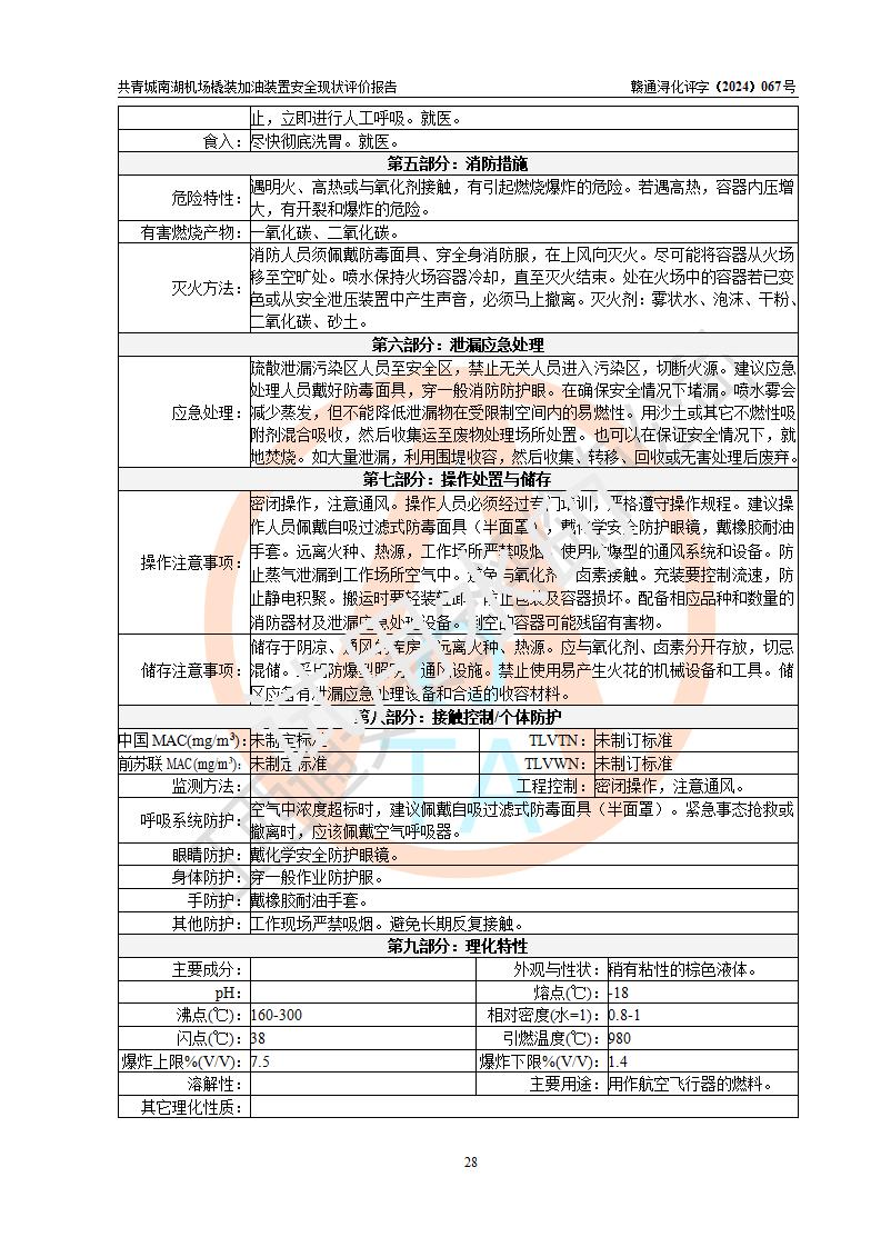 評價結(jié)論 | 九共青城南湖機(jī)場內(nèi)橇裝加油裝置涉及的安全條件、安全運營條件、安全生產(chǎn)管理等方面在落實本報告安全對策措施建議后,符合《通用航空供油工程建設(shè)規(guī)范》MH/T 5030-2014、《汽車加油加氣加氫站技術(shù)標(biāo)準(zhǔn)》GB50156-2021、《橇裝式汽車加油站技術(shù)標(biāo)準(zhǔn)》SH/T 3134-2023等**有關(guān)法規(guī)、標(biāo)準(zhǔn)、規(guī)范要求。 | |||