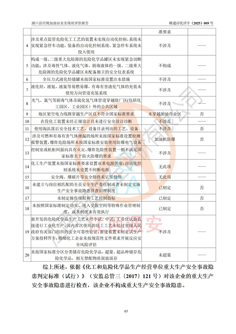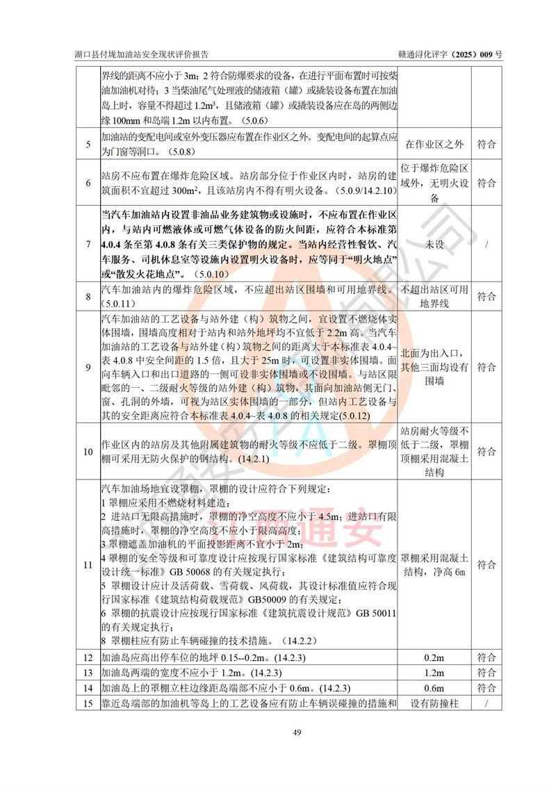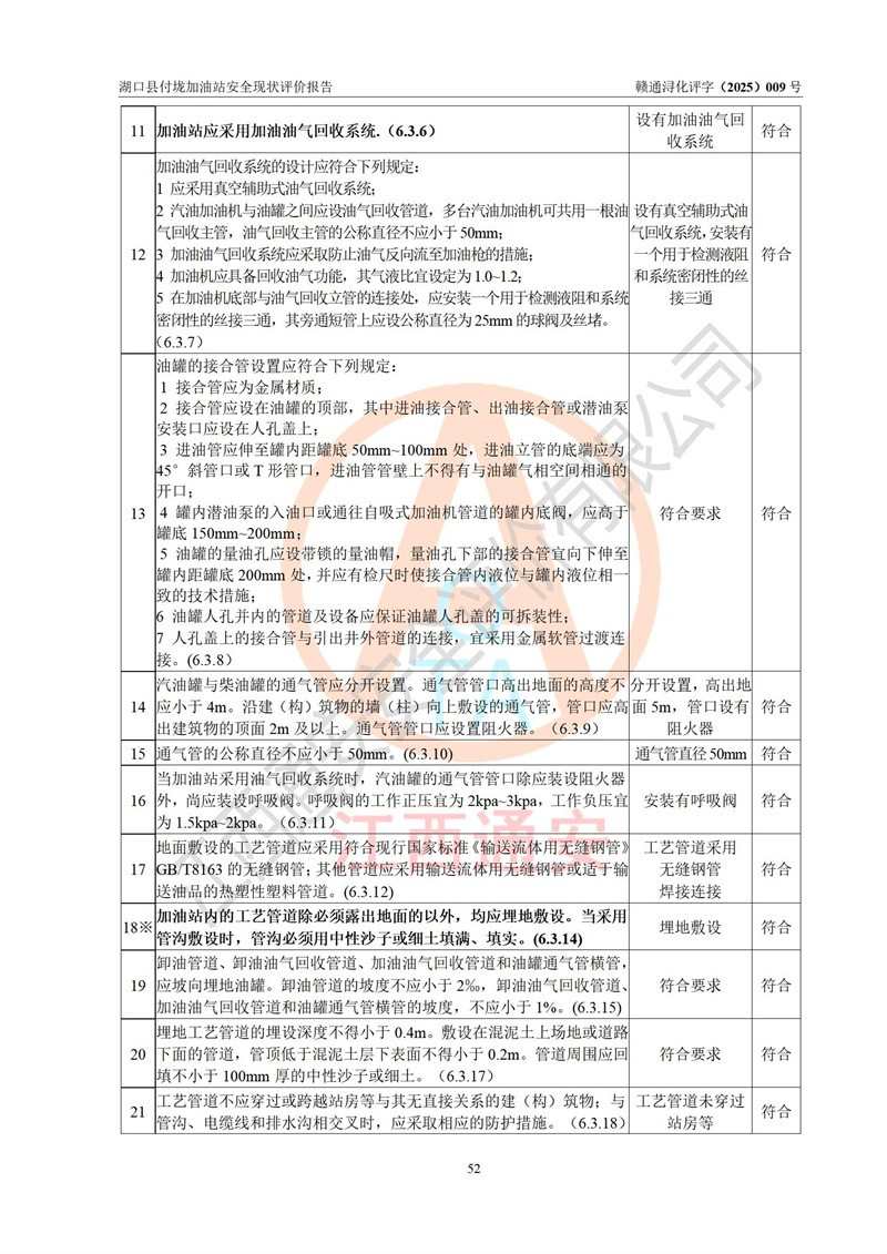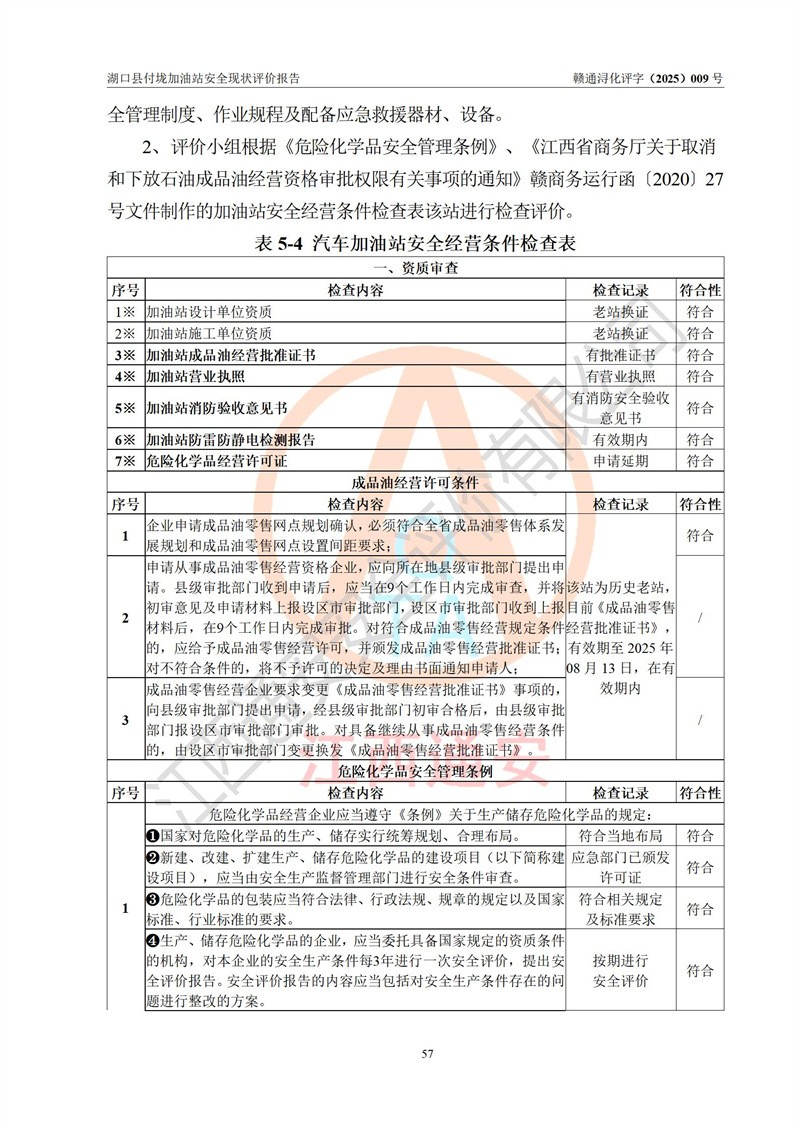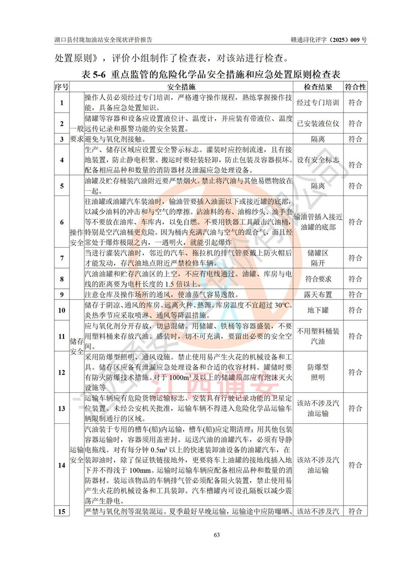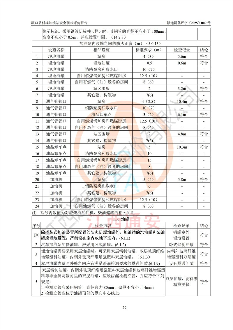 評價(jià)結(jié)論 | 湖口縣付垅加油站涉及的安全條件、安全經(jīng)營條件、安全生產(chǎn)管理符合《危險(xiǎn)化學(xué)品經(jīng)營許可證管理辦法》、《汽車加油加氣加氫站技術(shù)標(biāo)準(zhǔn)》等**有關(guān)法規(guī)、標(biāo)準(zhǔn)、規(guī)范要求,能滿足危險(xiǎn)化學(xué)品經(jīng)營安全條件。 | |||