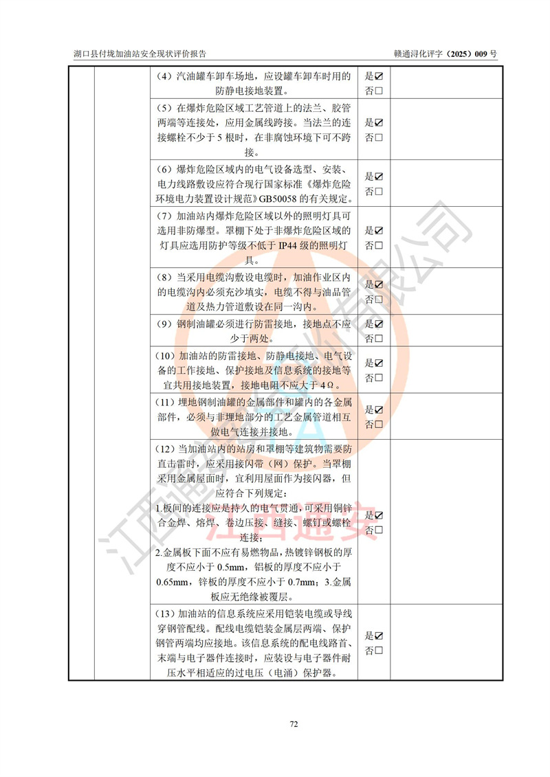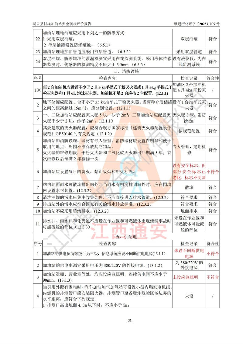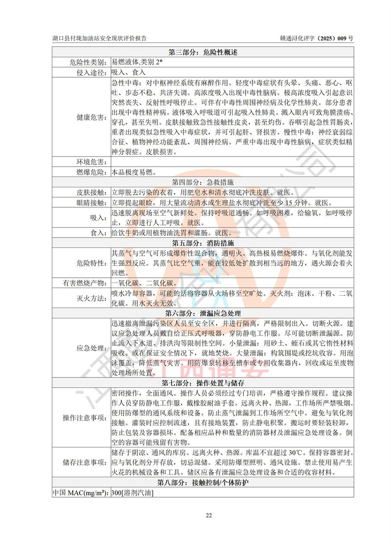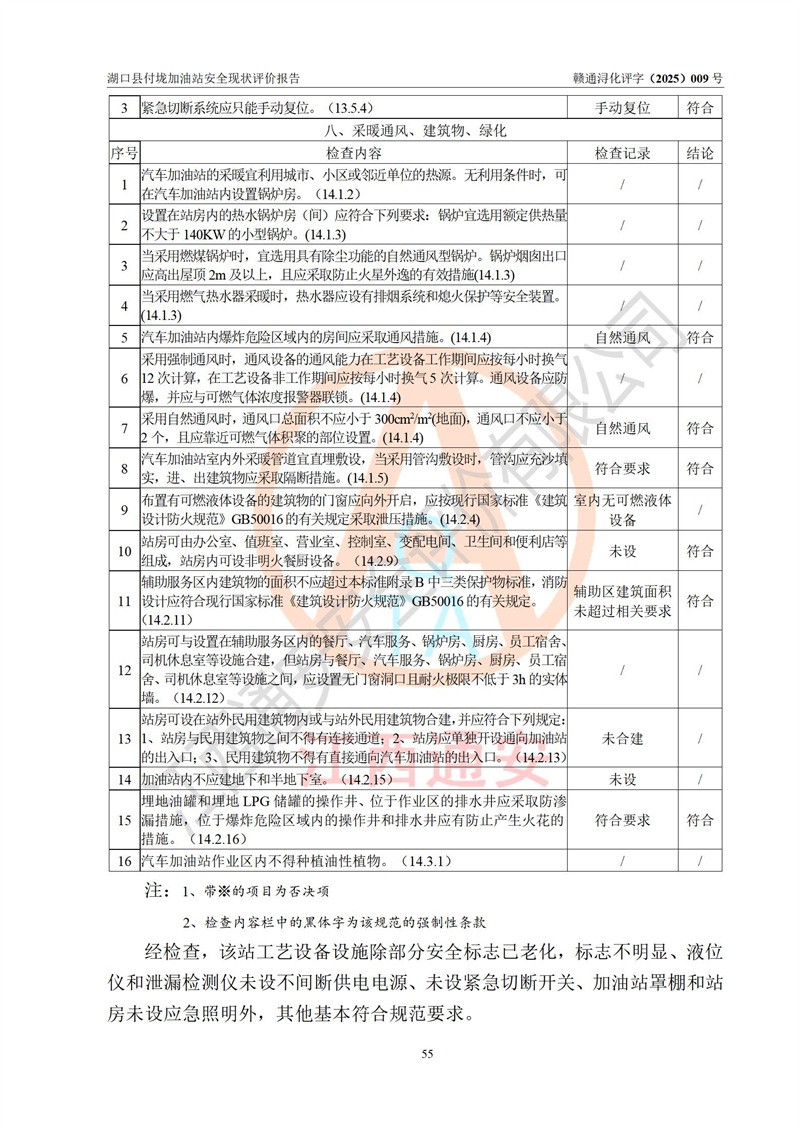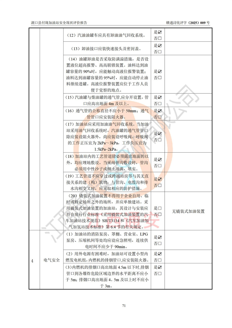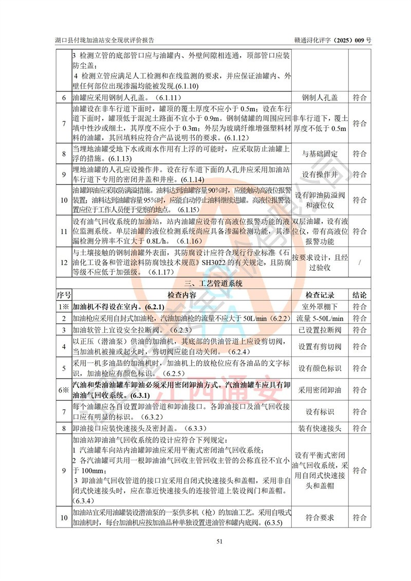 評價(jià)結(jié)論 | 湖口縣付垅加油站涉及的安全條件、安全經(jīng)營條件、安全生產(chǎn)管理符合《危險(xiǎn)化學(xué)品經(jīng)營許可證管理辦法》、《汽車加油加氣加氫站技術(shù)標(biāo)準(zhǔn)》等**有關(guān)法規(guī)、標(biāo)準(zhǔn)、規(guī)范要求,能滿足危險(xiǎn)化學(xué)品經(jīng)營安全條件。 | |||