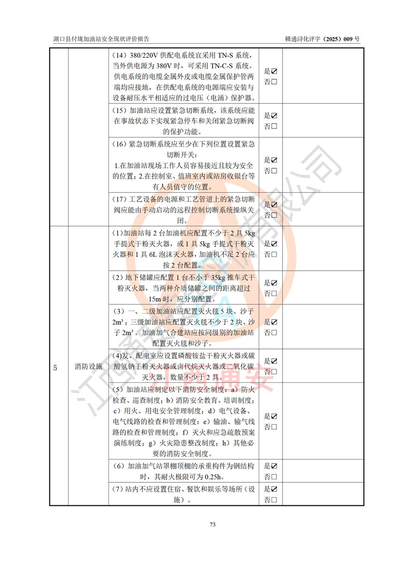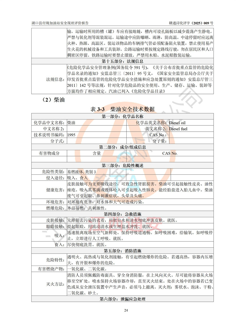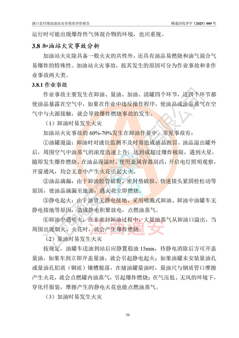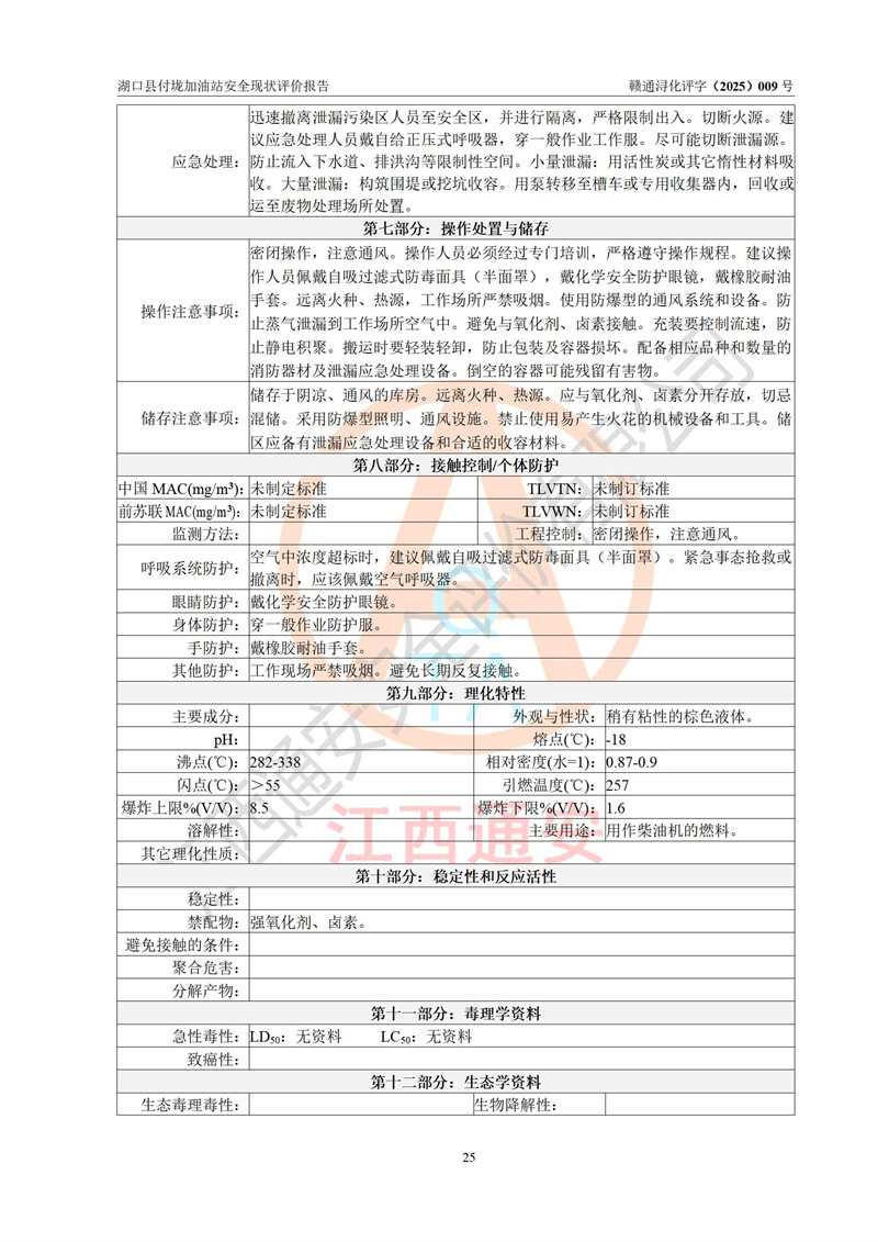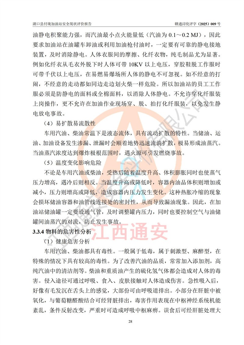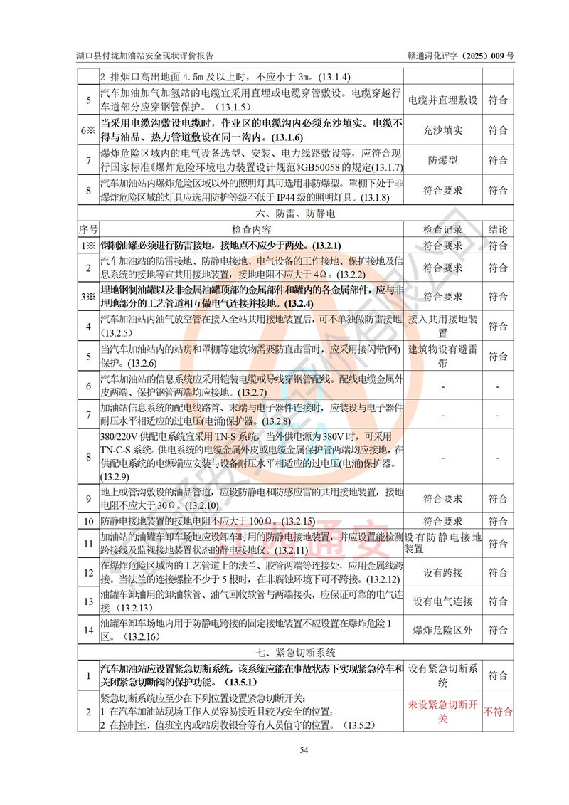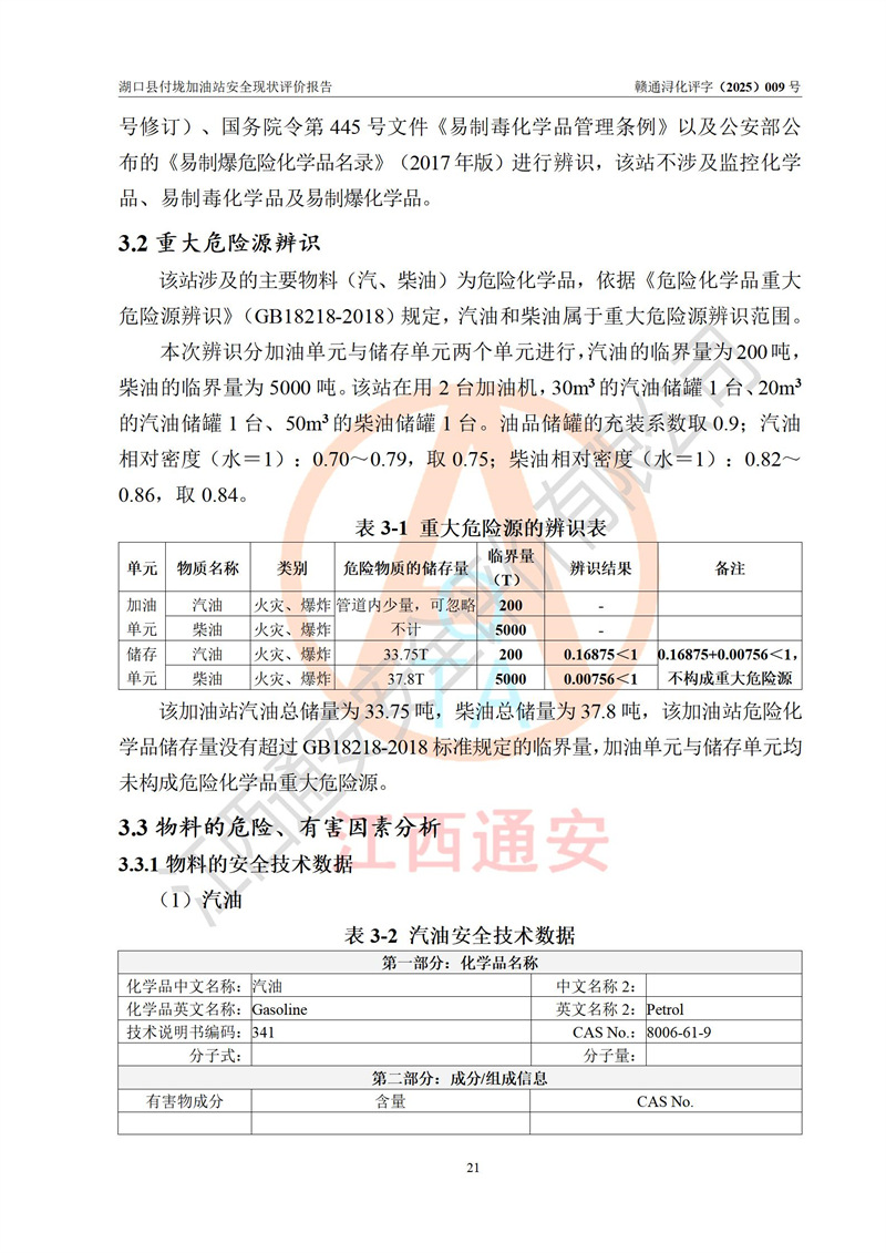 評價(jià)結(jié)論 | 湖口縣付垅加油站涉及的安全條件、安全經(jīng)營條件、安全生產(chǎn)管理符合《危險(xiǎn)化學(xué)品經(jīng)營許可證管理辦法》、《汽車加油加氣加氫站技術(shù)標(biāo)準(zhǔn)》等**有關(guān)法規(guī)、標(biāo)準(zhǔn)、規(guī)范要求,能滿足危險(xiǎn)化學(xué)品經(jīng)營安全條件。 | |||