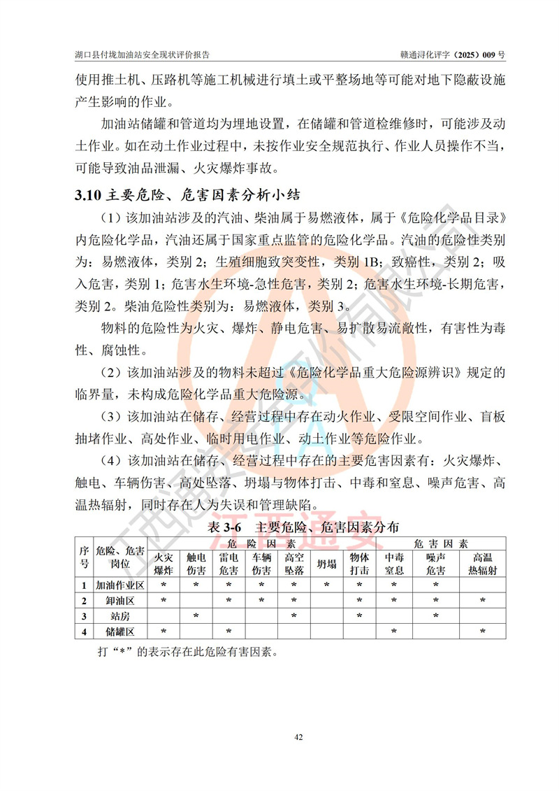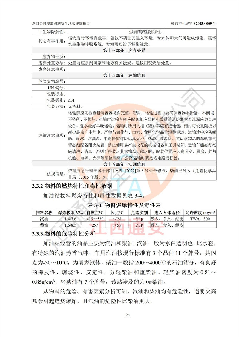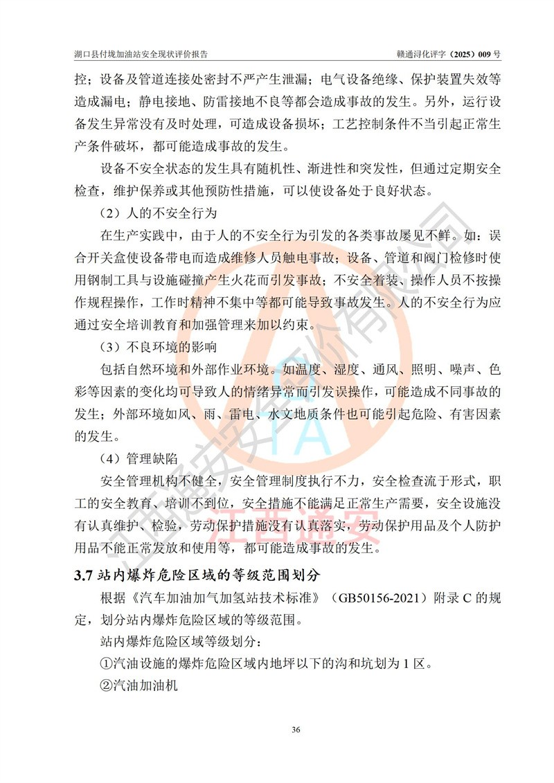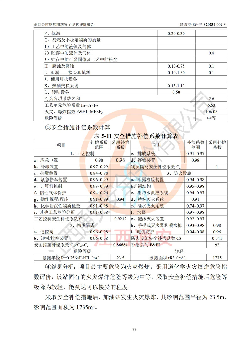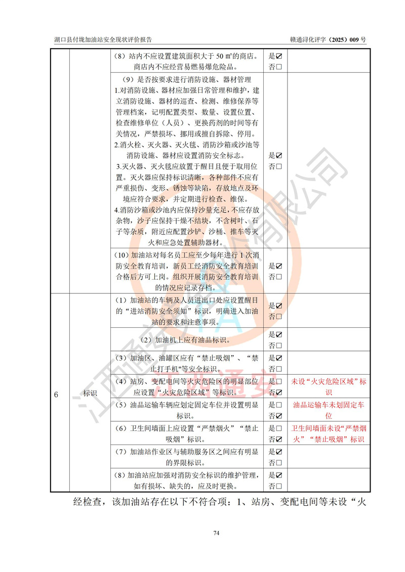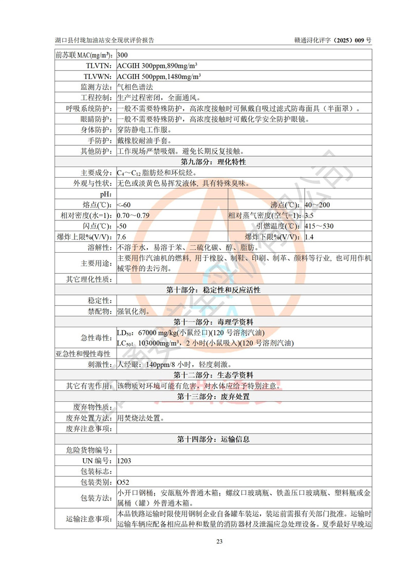 評價(jià)結(jié)論 | 湖口縣付垅加油站涉及的安全條件、安全經(jīng)營條件、安全生產(chǎn)管理符合《危險(xiǎn)化學(xué)品經(jīng)營許可證管理辦法》、《汽車加油加氣加氫站技術(shù)標(biāo)準(zhǔn)》等**有關(guān)法規(guī)、標(biāo)準(zhǔn)、規(guī)范要求,能滿足危險(xiǎn)化學(xué)品經(jīng)營安全條件。 | |||