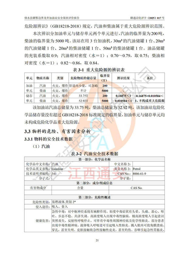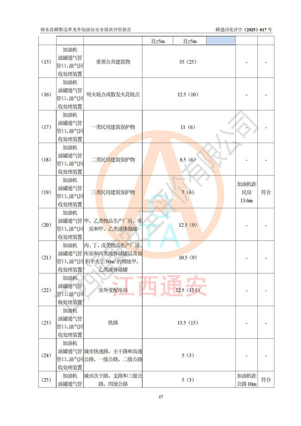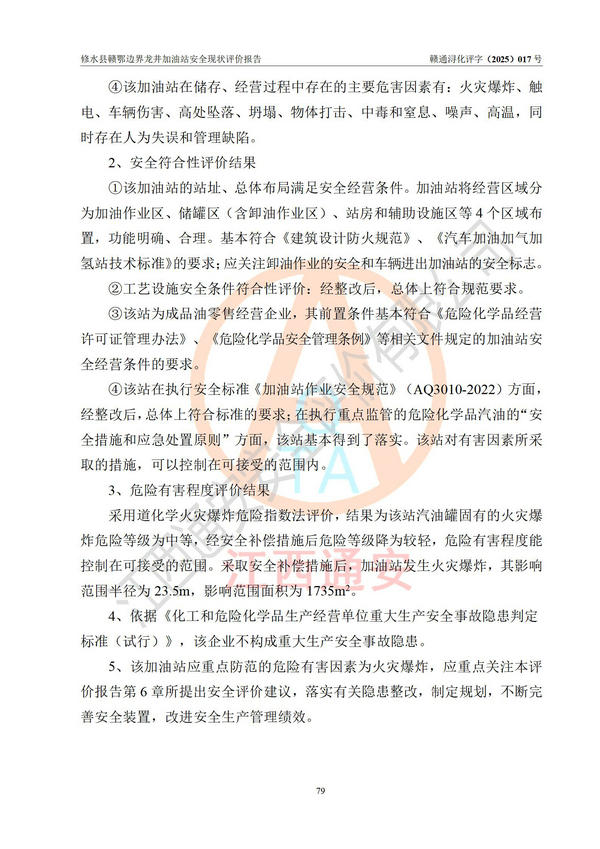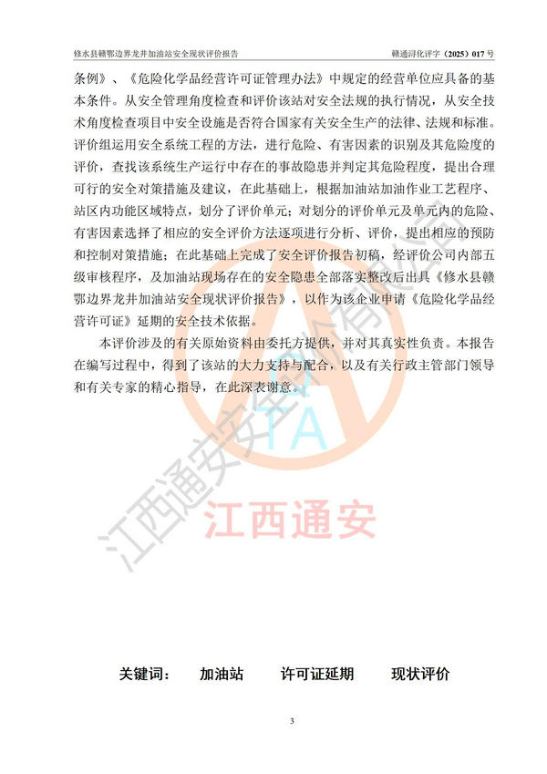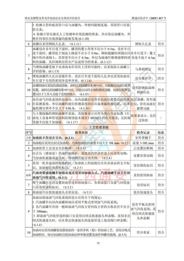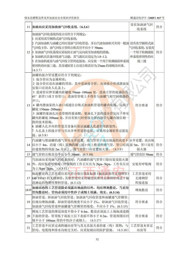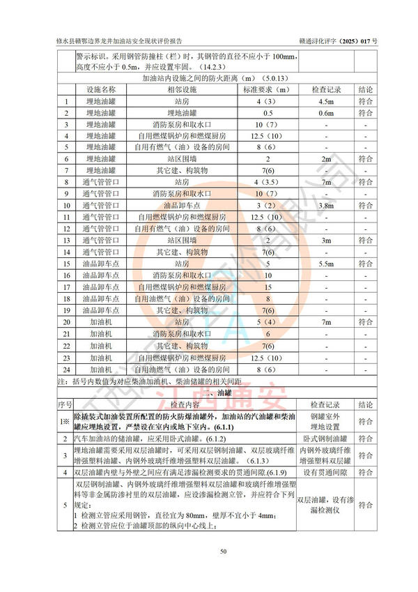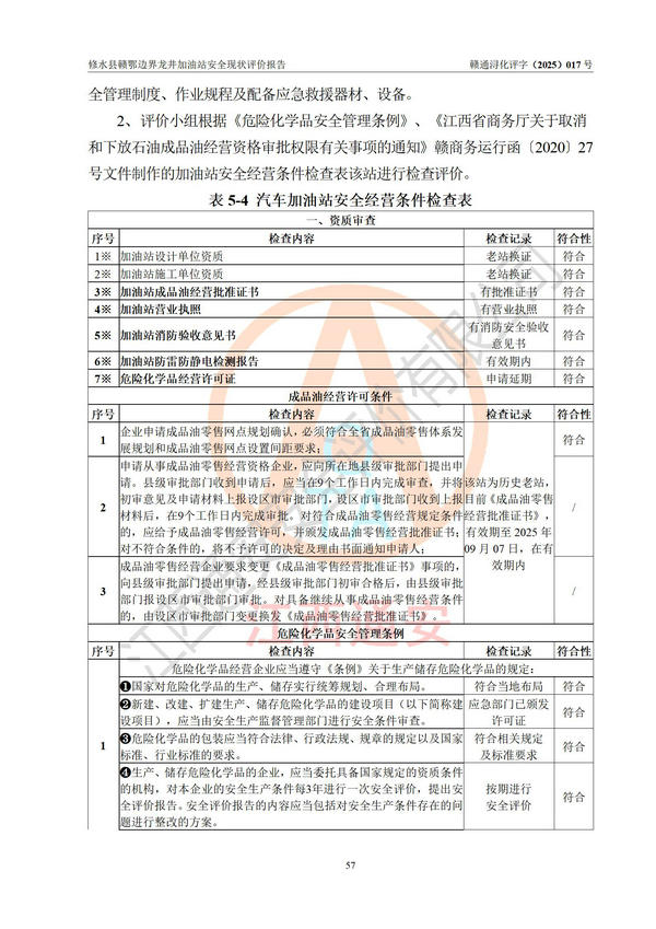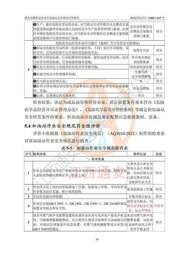 評價結(jié)論 | 修水縣贛鄂邊界龍井加油站涉及的安全條件、安全經(jīng)營條件、安全生產(chǎn)管理符合《危險化學(xué)品經(jīng)營許可證管理辦法》、《汽車加油加氣加氫站技術(shù)標(biāo)準(zhǔn)》等**有關(guān)法規(guī)、標(biāo)準(zhǔn)、規(guī)范要求,能滿足危險化學(xué)品經(jīng)營安全條件。 | |||