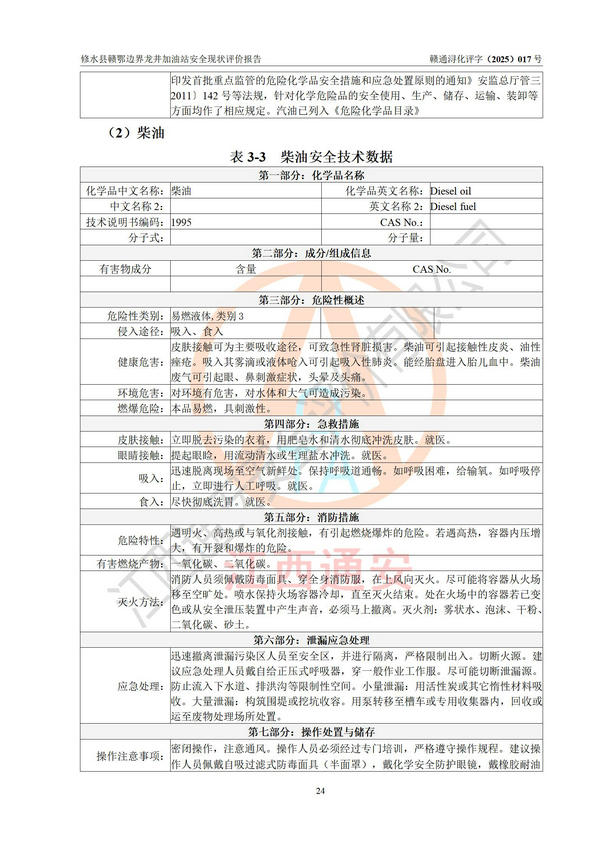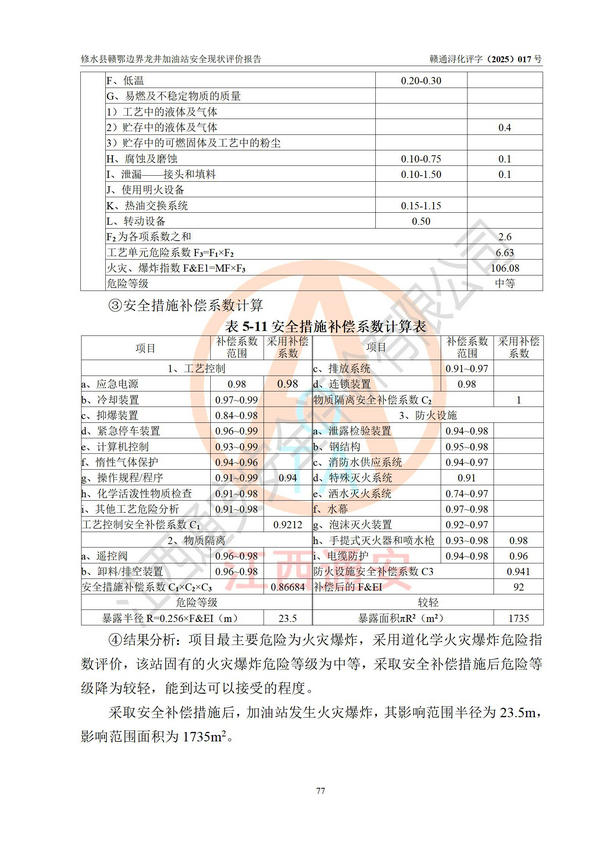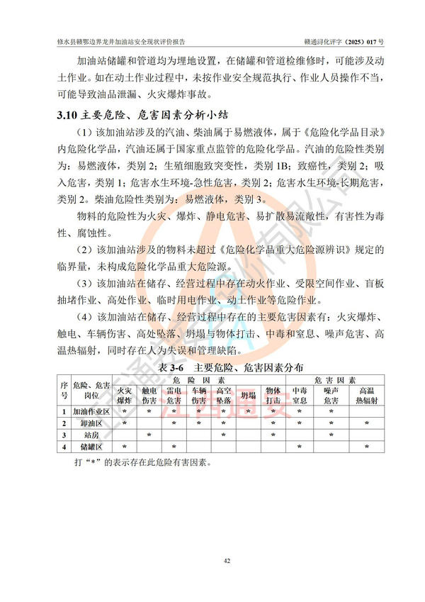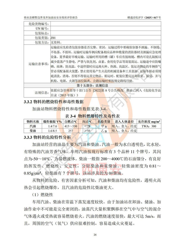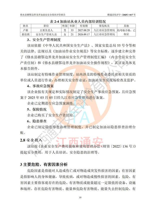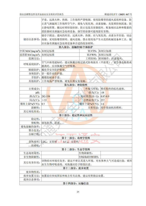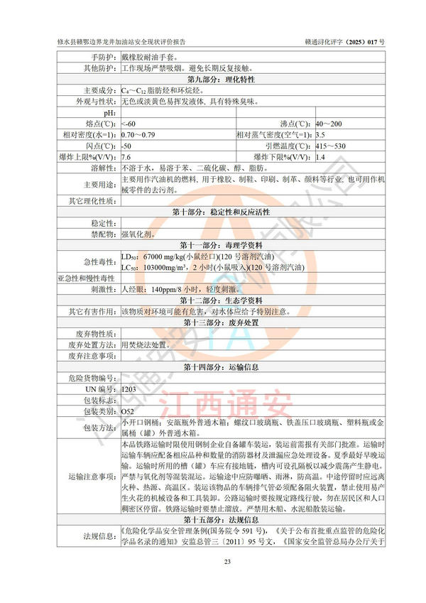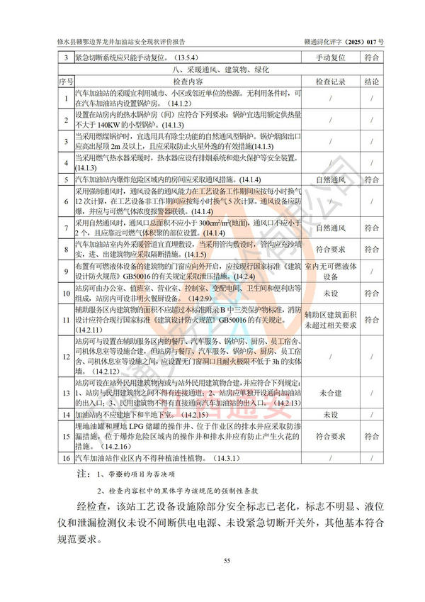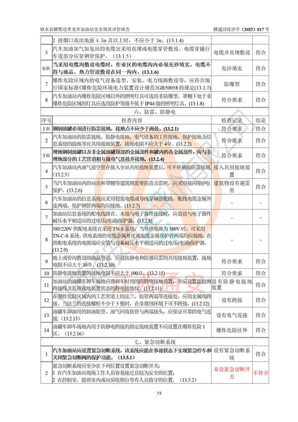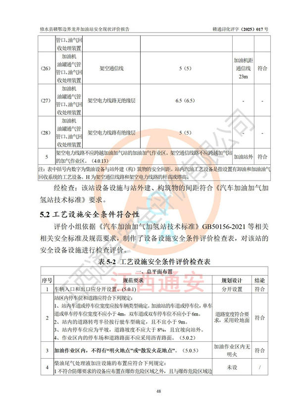 評價結(jié)論 | 修水縣贛鄂邊界龍井加油站涉及的安全條件、安全經(jīng)營條件、安全生產(chǎn)管理符合《危險化學(xué)品經(jīng)營許可證管理辦法》、《汽車加油加氣加氫站技術(shù)標(biāo)準(zhǔn)》等**有關(guān)法規(guī)、標(biāo)準(zhǔn)、規(guī)范要求,能滿足危險化學(xué)品經(jīng)營安全條件。 | |||