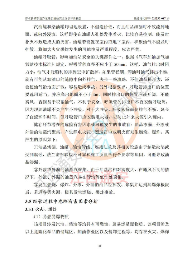 項(xiàng)目簡介 | 修水縣贛鄂邊界龍井加油站是一家專門從事成品油零售經(jīng)營的個體工商戶,經(jīng)營場所位于江西省九江市修水縣港口鎮(zhèn)盧坊村(塘堝村)?,F(xiàn)有從業(yè)人員5名,其中安全管理人員1人,加油站負(fù)責(zé)人盧彬。 該加油站占地面積約1100m2,站區(qū)內(nèi)設(shè)置有3臺雙槍程控燃油加油機(jī)及配套的工藝管線,設(shè)有SF雙層儲罐4臺,其中30m3的92#汽油儲罐1臺、20m3的95#汽油儲罐1臺、50m3的0#柴油儲罐1臺、20m3的0#柴油儲罐1臺,油品儲罐總?cè)莘e為120m3(折算成汽油為85m3),按現(xiàn)行《汽車加油加氣加氫站技術(shù)標(biāo)準(zhǔn)》對加油站的等級劃分原則,屬三級加油站。 該站由九江市行政審批局換發(fā)《危險化學(xué)品經(jīng)營許可證》(證號:贛九行審經(jīng)(甲)字[2021]000104號),**期限2022年04月09日至2025年04月08日。 | |||