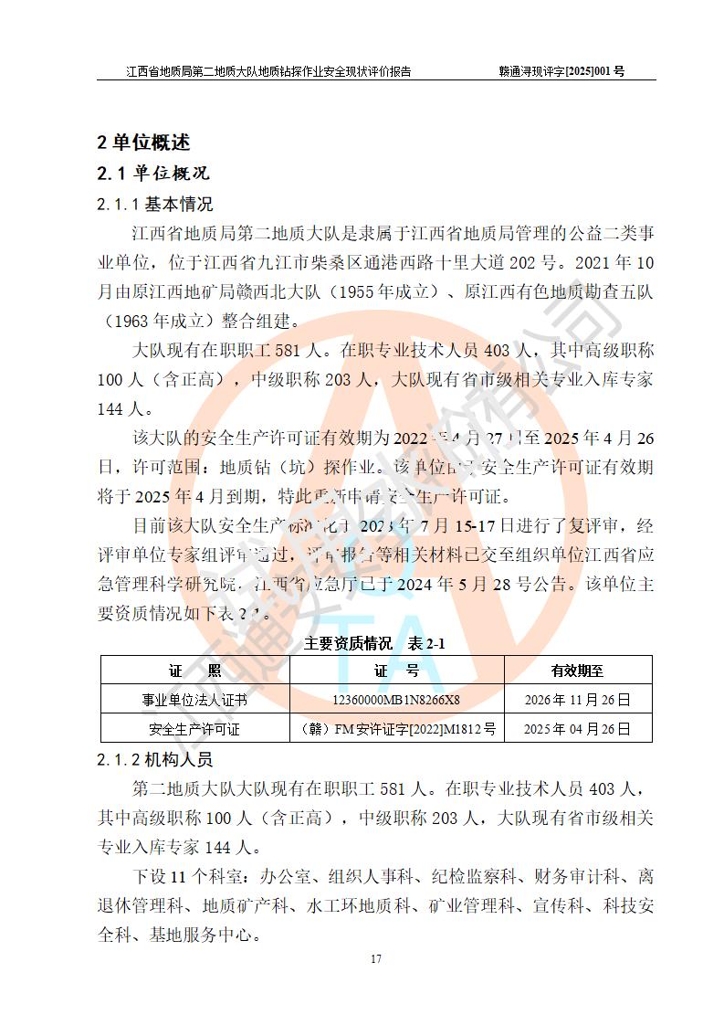 項目簡介 | 江西省地質(zhì)局第二地質(zhì)大隊是隸屬于江西省地質(zhì)局管理的公益二類事業(yè)單位,位于江西省九江市柴桑區(qū)通港西路十里大道202號。2021年10月由原江西地礦局贛西北大隊(1955年成立)、原江西有色地質(zhì)勘查五隊(1963年成立)整合組建。 曾榮獲“**科技進(jìn)步特等獎”、首批“**地質(zhì)找礦功勛單位”、“**五四紅旗團(tuán)委”、“江西省地質(zhì)勘查功勛單位”等**和省部級頒發(fā)的各類成果獎400余項。 大隊機(jī)關(guān)設(shè)置有辦公室、組織人事科、紀(jì)檢監(jiān)察科、財務(wù)審計科、離退休管理科、地質(zhì)礦產(chǎn)科、水工環(huán)地質(zhì)科、礦業(yè)管理科、科技安全科、基地服務(wù)中心等11個科室;擁有地勘院、地調(diào)院、水工環(huán)院、探工院、實驗室、巖土一公司、巖土二公司、巖土五公司、廣東分公司、贛州分公司、巖土測試等經(jīng)濟(jì)實體單位25個。 大隊現(xiàn)有在職職工581人。在職專業(yè)技術(shù)人員403人,其中高級職稱100人(含正高),中級職稱203人,大隊現(xiàn)有省市級相關(guān)專業(yè)入庫專家144人,為地方**業(yè)務(wù)部門長期提供專業(yè)技術(shù)服務(wù)。 該大隊上一輪安全生產(chǎn)許可證**期為2022年4月27日至2025年4月26日,許可范圍:地質(zhì)鉆(坑)探作業(yè)。該單位由于安全生產(chǎn)許可證**期將于2025年4月到期,特此重新申請安全生產(chǎn)許可證。按照《安全生產(chǎn)法》、《礦山安全法》和《關(guān)于做好非煤礦山企業(yè)安全生產(chǎn)許可證延期換證工作的通知》等有關(guān)規(guī)定,該單位在申請安全生產(chǎn)許可證前應(yīng)進(jìn)行安全現(xiàn)狀評價。 | |||||