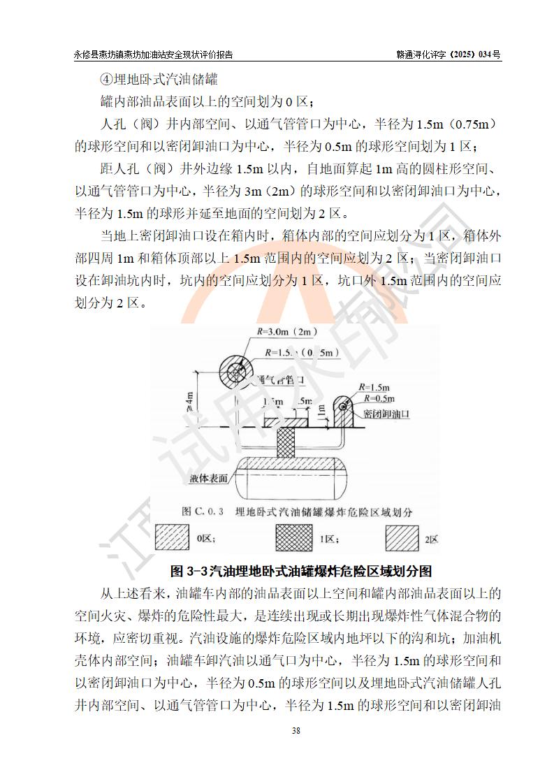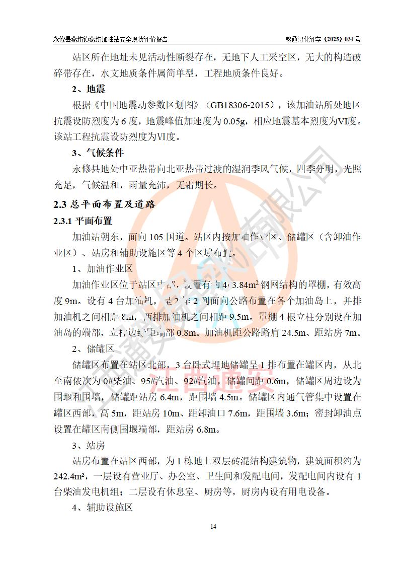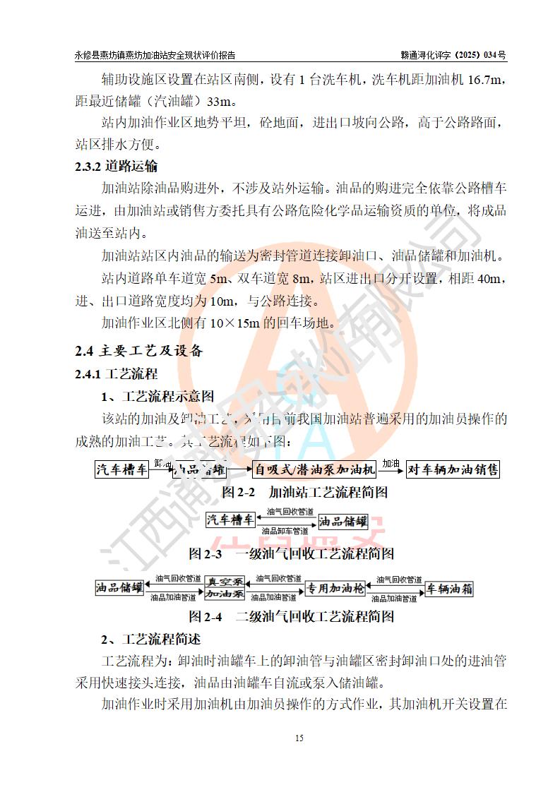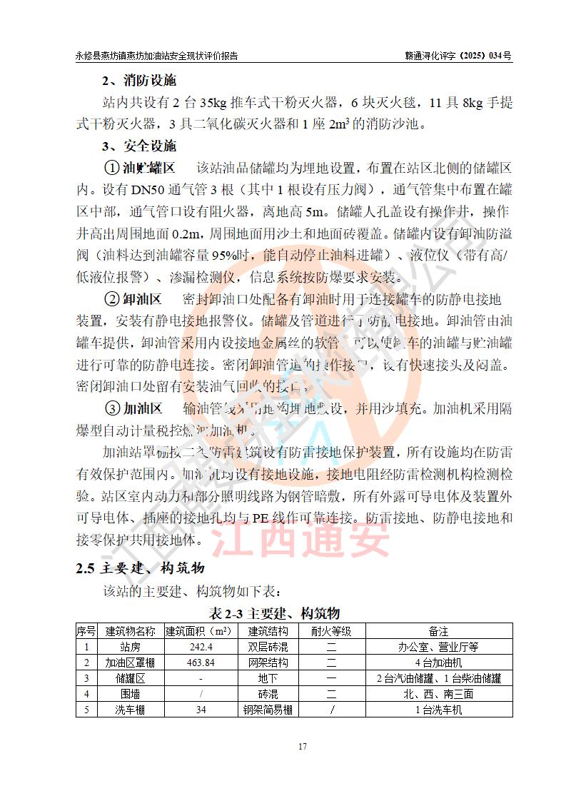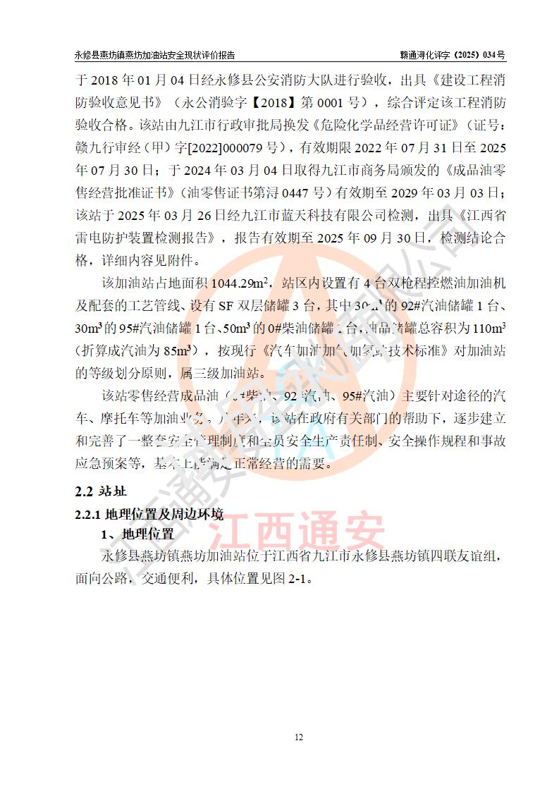 項(xiàng)目簡(jiǎn)介 | 永修縣燕坊鎮(zhèn)燕坊加油站是一家專門(mén)從事成品油零售經(jīng)營(yíng)的個(gè)體工商戶,經(jīng)營(yíng)場(chǎng)所位于江西省九江市永修縣燕坊鎮(zhèn)四聯(lián)友誼組?,F(xiàn)有從業(yè)人員6名,其中安全管理人員1人,加油站負(fù)責(zé)人傅偉杰。 該加油站占地面積1044.29m2,站區(qū)內(nèi)設(shè)置有4臺(tái)雙槍程控燃油加油機(jī)及配套的工藝管線、設(shè)有SF雙層儲(chǔ)罐3臺(tái),其中30m3的92#汽油儲(chǔ)罐1臺(tái)、30m3的95#汽油儲(chǔ)罐1臺(tái)、50m3的0#柴油儲(chǔ)罐1臺(tái),油品儲(chǔ)罐總?cè)莘e為110m3(折算成汽油為85m3),按現(xiàn)行《汽車加油加氣加氫站技術(shù)標(biāo)準(zhǔn)》對(duì)加油站的等級(jí)劃分原則,屬三級(jí)加油站。 該站由九江市行政審批局換發(fā)《危險(xiǎn)化學(xué)品經(jīng)營(yíng)許可證》(證號(hào):贛九行審經(jīng)(甲)字[2022]000079號(hào)),**期限2022年07月31日至2025年07月30日。 | |||