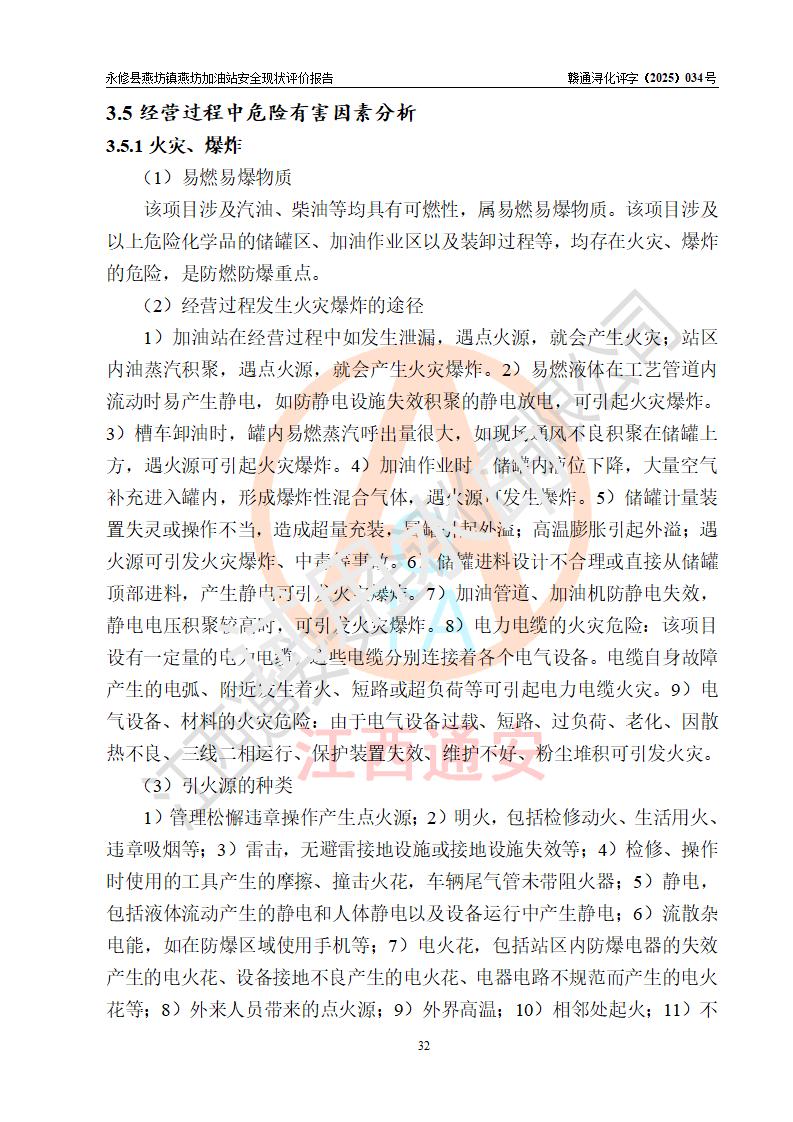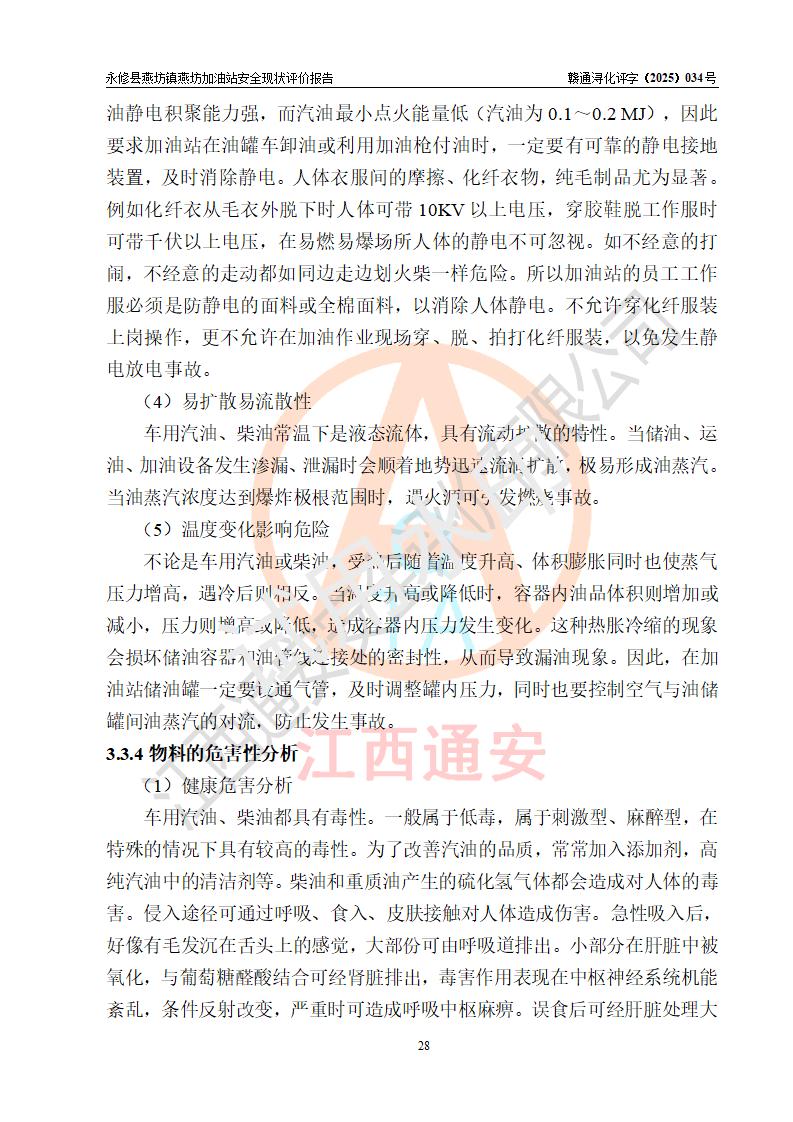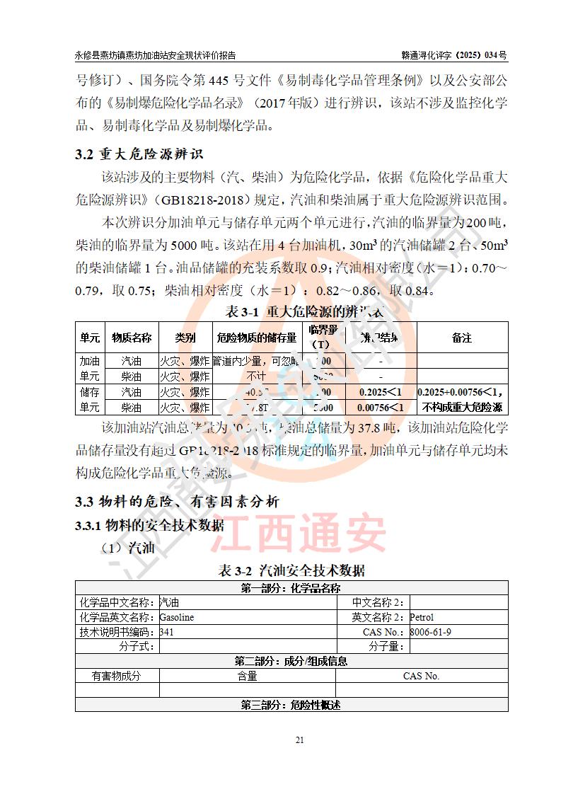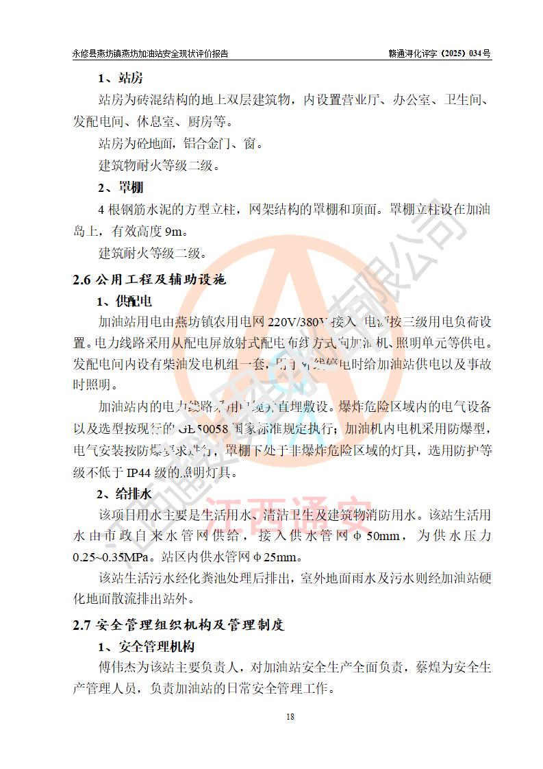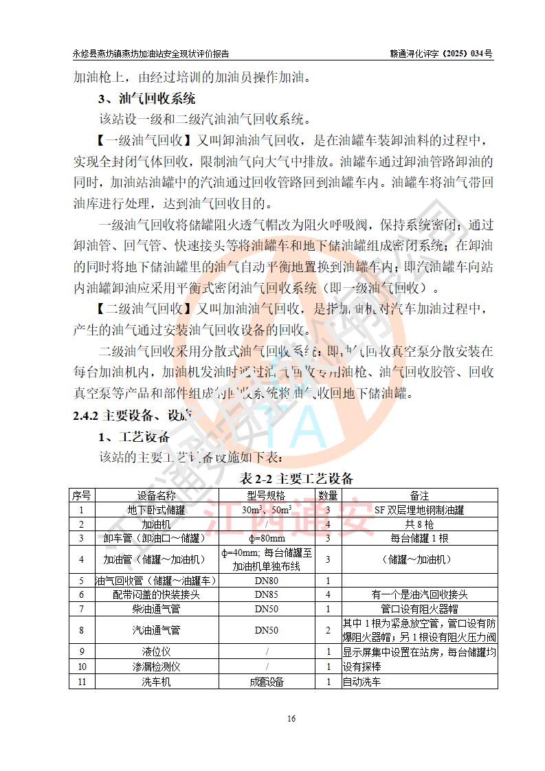 項(xiàng)目簡(jiǎn)介 | 永修縣燕坊鎮(zhèn)燕坊加油站是一家專門(mén)從事成品油零售經(jīng)營(yíng)的個(gè)體工商戶,經(jīng)營(yíng)場(chǎng)所位于江西省九江市永修縣燕坊鎮(zhèn)四聯(lián)友誼組?,F(xiàn)有從業(yè)人員6名,其中安全管理人員1人,加油站負(fù)責(zé)人傅偉杰。 該加油站占地面積1044.29m2,站區(qū)內(nèi)設(shè)置有4臺(tái)雙槍程控燃油加油機(jī)及配套的工藝管線、設(shè)有SF雙層儲(chǔ)罐3臺(tái),其中30m3的92#汽油儲(chǔ)罐1臺(tái)、30m3的95#汽油儲(chǔ)罐1臺(tái)、50m3的0#柴油儲(chǔ)罐1臺(tái),油品儲(chǔ)罐總?cè)莘e為110m3(折算成汽油為85m3),按現(xiàn)行《汽車加油加氣加氫站技術(shù)標(biāo)準(zhǔn)》對(duì)加油站的等級(jí)劃分原則,屬三級(jí)加油站。 該站由九江市行政審批局換發(fā)《危險(xiǎn)化學(xué)品經(jīng)營(yíng)許可證》(證號(hào):贛九行審經(jīng)(甲)字[2022]000079號(hào)),**期限2022年07月31日至2025年07月30日。 | |||