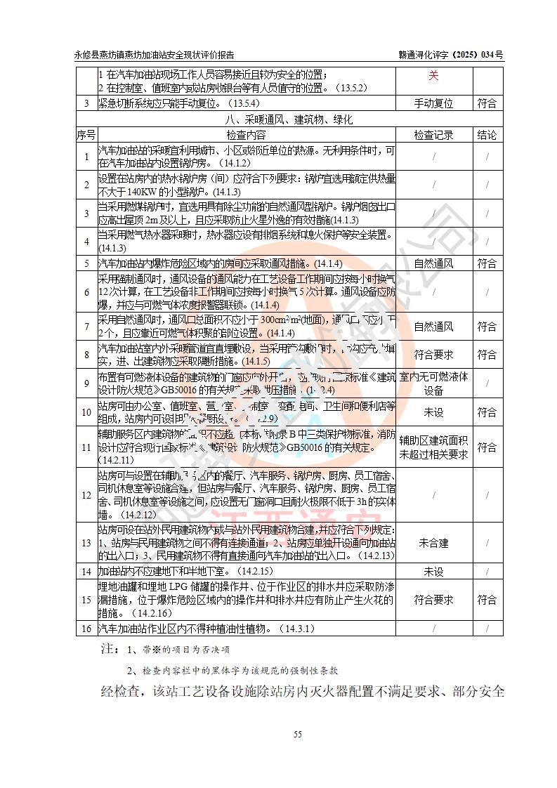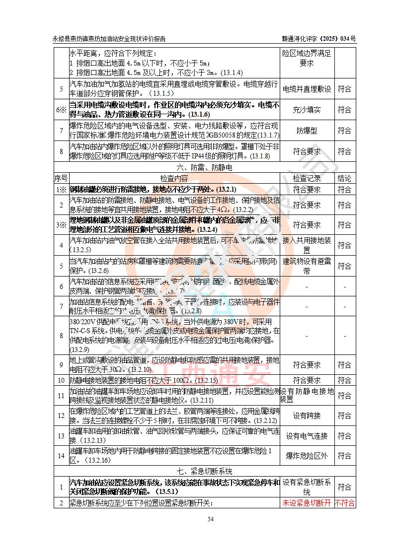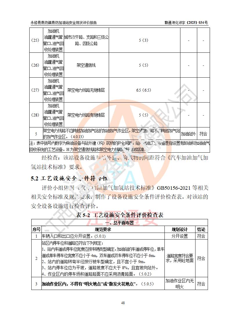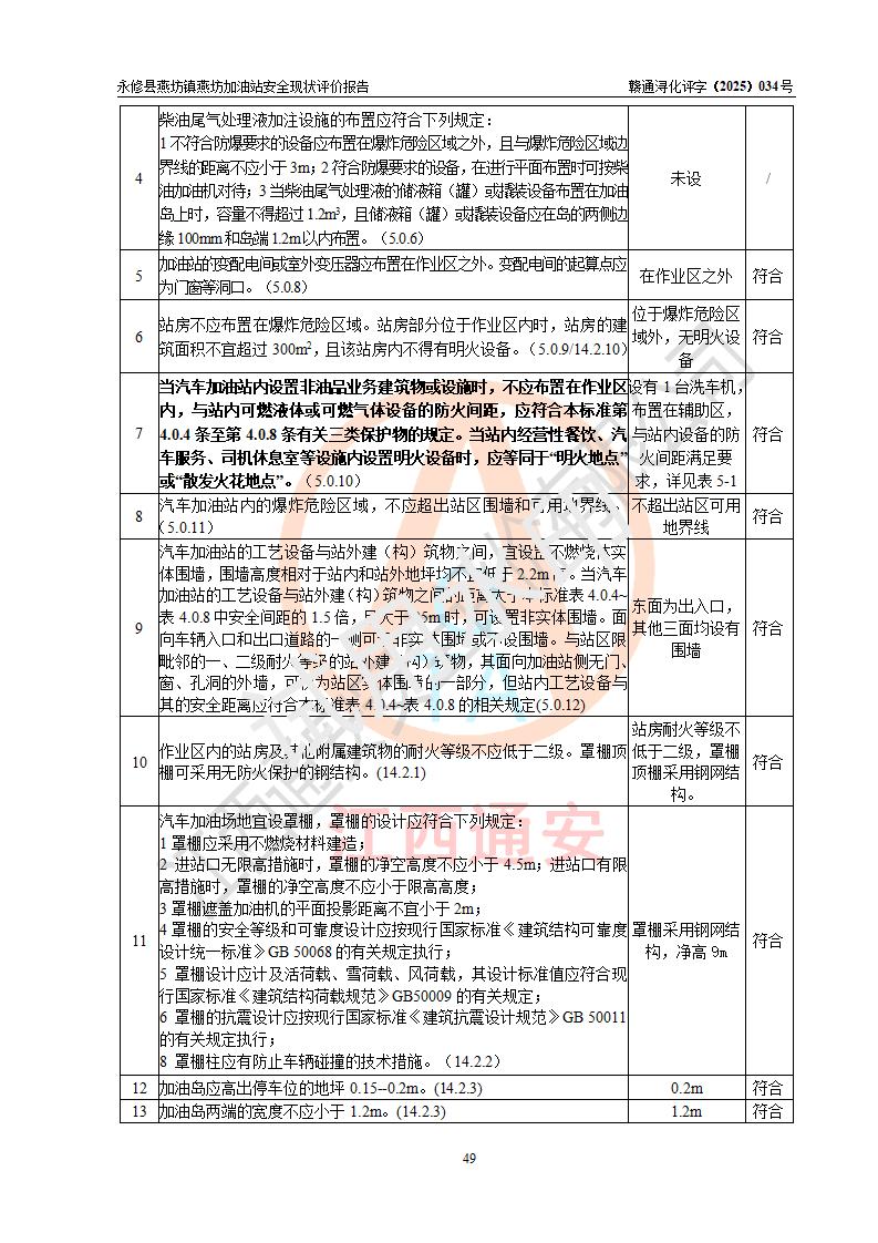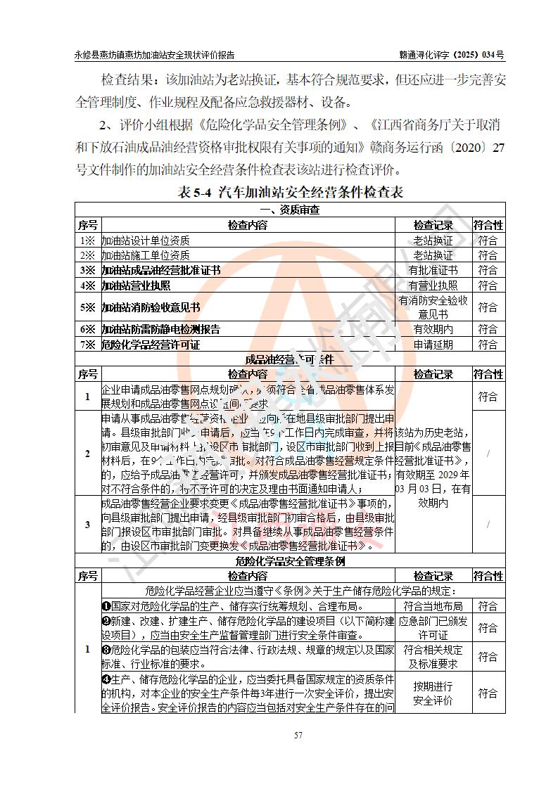 評(píng)價(jià)結(jié)論 | 永修縣燕坊鎮(zhèn)燕坊加油站涉及的安全條件、安全經(jīng)營(yíng)條件、安全生產(chǎn)管理符合《危險(xiǎn)化學(xué)品經(jīng)營(yíng)許可證管理辦法》、《汽車加油加氣加氫站技術(shù)標(biāo)準(zhǔn)》等**有關(guān)法規(guī)、標(biāo)準(zhǔn)、規(guī)范要求,能滿足危險(xiǎn)化學(xué)品經(jīng)營(yíng)安全條件。 | |||