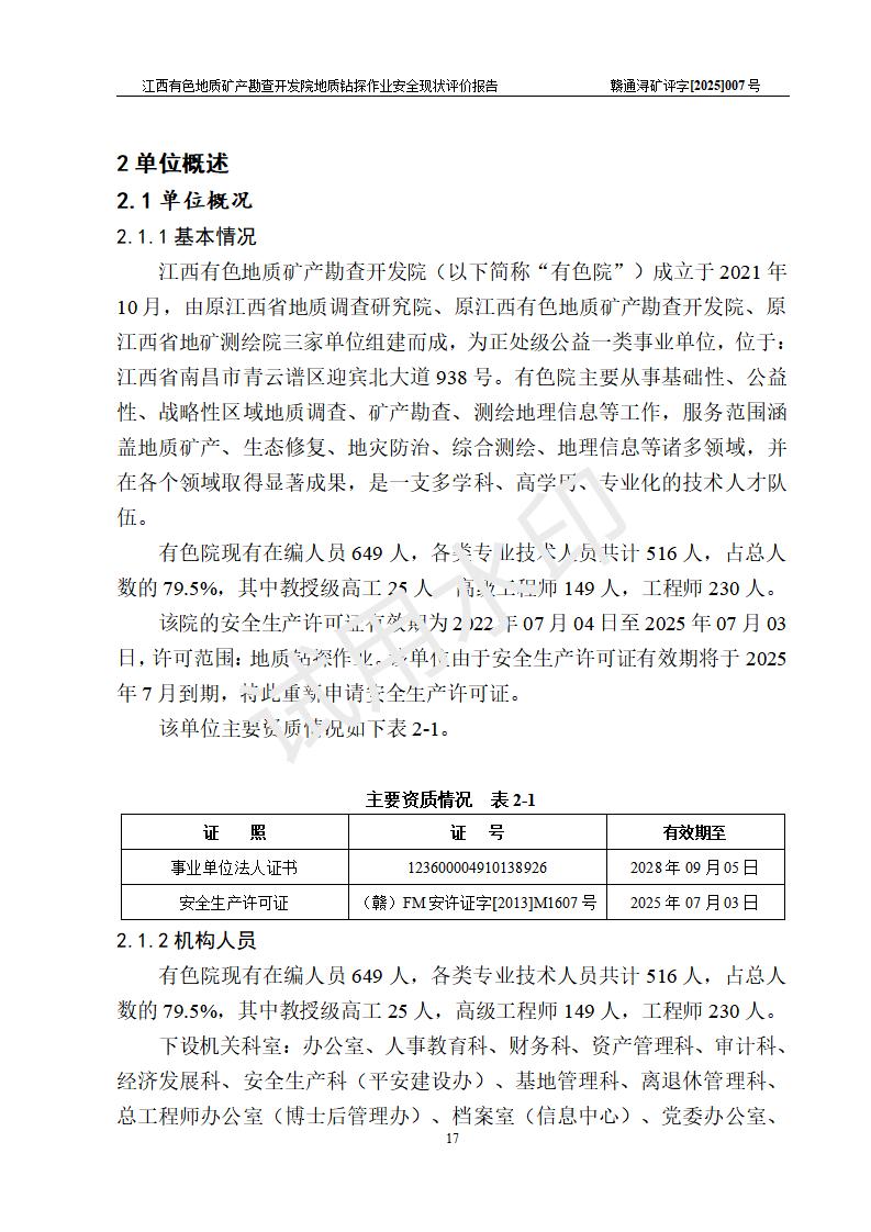 項目簡介 | 江西有色地質(zhì)礦產(chǎn)勘查開發(fā)院(以下簡稱“有色院”)成立于2021年10月,由原江西省地質(zhì)調(diào)查研究院、原江西有色地質(zhì)礦產(chǎn)勘查開發(fā)院、原江西省地礦測繪院三家單位組建而成,為正處級公益一類事業(yè)單位,位于:江西省南昌市青云譜區(qū)迎賓北大道938號。有色院主要從事基礎(chǔ)性、公益性、戰(zhàn)略性區(qū)域地質(zhì)調(diào)查、礦產(chǎn)勘查、測繪地理信息等工作,服務(wù)范圍涵蓋地質(zhì)礦產(chǎn)、生態(tài)修復(fù)、地災(zāi)防治、綜合測繪、地理信息等諸多領(lǐng)域,并在各個領(lǐng)域取得顯著成果,是一支多學(xué)科、高學(xué)歷、專業(yè)化的技術(shù)人才隊伍。 有色院現(xiàn)有在編人員649人,各類專業(yè)技術(shù)人員共計516人,占總?cè)藬?shù)的79.5%,其中**級高工25人,高級工程師149人,工程師230人。 該院上一輪安全生產(chǎn)許可證**期為2022年07月04日至2025年07月03日,許可范圍:地質(zhì)鉆探作業(yè)。該單位由于安全生產(chǎn)許可證**期將于2025年7月到期,特此重新申請安全生產(chǎn)許可證。按照《安全生產(chǎn)法》、《礦山安全法》和《關(guān)于做好非煤礦山企業(yè)安全生產(chǎn)許可證延期換證工作的通知》等有關(guān)規(guī)定,該單位在申請安全生產(chǎn)許可證前應(yīng)進(jìn)行安全現(xiàn)狀評價。 | |||||