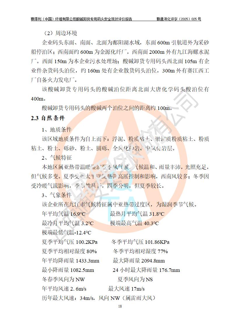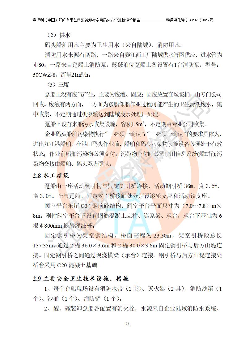 項(xiàng)目簡介 | 賽得利(中國)纖維有限公司酸堿卸貨**碼頭(2009.12-2011.6在鄱陽湖水域建設(shè)了一個(gè)酸堿貨運(yùn)**碼頭, 2016年進(jìn)行了驗(yàn)收評價(jià))位于鄱陽湖邊、廠區(qū)的東面,年吞吐量59.4萬噸,其中濃硫酸26.4萬噸/年,液態(tài)燒堿33萬噸/年。企業(yè)酸堿卸貨**碼頭靠泊能力為800噸級兼顧1000噸級。碼頭酸、堿單泊位長68m;岸線長度:225m(港口非深水岸線)。年吞吐量:59.4萬噸/年,其中,酸26.4萬噸/年,堿33萬噸/年;結(jié)構(gòu)型式:高樁梁板式。 安全管理方面,賽得利(中國)纖維有限公司執(zhí)行“一企一策”,執(zhí)行了安全生產(chǎn)檢查表(港口企業(yè)),加強(qiáng)安全管理。 | |||||