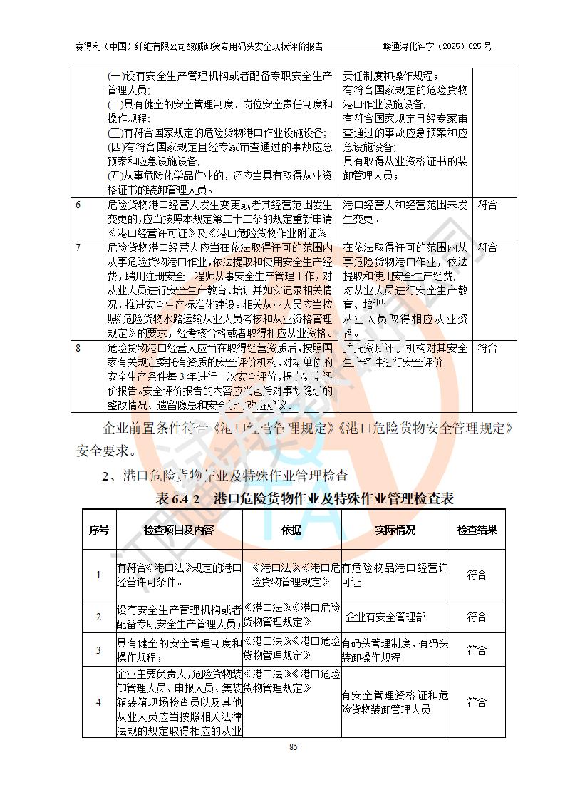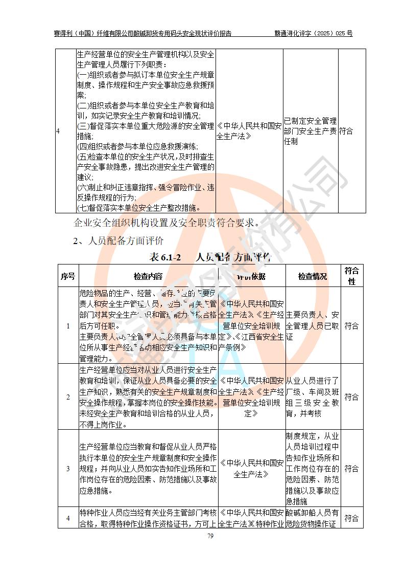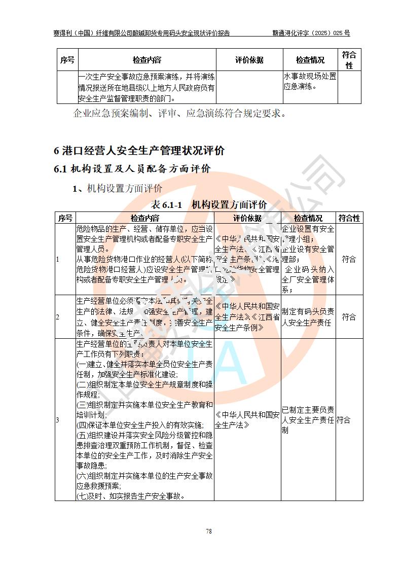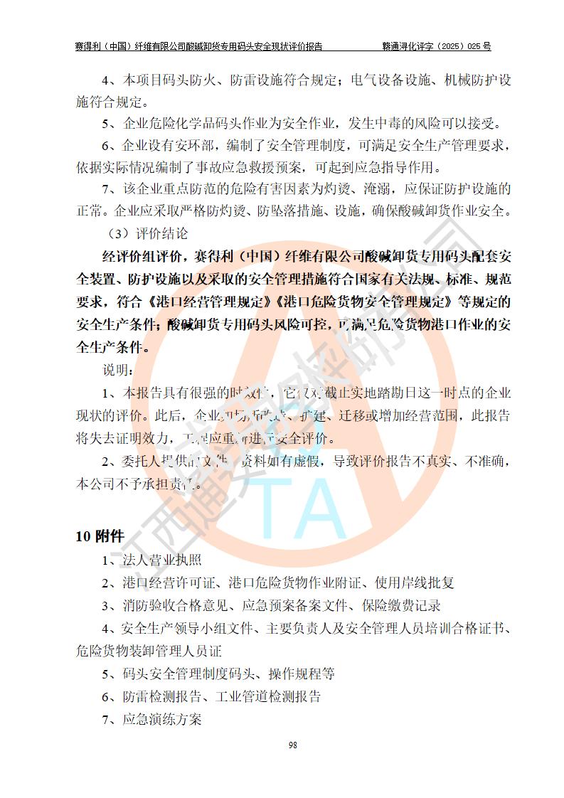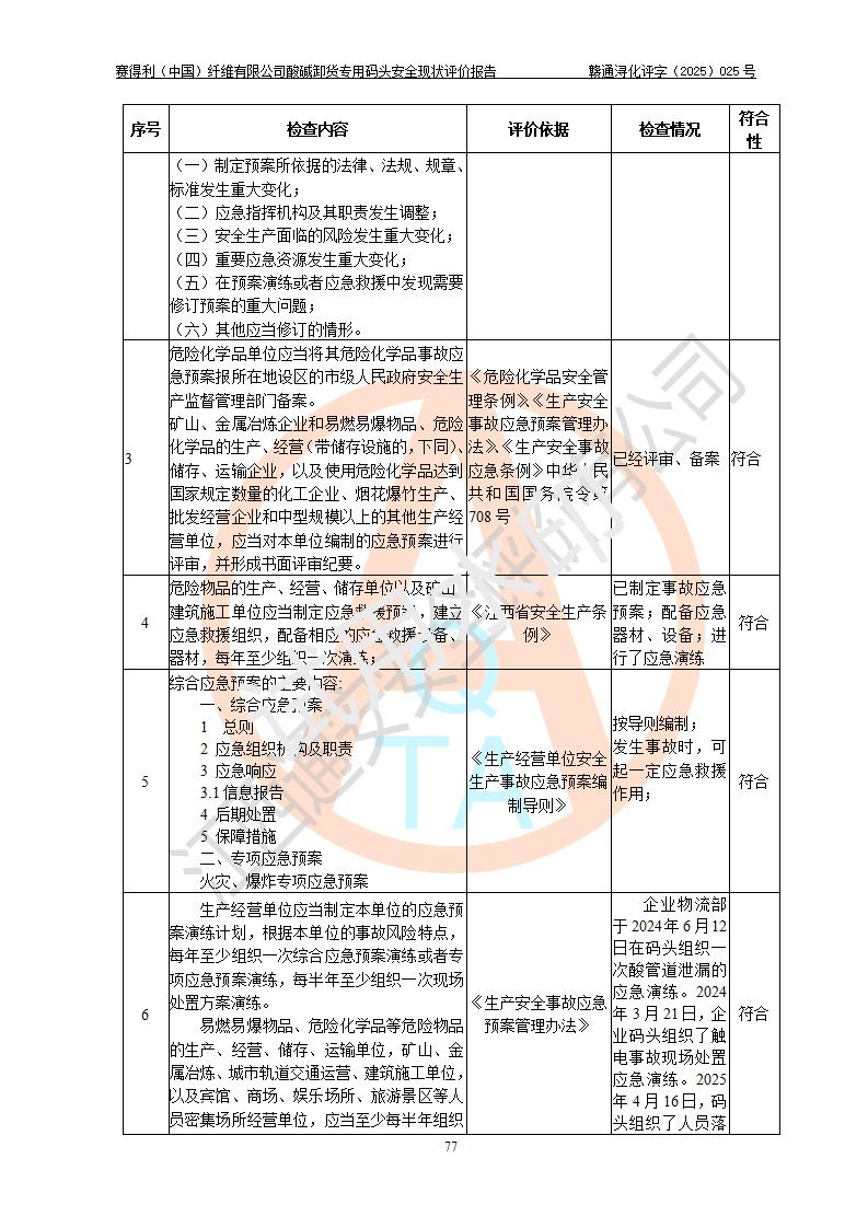 評價(jià)結(jié)論 | 經(jīng)評價(jià)組評價(jià),賽得利(中國)纖維有限公司酸堿卸貨**碼頭配套安全裝置、防護(hù)設(shè)施以及采取的安全管理措施符合**有關(guān)法規(guī)、標(biāo)準(zhǔn)、規(guī)范要求,符合《港口經(jīng)營管理規(guī)定》《港口危險(xiǎn)貨物安全管理規(guī)定》等規(guī)定的安全生產(chǎn)條件;酸堿卸貨**碼頭風(fēng)險(xiǎn)可控,可滿足危險(xiǎn)貨物港口作業(yè)的安全生產(chǎn)條件。 | |||||