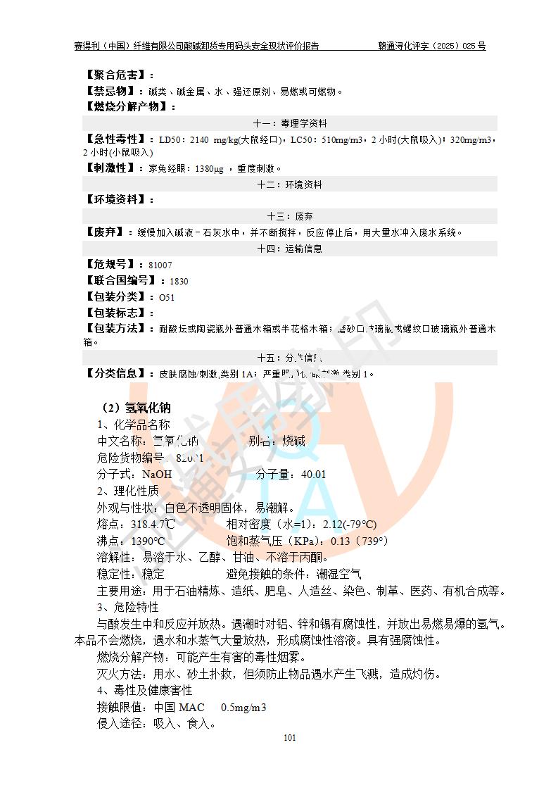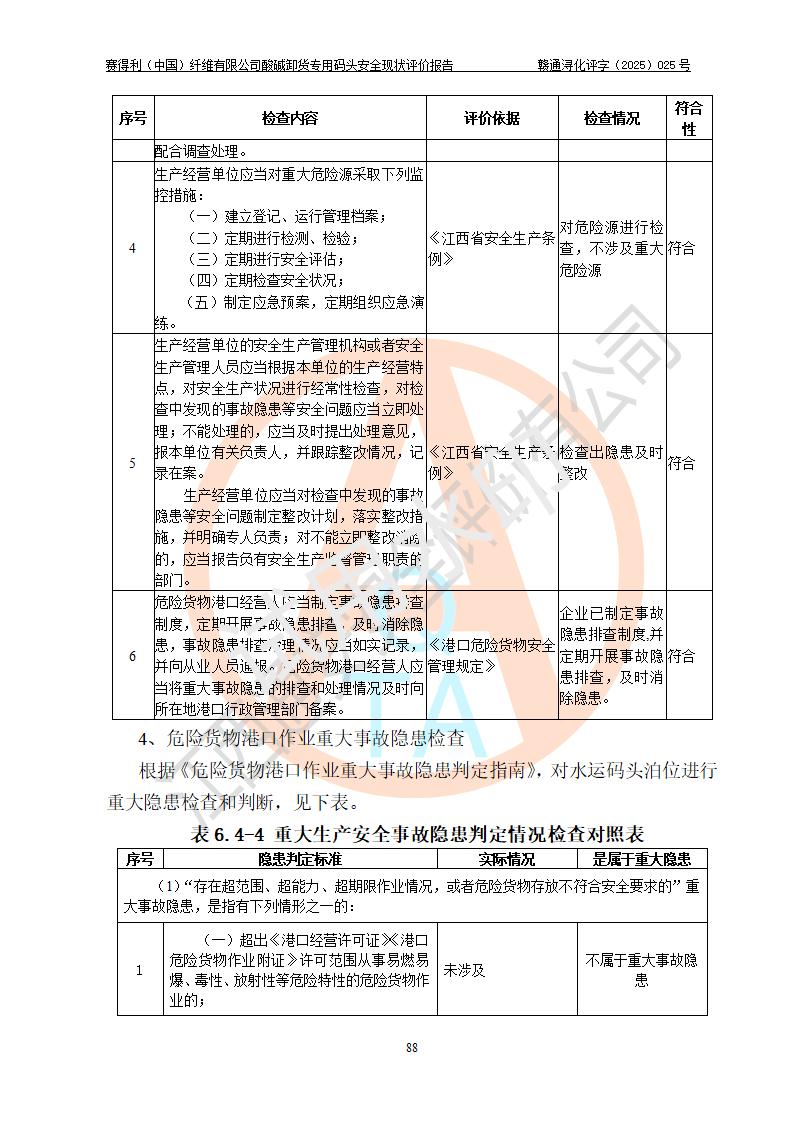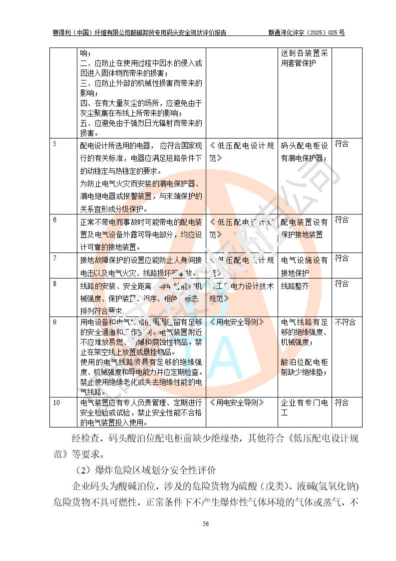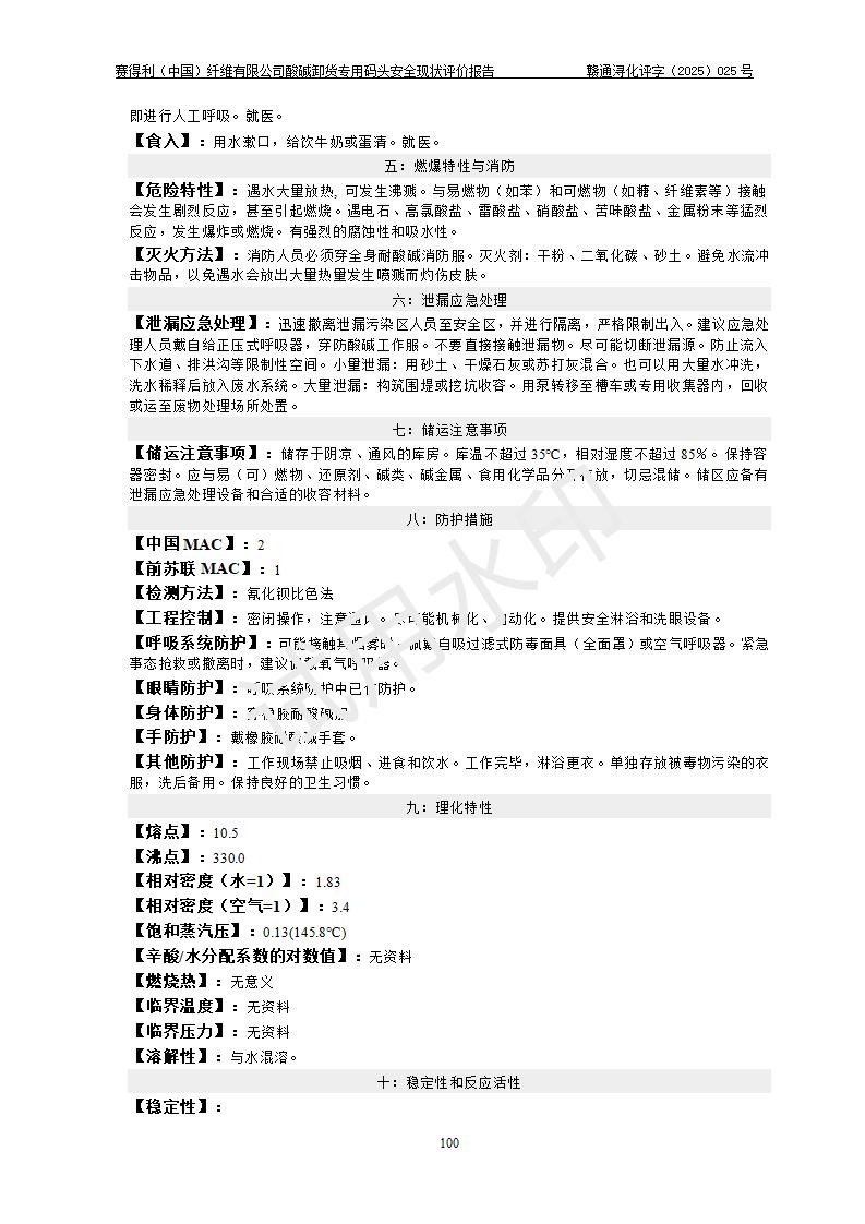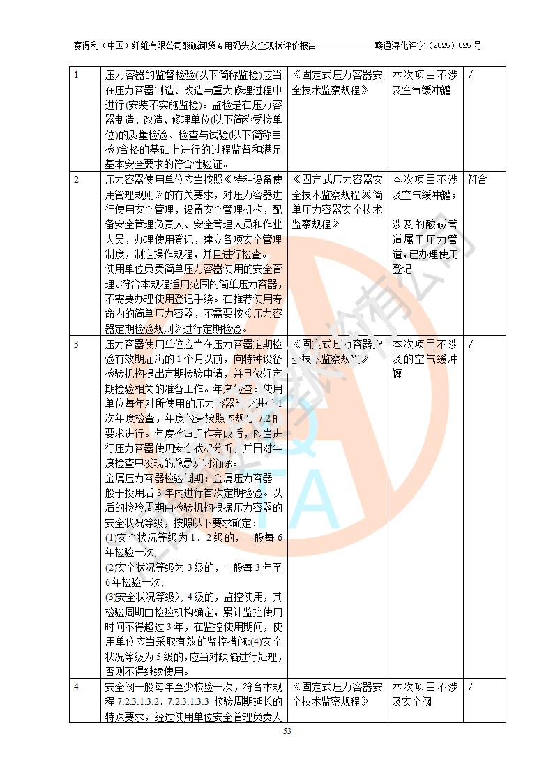評價(jià)結(jié)論 | 經(jīng)評價(jià)組評價(jià),賽得利(中國)纖維有限公司酸堿卸貨**碼頭配套安全裝置、防護(hù)設(shè)施以及采取的安全管理措施符合**有關(guān)法規(guī)、標(biāo)準(zhǔn)、規(guī)范要求,符合《港口經(jīng)營管理規(guī)定》《港口危險(xiǎn)貨物安全管理規(guī)定》等規(guī)定的安全生產(chǎn)條件;酸堿卸貨**碼頭風(fēng)險(xiǎn)可控,可滿足危險(xiǎn)貨物港口作業(yè)的安全生產(chǎn)條件。 | |||||