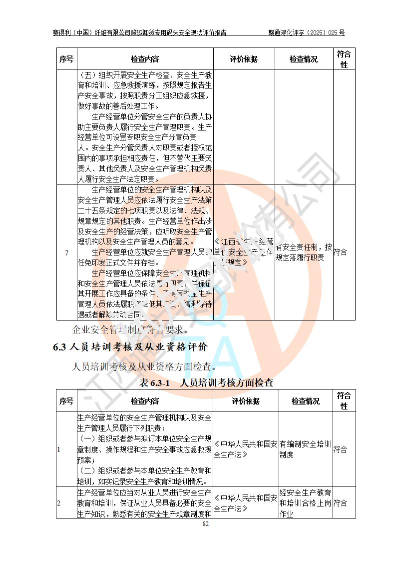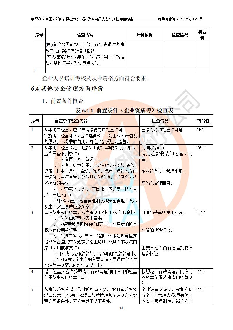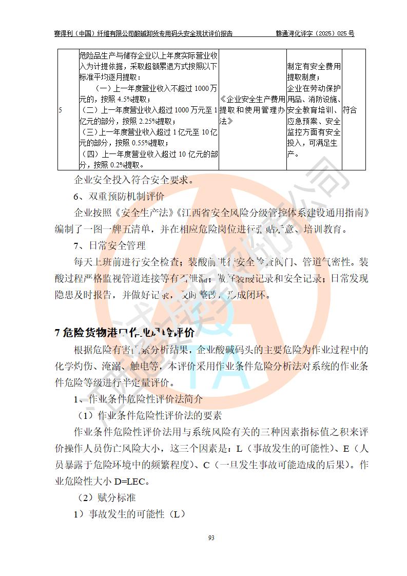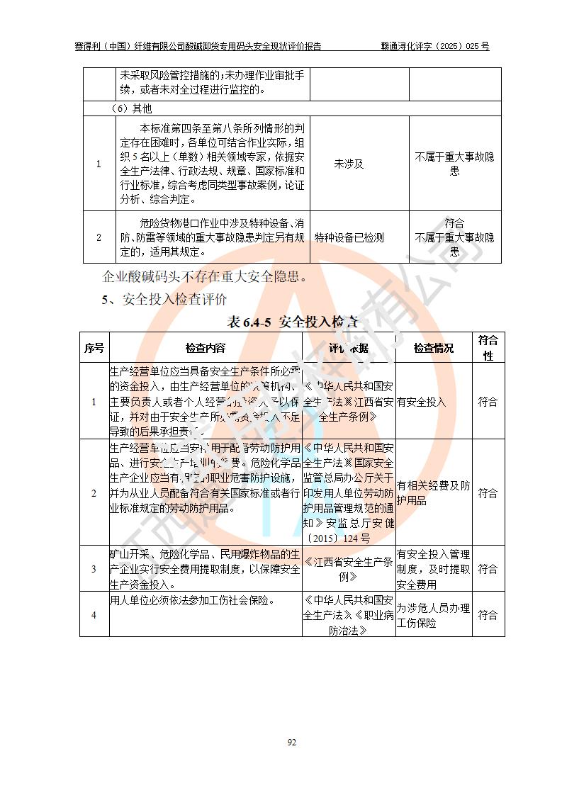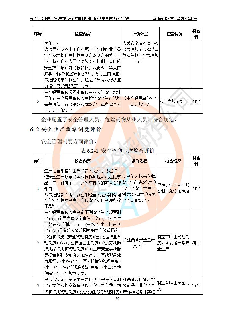 評價(jià)結(jié)論 | 經(jīng)評價(jià)組評價(jià),賽得利(中國)纖維有限公司酸堿卸貨**碼頭配套安全裝置、防護(hù)設(shè)施以及采取的安全管理措施符合**有關(guān)法規(guī)、標(biāo)準(zhǔn)、規(guī)范要求,符合《港口經(jīng)營管理規(guī)定》《港口危險(xiǎn)貨物安全管理規(guī)定》等規(guī)定的安全生產(chǎn)條件;酸堿卸貨**碼頭風(fēng)險(xiǎn)可控,可滿足危險(xiǎn)貨物港口作業(yè)的安全生產(chǎn)條件。 | |||||