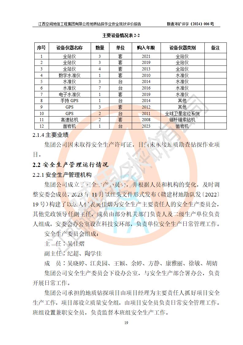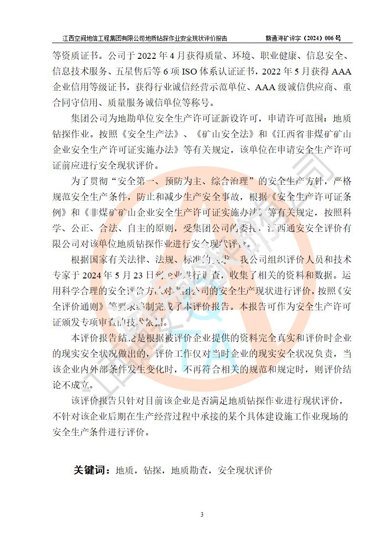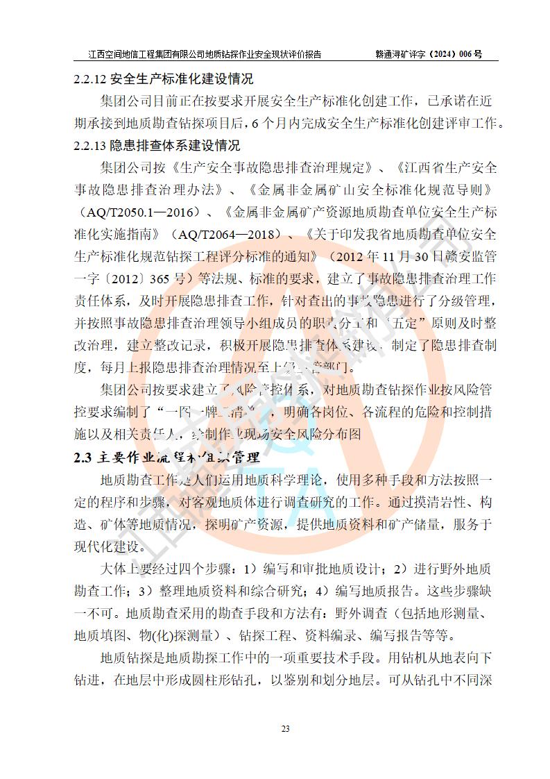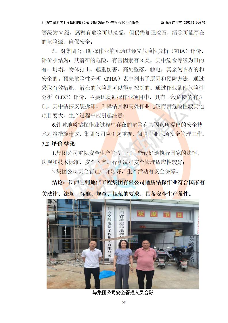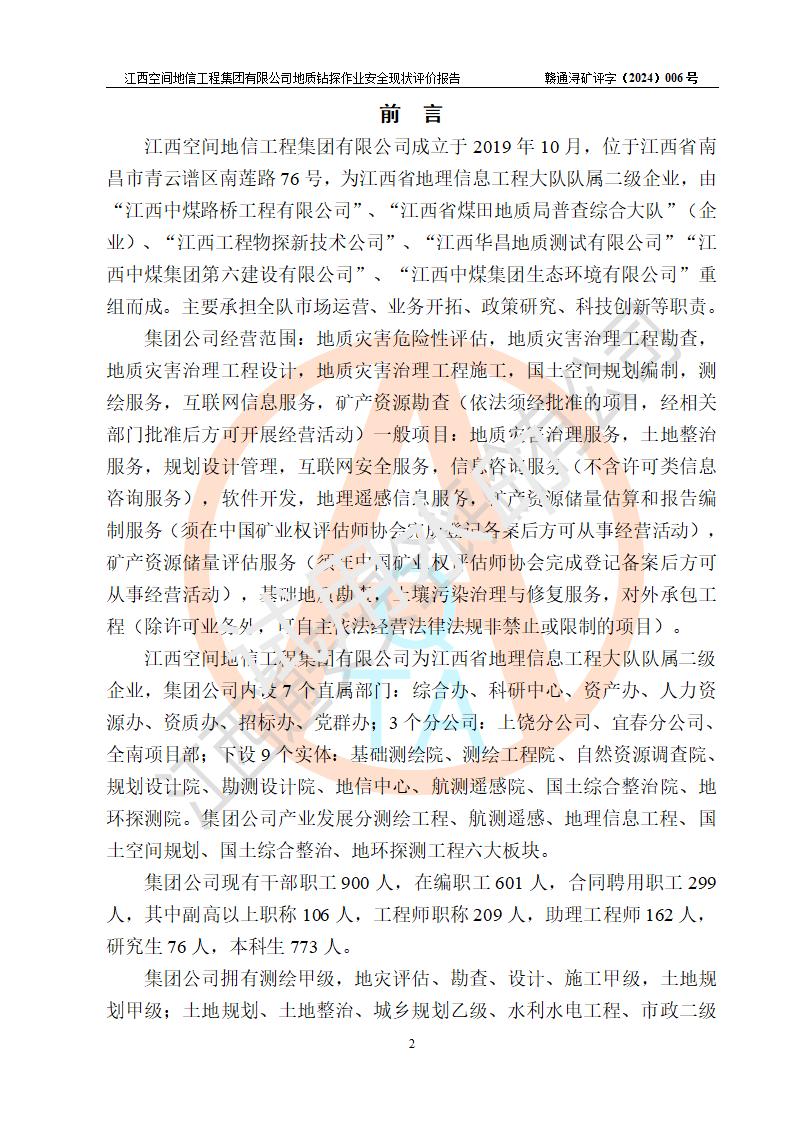 江西空間地信工程集團(tuán)有限公司成立于2019年10月,位于江西省南昌市青云譜區(qū)南蓮路76號(hào),為江西省地理信息工程大隊(duì)隊(duì)屬二級(jí)企業(yè),由“江西中煤路橋工程有限公司”、“江西省煤田地質(zhì)局普查綜合大隊(duì)”(企業(yè))、“江西工程物探新技術(shù)公司”、“江西華昌地質(zhì)測(cè)試有限公司”“江西中煤集團(tuán)第六建設(shè)有限公司”、“江西中煤集團(tuán)生態(tài)環(huán)境有限公司”重組而成。主要承擔(dān)全隊(duì)市場(chǎng)運(yùn)營(yíng)、業(yè)務(wù)開拓、政策研究、科技創(chuàng)新等職責(zé)。 集團(tuán)公司經(jīng)營(yíng)范圍:地質(zhì)災(zāi)害危險(xiǎn)性評(píng)估,地質(zhì)災(zāi)害治理工程勘查,地質(zhì)災(zāi)害治理工程設(shè)計(jì),地質(zhì)災(zāi)害治理工程施工,國(guó)土空間規(guī)劃編制,測(cè)繪服務(wù),互聯(lián)網(wǎng)信息服務(wù),礦產(chǎn)資源勘查(依法須經(jīng)批準(zhǔn)的項(xiàng)目,經(jīng)相關(guān)部門批準(zhǔn)后方可開展經(jīng)營(yíng)活動(dòng))一般項(xiàng)目:地質(zhì)災(zāi)害治理服務(wù),土地整治服務(wù),規(guī)劃設(shè)計(jì)管理,互聯(lián)網(wǎng)安全服務(wù),信息咨詢服務(wù)(不含許可類信息咨詢服務(wù)),軟件開發(fā),地理遙感信息服務(wù),礦產(chǎn)資源儲(chǔ)量估算和報(bào)告編制服務(wù)(須在中國(guó)礦業(yè)權(quán)評(píng)估師**完成登記備案后方可從事經(jīng)營(yíng)活動(dòng)),礦產(chǎn)資源儲(chǔ)量評(píng)估服務(wù)(須在中國(guó)礦業(yè)權(quán)評(píng)估師**完成登記備案后方可從事經(jīng)營(yíng)活動(dòng)),基礎(chǔ)地質(zhì)勘查,土壤污染治理與修復(fù)服務(wù),對(duì)外承包工程(除許可業(yè)務(wù)外,可自主依法經(jīng)營(yíng)法律法規(guī)非禁止或限制的項(xiàng)目)。 江西空間地信工程集團(tuán)有限公司為江西省地理信息工程大隊(duì)隊(duì)屬二級(jí)企業(yè),集團(tuán)公司內(nèi)設(shè)7個(gè)直屬部門:綜合辦、科研中心、資產(chǎn)辦、人力資源辦、資質(zhì)辦、招標(biāo)辦、黨群辦;3個(gè)分公司:上饒分公司、宜春分公司、全南項(xiàng)目部;下設(shè)9個(gè)實(shí)體:基礎(chǔ)測(cè)繪院、測(cè)繪工程院、自然資源調(diào)查院、規(guī)劃設(shè)計(jì)院、勘測(cè)設(shè)計(jì)院、地信中心、航測(cè)遙感院、國(guó)土綜合整治院、地環(huán)探測(cè)院。集團(tuán)公司產(chǎn)業(yè)發(fā)展分測(cè)繪工程、航測(cè)遙感、地理信息工程、國(guó)土空間規(guī)劃、國(guó)土綜合整治、地環(huán)探測(cè)工程六大板塊。 集團(tuán)公司現(xiàn)有干部職工900人,在編職工601人,合同聘用職工299人,其中副高以上職稱106人,工程師職稱209人,助理工程師162人,研究生76人,本科生773人。 集團(tuán)公司擁有測(cè)繪**,地災(zāi)評(píng)估、勘查、設(shè)計(jì)、施工**,土地規(guī)劃**;土地規(guī)劃、土地整治、城鄉(xiāng)規(guī)劃乙級(jí)、水利水電工程、市政二級(jí)等資質(zhì)證書。公司于2022年4月獲得質(zhì)量、環(huán)境、職業(yè)健康、信息安全、信息技術(shù)服務(wù)、五星售后等6項(xiàng)ISO體系認(rèn)證證書,2022年5月獲得AAA企業(yè)信用等級(jí)證書,獲得行業(yè)誠(chéng)信經(jīng)營(yíng)示范單位、AAA級(jí)誠(chéng)信供應(yīng)商、重合同守信用、質(zhì)量服務(wù)誠(chéng)信單位等稱號(hào)。 集團(tuán)公司為地勘單位安全生產(chǎn)許可證新設(shè)許可,申請(qǐng)?jiān)S可范圍:地質(zhì)鉆探作業(yè)。按照《安全生產(chǎn)法》、《礦山安全法》和《江西省非煤礦礦山企業(yè)安全生產(chǎn)許可證實(shí)施辦法》等有關(guān)規(guī)定,該單位在申請(qǐng)安全生產(chǎn)許可證前應(yīng)進(jìn)行安全現(xiàn)狀評(píng)價(jià)。 |