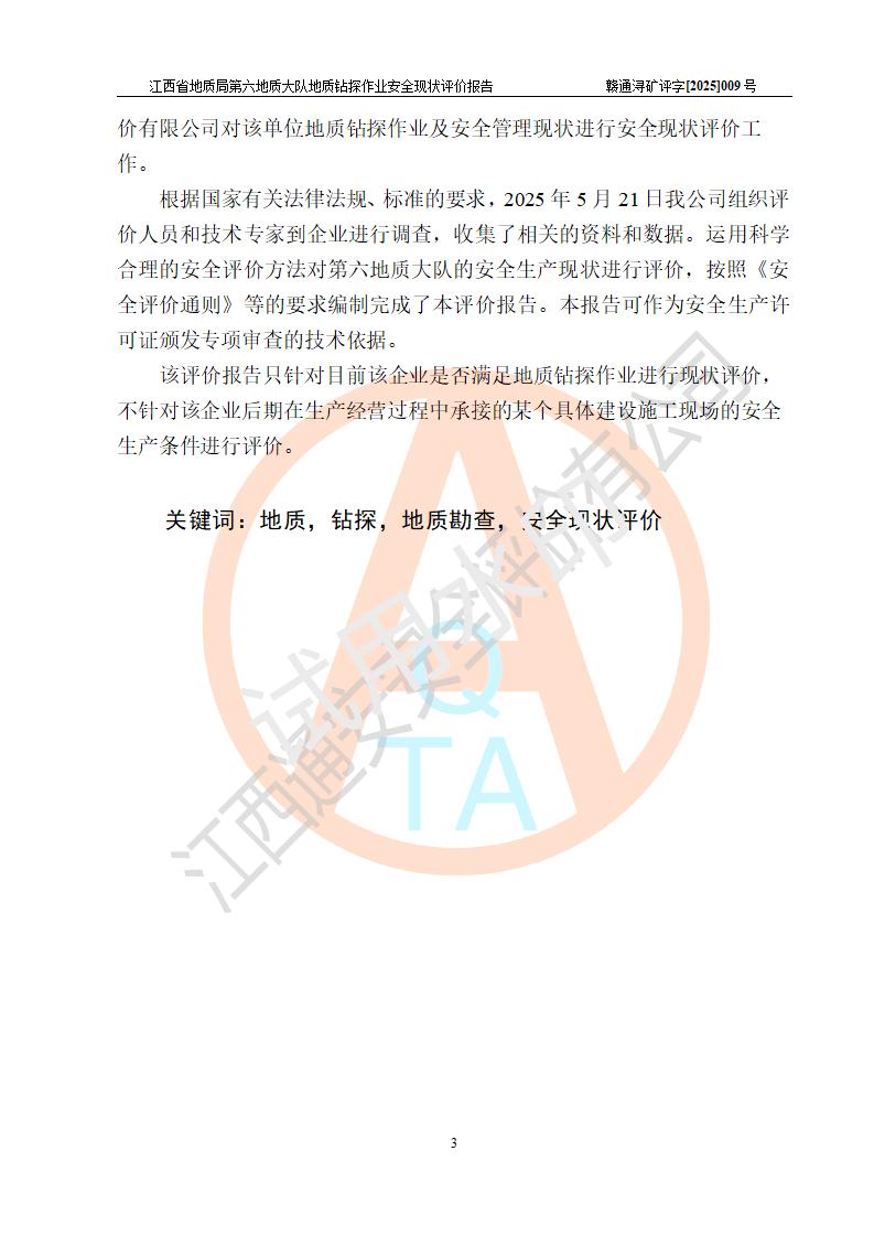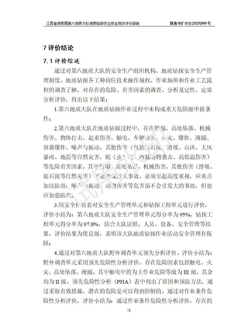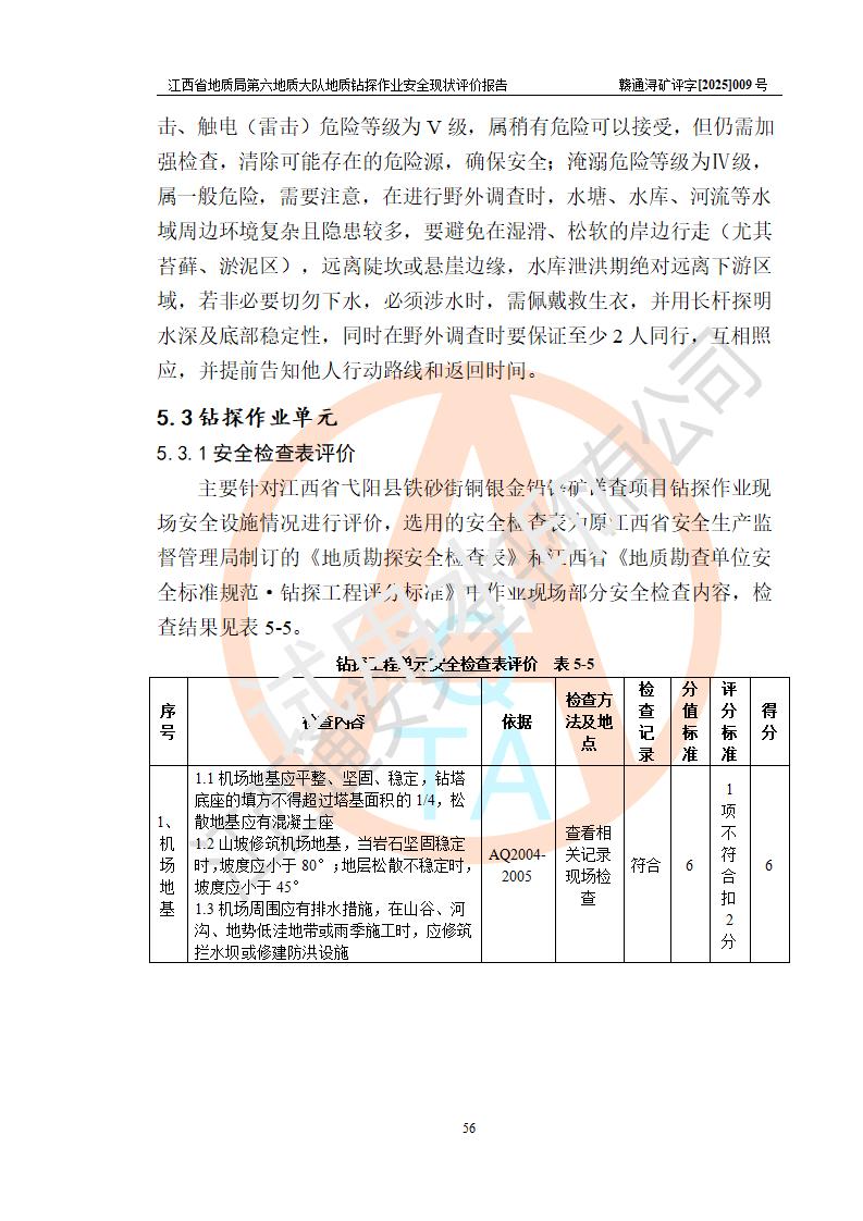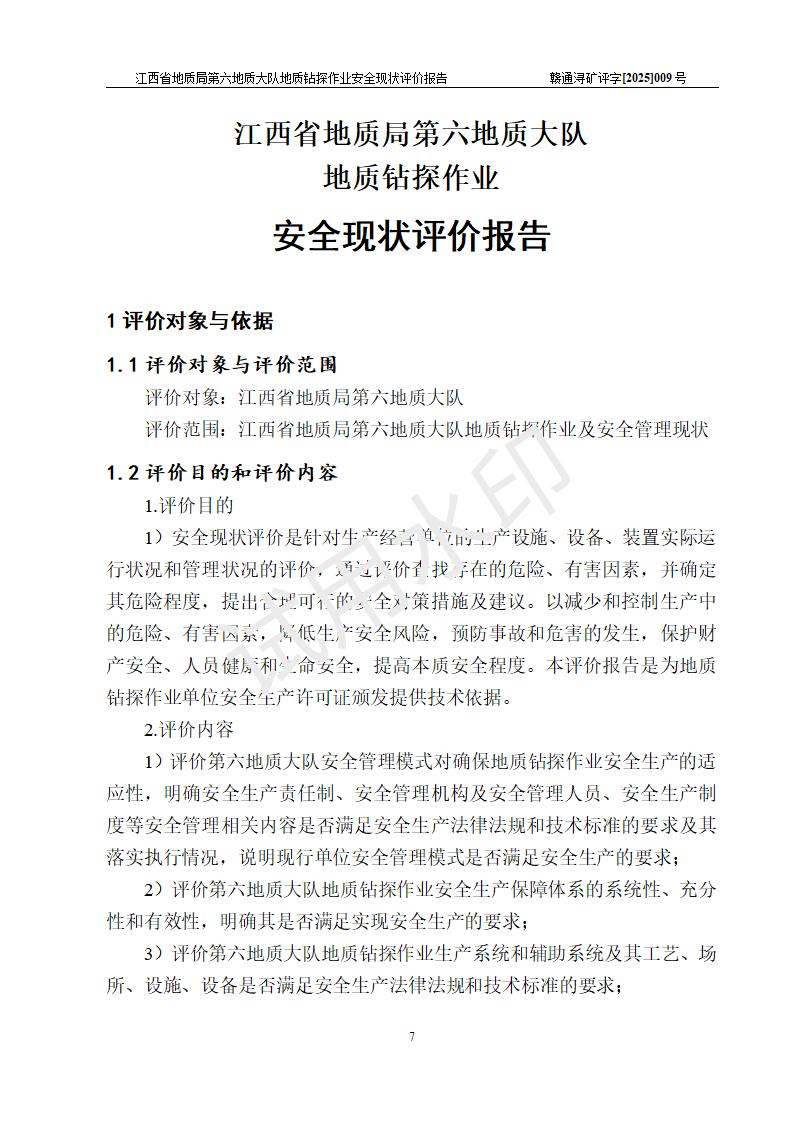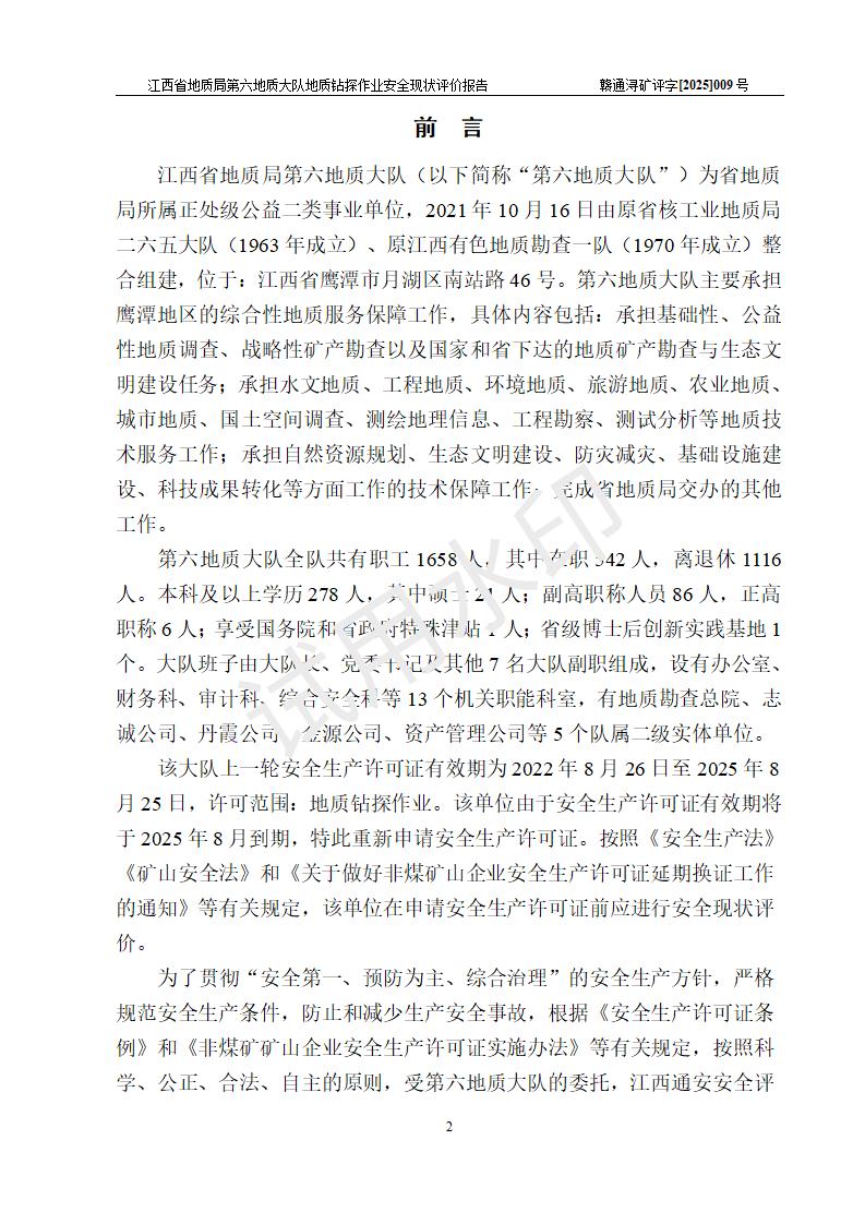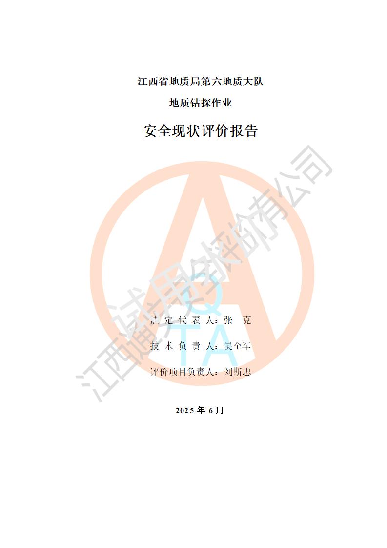 報告名稱 | 江西省地質局第六地質大隊地質鉆探作業(yè)安全現(xiàn)狀評價報告 | |||||