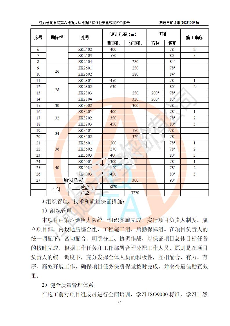 項目簡介 | 江西省地質局第六地質大隊(以下簡稱“第六地質大隊”)為省地質局所屬正處級公益二類事業(yè)單位,2021年10月16日由原省核工業(yè)地質局二六五大隊(1963年成立)、原江西有色地質勘查一隊(1970年成立)整合組建,位于:江西省鷹潭市月湖區(qū)南站路46號。第六地質大隊主要承擔鷹潭地區(qū)的綜合性地質服務保障工作,具體內容包括:承擔基礎性、公益性地質調查、戰(zhàn)略性礦產(chǎn)勘查以及**和省下達的地質礦產(chǎn)勘查與生態(tài)文明建設任務;承擔水文地質、工程地質、環(huán)境地質、旅游地質、農(nóng)業(yè)地質、城市地質、國土空間調查、測繪地理信息、工程勘察、測試分析等地質技術服務工作;承擔自然資源規(guī)劃、生態(tài)文明建設、防災減災、基礎設施建設、科技成果轉化等方面工作的技術保障工作;完成省地質局交辦的其他工作。 第六地質大隊全隊共有職工1658人,其中在職542人,離退休1116人。本科及以上學歷278人,其中碩士21人;副高職稱人員86人,正高職稱6人;享受***和省**特殊津貼1人;省級博士后創(chuàng)新實踐基地1個。大隊班子由大隊長、黨委書記及其他7名大隊副職組成,設有辦公室、財務科、審計科、綜合安全科等13個機關職能科室,有地質勘查總院、志誠公司、丹霞公司、金源公司、資產(chǎn)管理公司等5個隊屬二級實體單位。 該大隊上一輪安全生產(chǎn)許可證**期為2022年8月26日至2025年8月25日,許可范圍:地質鉆探作業(yè)。該單位由于安全生產(chǎn)許可證**期將于2025年8月到期,特此重新申請安全生產(chǎn)許可證。按照《安全生產(chǎn)法》、《礦山安全法》和《關于做好非煤礦山企業(yè)安全生產(chǎn)許可證延期換證工作的通知》等有關規(guī)定,該單位在申請安全生產(chǎn)許可證前應進行安全現(xiàn)狀評價。 | |||||