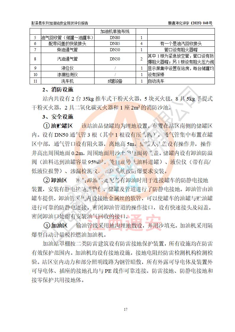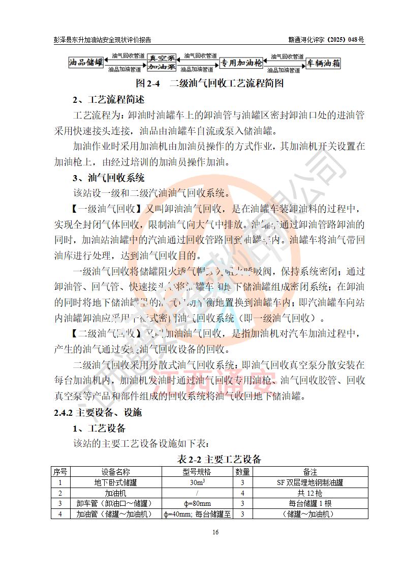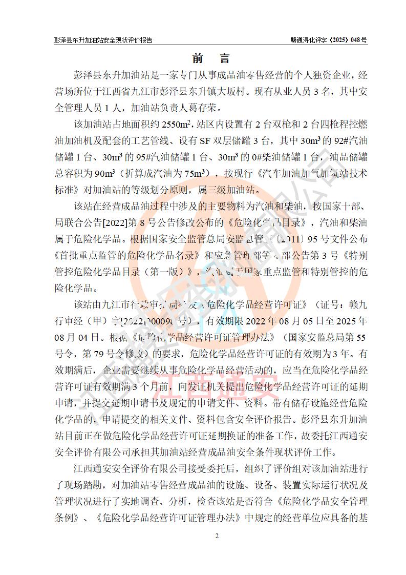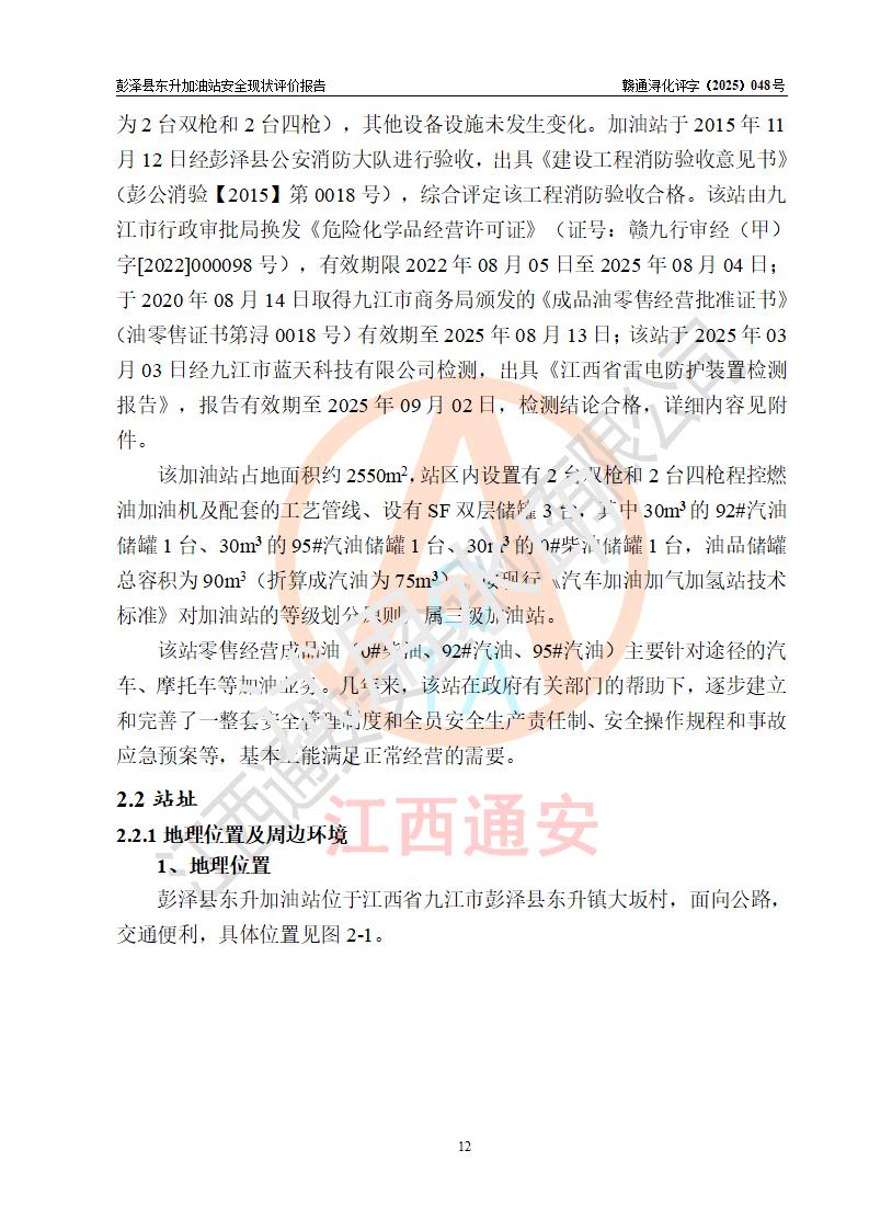 項(xiàng)目簡(jiǎn)介 | 彭澤縣東升加油站是一家專門從事成品油零售經(jīng)營(yíng)的個(gè)人獨(dú)資企業(yè),經(jīng)營(yíng)場(chǎng)所位于江西省九江市彭澤縣東升鎮(zhèn)大坂村?,F(xiàn)有從業(yè)人員3名,其中安全管理人員1人,加油站負(fù)責(zé)人葛存榮。 該加油站占地面積約2550m2,站區(qū)內(nèi)設(shè)置有2臺(tái)雙槍和2臺(tái)四槍程控燃油加油機(jī)及配套的工藝管線、設(shè)有SF雙層儲(chǔ)罐3臺(tái),其中30m3的92#汽油儲(chǔ)罐1臺(tái)、30m3的95#汽油儲(chǔ)罐1臺(tái)、30m3的0#柴油儲(chǔ)罐1臺(tái),油品儲(chǔ)罐總?cè)莘e為90m3(折算成汽油為75m3),按現(xiàn)行《汽車加油加氣加氫站技術(shù)標(biāo)準(zhǔn)》對(duì)加油站的等級(jí)劃分原則,屬三級(jí)加油站。 該站由九江市行政審批局換發(fā)《危險(xiǎn)化學(xué)品經(jīng)營(yíng)許可證》(證號(hào):贛九行審經(jīng)(甲)字[2022]000098號(hào)),**期限2022年08月05日至2025年08月04日日。 | |||