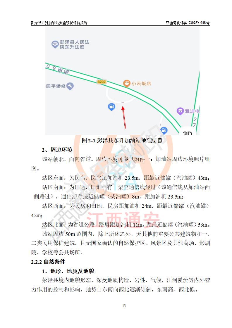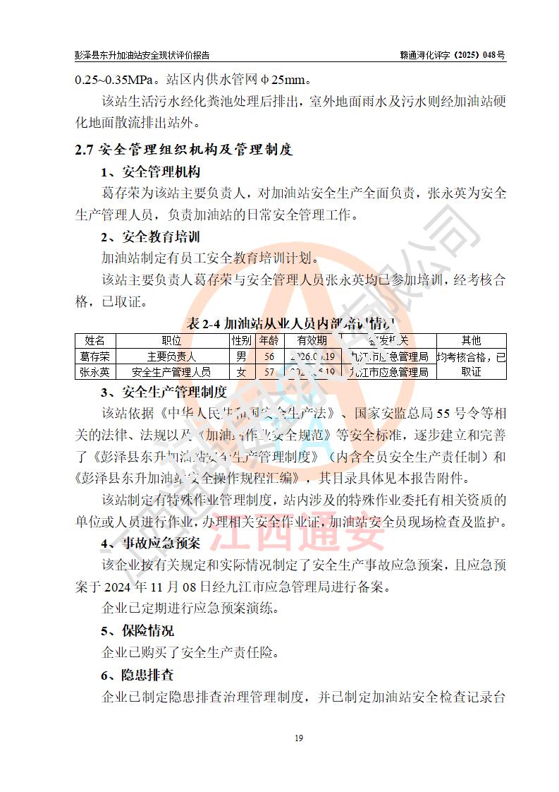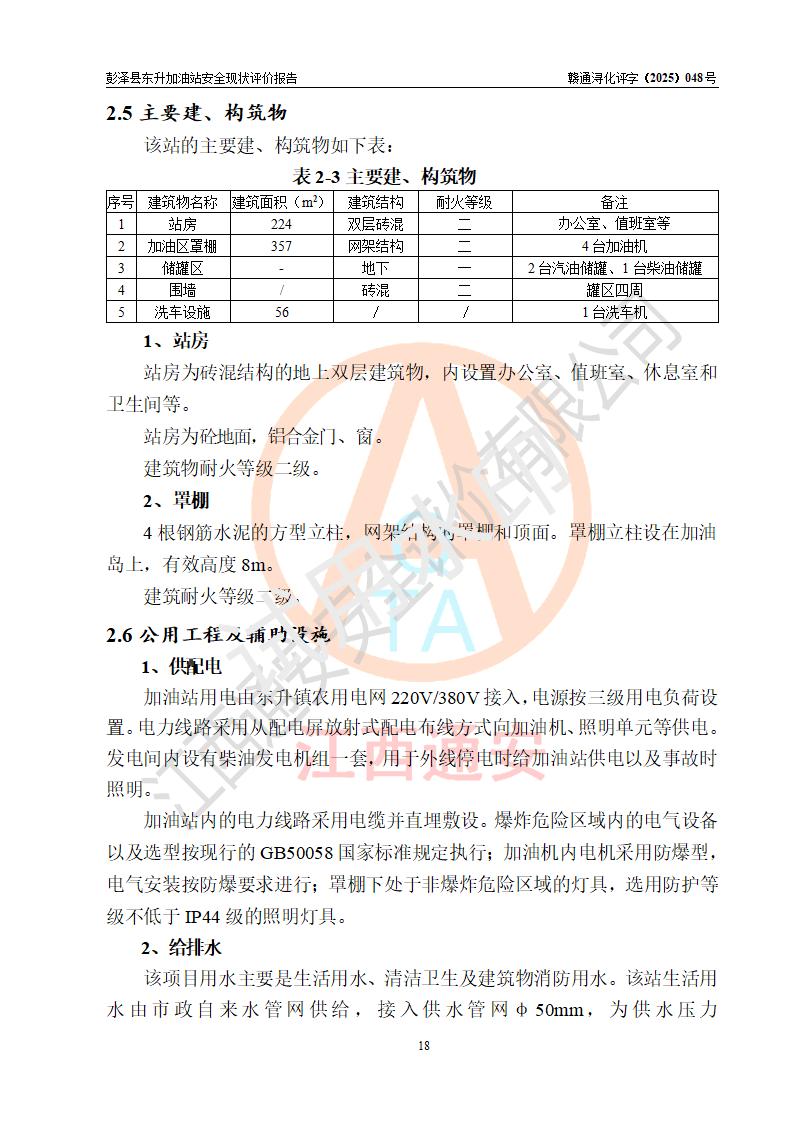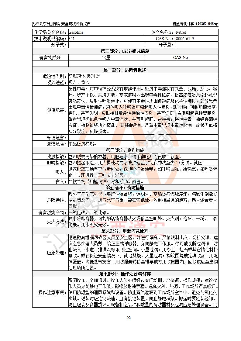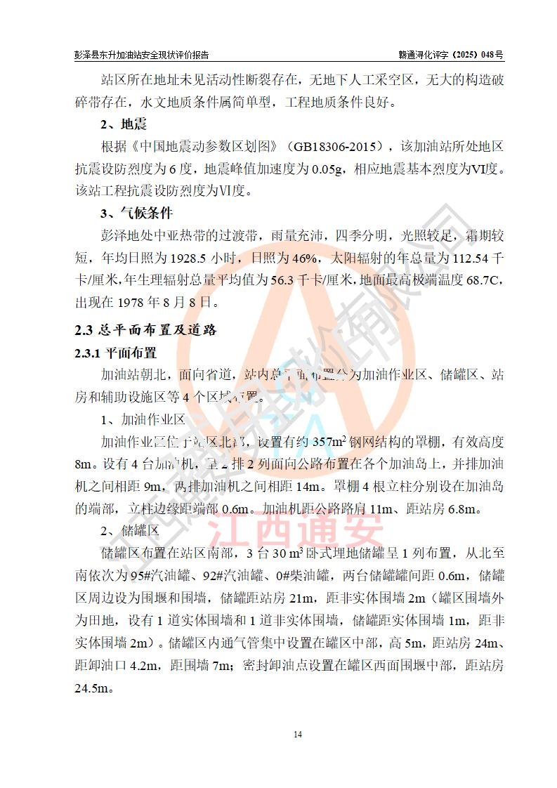 項(xiàng)目簡(jiǎn)介 | 彭澤縣東升加油站是一家專門從事成品油零售經(jīng)營(yíng)的個(gè)人獨(dú)資企業(yè),經(jīng)營(yíng)場(chǎng)所位于江西省九江市彭澤縣東升鎮(zhèn)大坂村?,F(xiàn)有從業(yè)人員3名,其中安全管理人員1人,加油站負(fù)責(zé)人葛存榮。 該加油站占地面積約2550m2,站區(qū)內(nèi)設(shè)置有2臺(tái)雙槍和2臺(tái)四槍程控燃油加油機(jī)及配套的工藝管線、設(shè)有SF雙層儲(chǔ)罐3臺(tái),其中30m3的92#汽油儲(chǔ)罐1臺(tái)、30m3的95#汽油儲(chǔ)罐1臺(tái)、30m3的0#柴油儲(chǔ)罐1臺(tái),油品儲(chǔ)罐總?cè)莘e為90m3(折算成汽油為75m3),按現(xiàn)行《汽車加油加氣加氫站技術(shù)標(biāo)準(zhǔn)》對(duì)加油站的等級(jí)劃分原則,屬三級(jí)加油站。 該站由九江市行政審批局換發(fā)《危險(xiǎn)化學(xué)品經(jīng)營(yíng)許可證》(證號(hào):贛九行審經(jīng)(甲)字[2022]000098號(hào)),**期限2022年08月05日至2025年08月04日日。 | |||