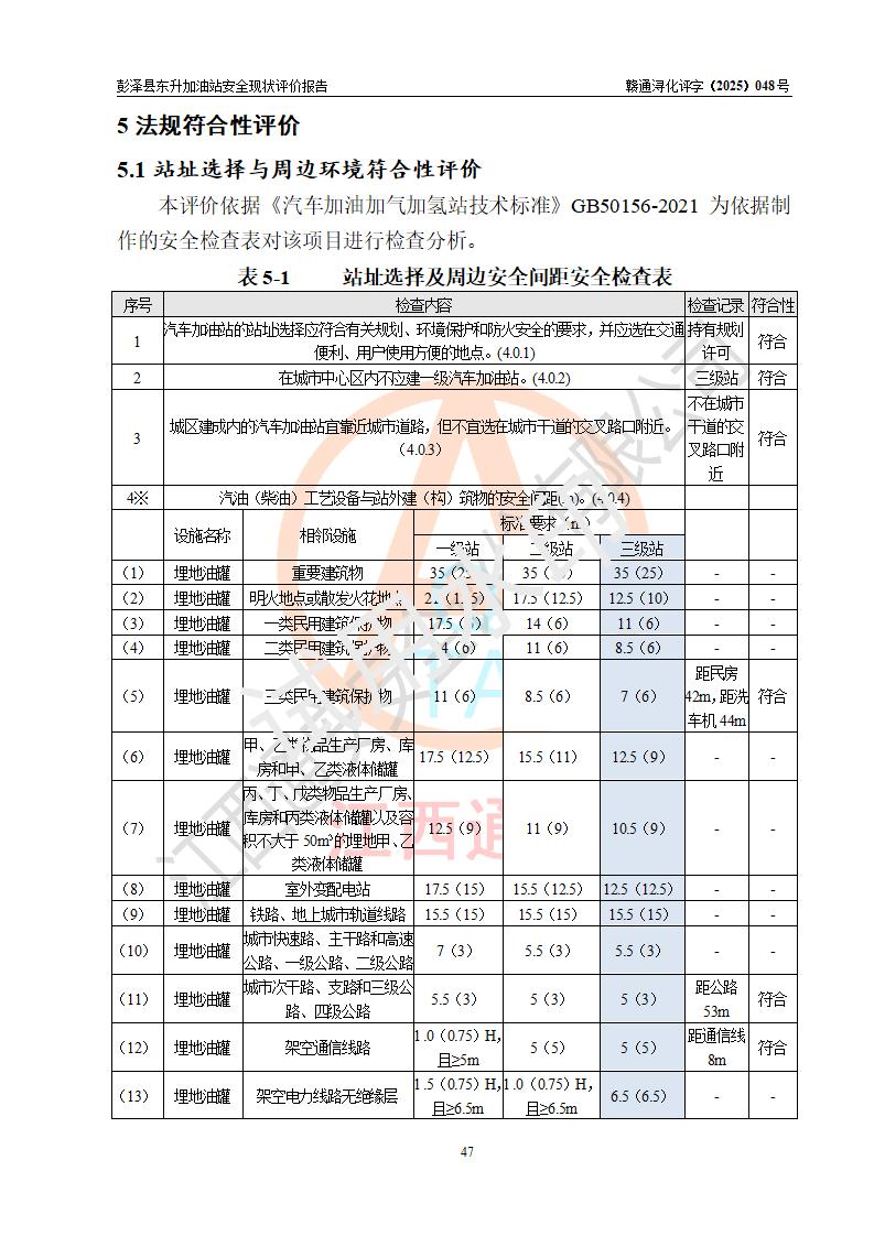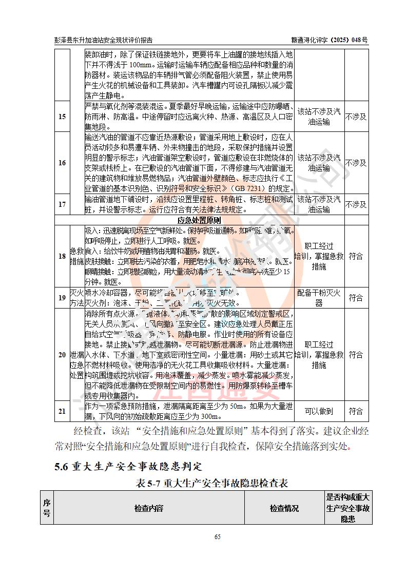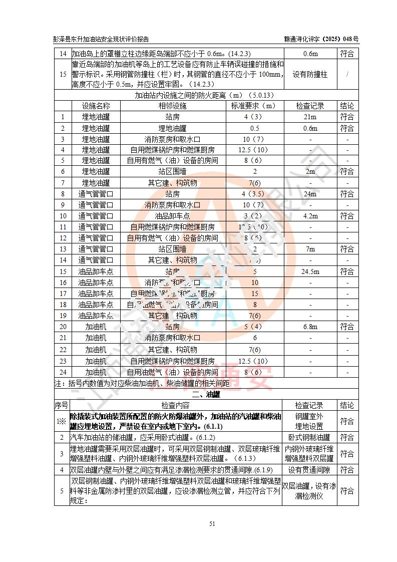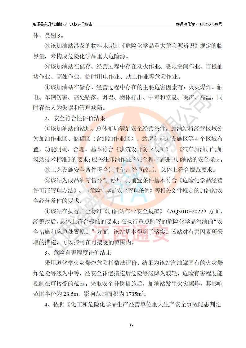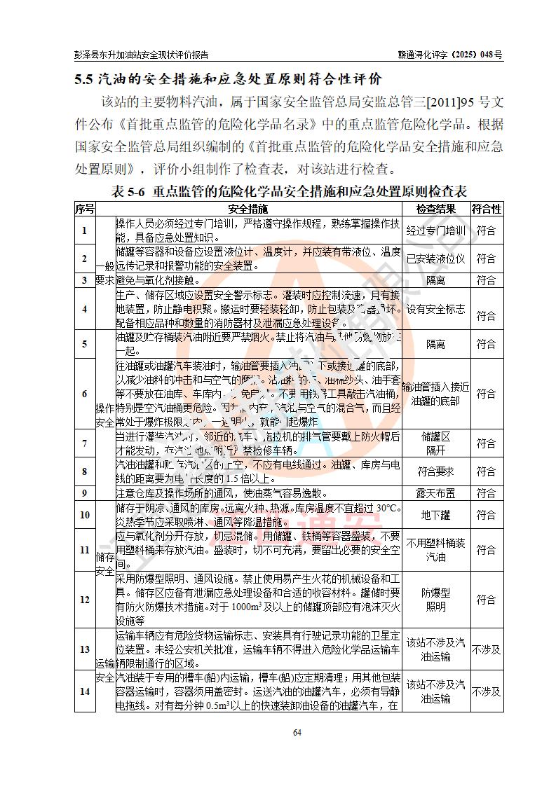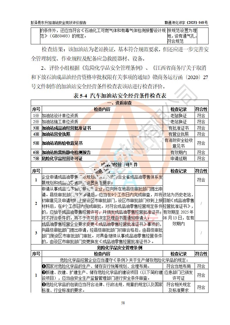 評(píng)價(jià)結(jié)論 | 彭澤縣東升加油站涉及的安全條件、安全經(jīng)營(yíng)條件、安全生產(chǎn)管理符合《危險(xiǎn)化學(xué)品經(jīng)營(yíng)許可證管理辦法》、《汽車加油加氣加氫站技術(shù)標(biāo)準(zhǔn)》等**有關(guān)法規(guī)、標(biāo)準(zhǔn)、規(guī)范要求,能滿足危險(xiǎn)化學(xué)品經(jīng)營(yíng)安全條件。 | |||