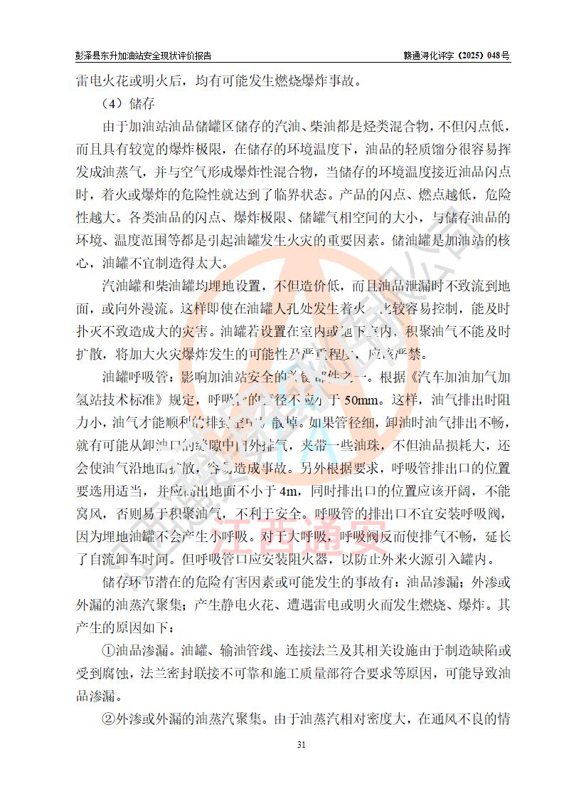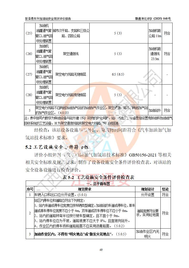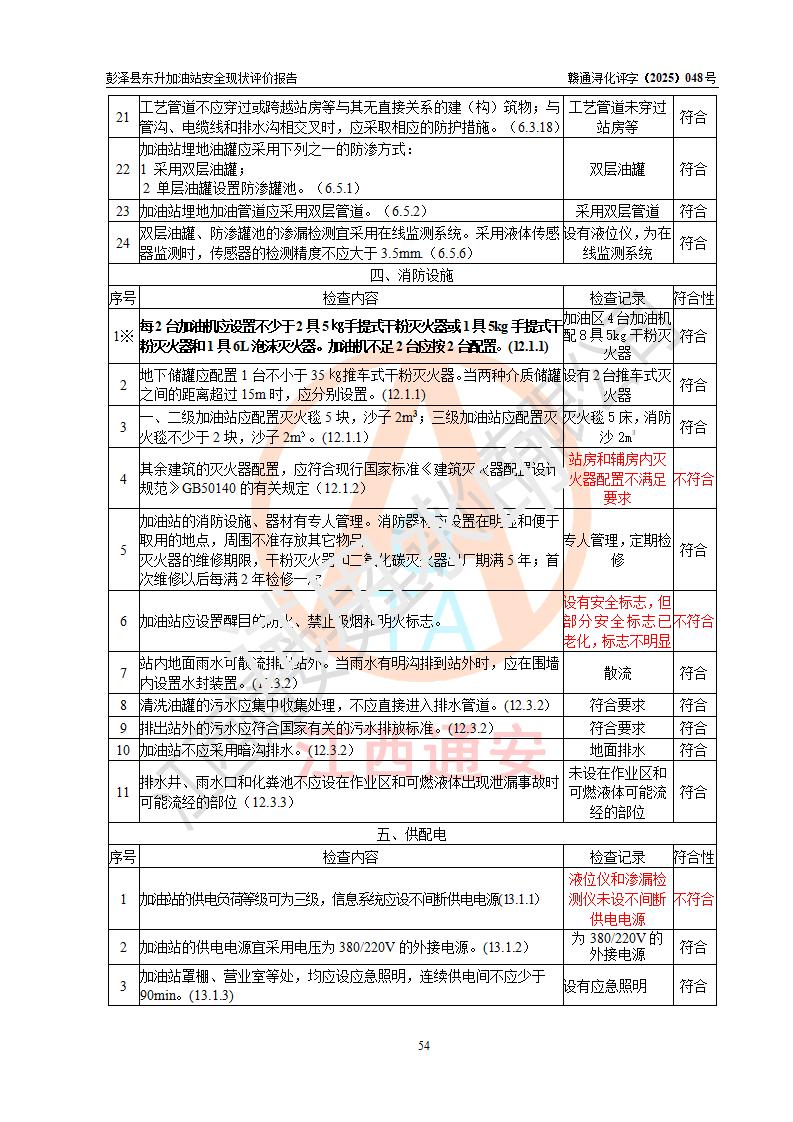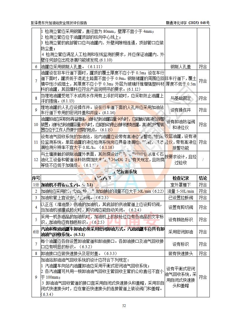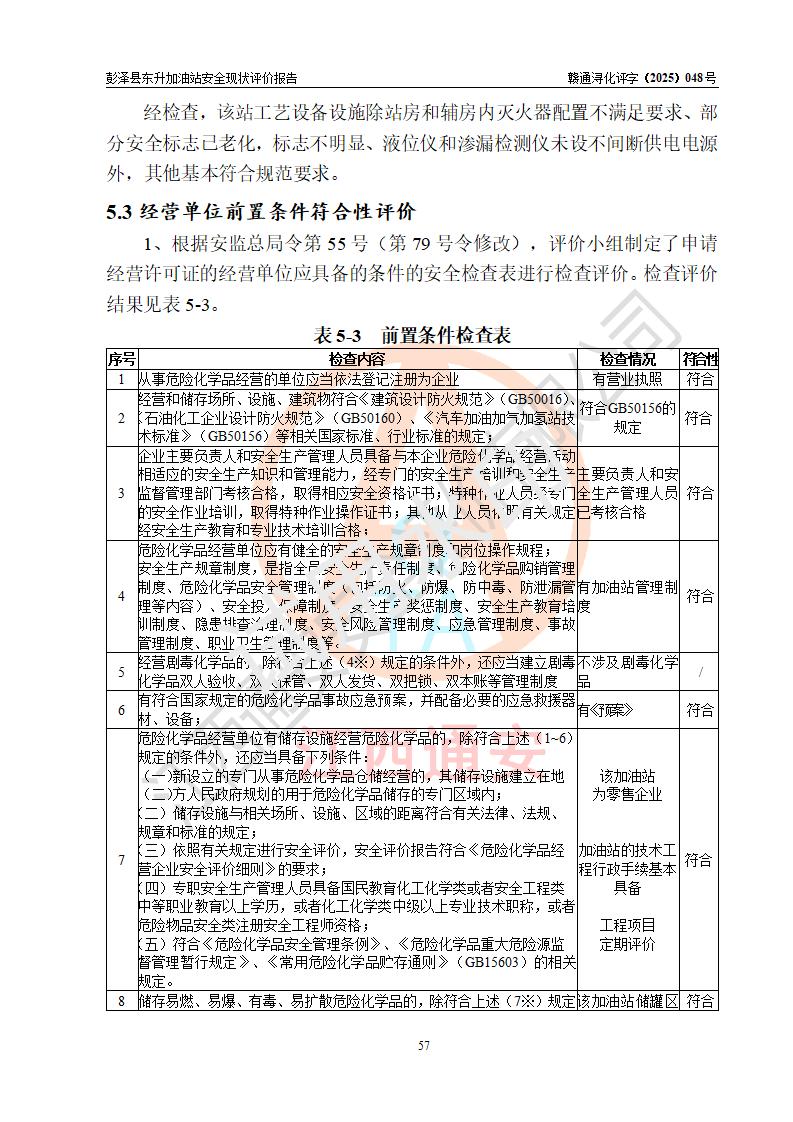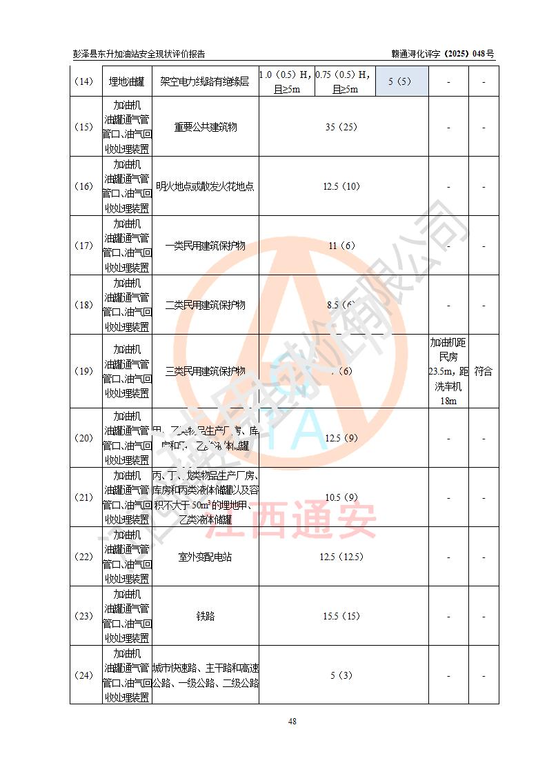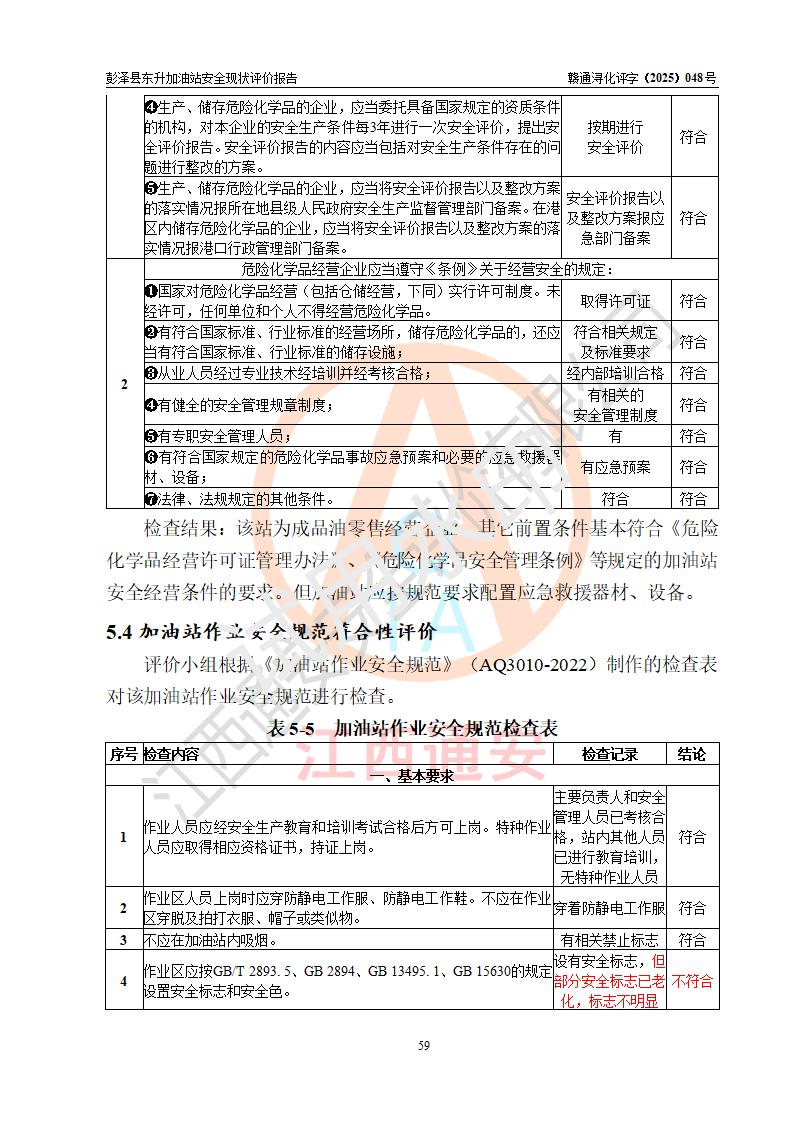 評(píng)價(jià)結(jié)論 | 彭澤縣東升加油站涉及的安全條件、安全經(jīng)營(yíng)條件、安全生產(chǎn)管理符合《危險(xiǎn)化學(xué)品經(jīng)營(yíng)許可證管理辦法》、《汽車加油加氣加氫站技術(shù)標(biāo)準(zhǔn)》等**有關(guān)法規(guī)、標(biāo)準(zhǔn)、規(guī)范要求,能滿足危險(xiǎn)化學(xué)品經(jīng)營(yíng)安全條件。 | |||