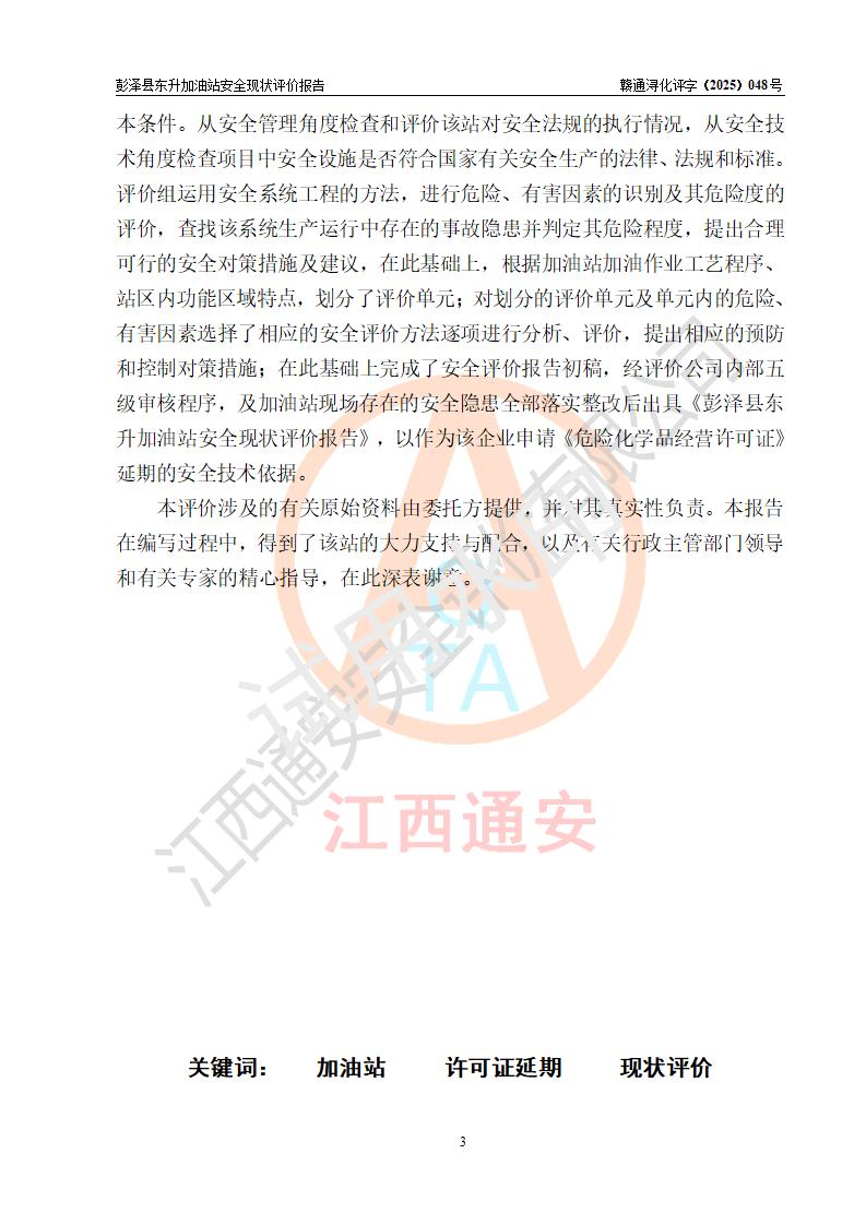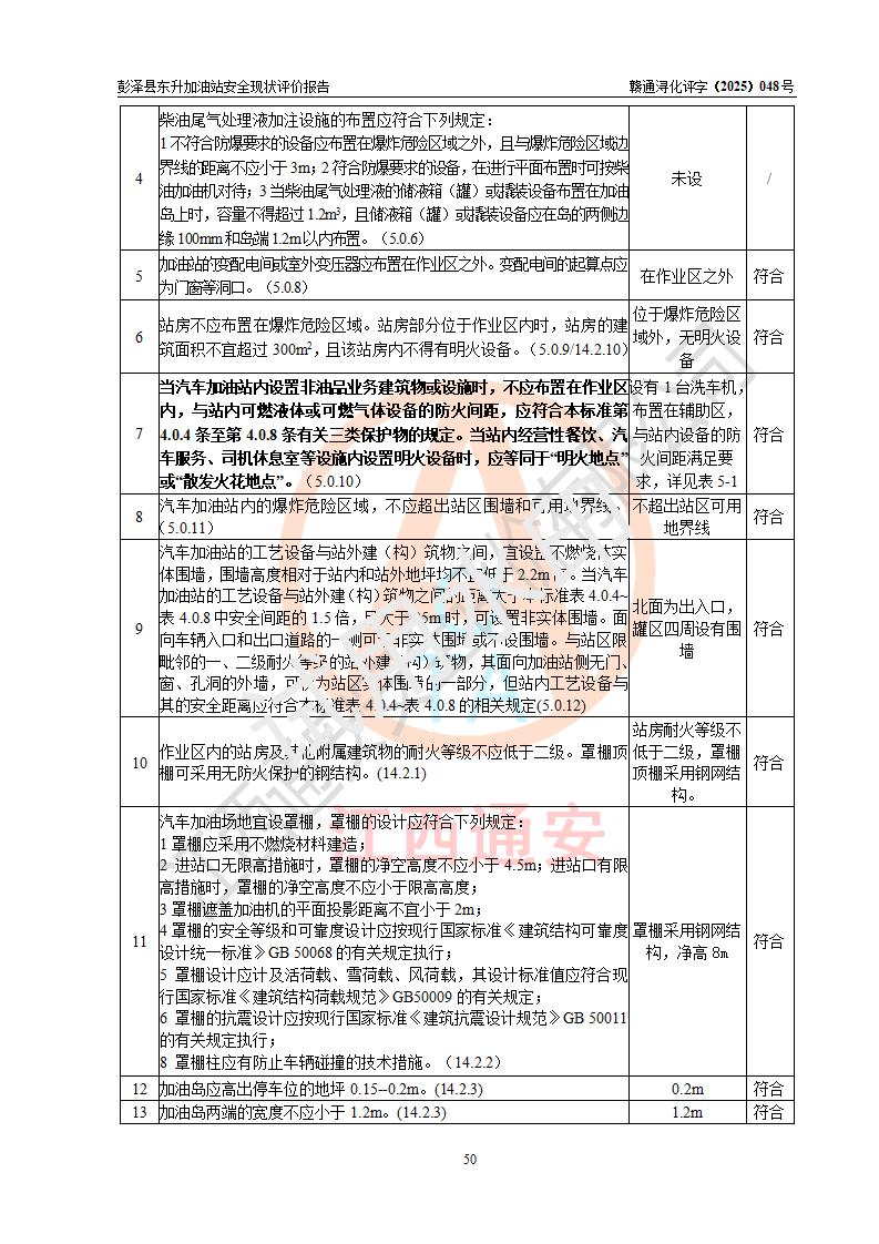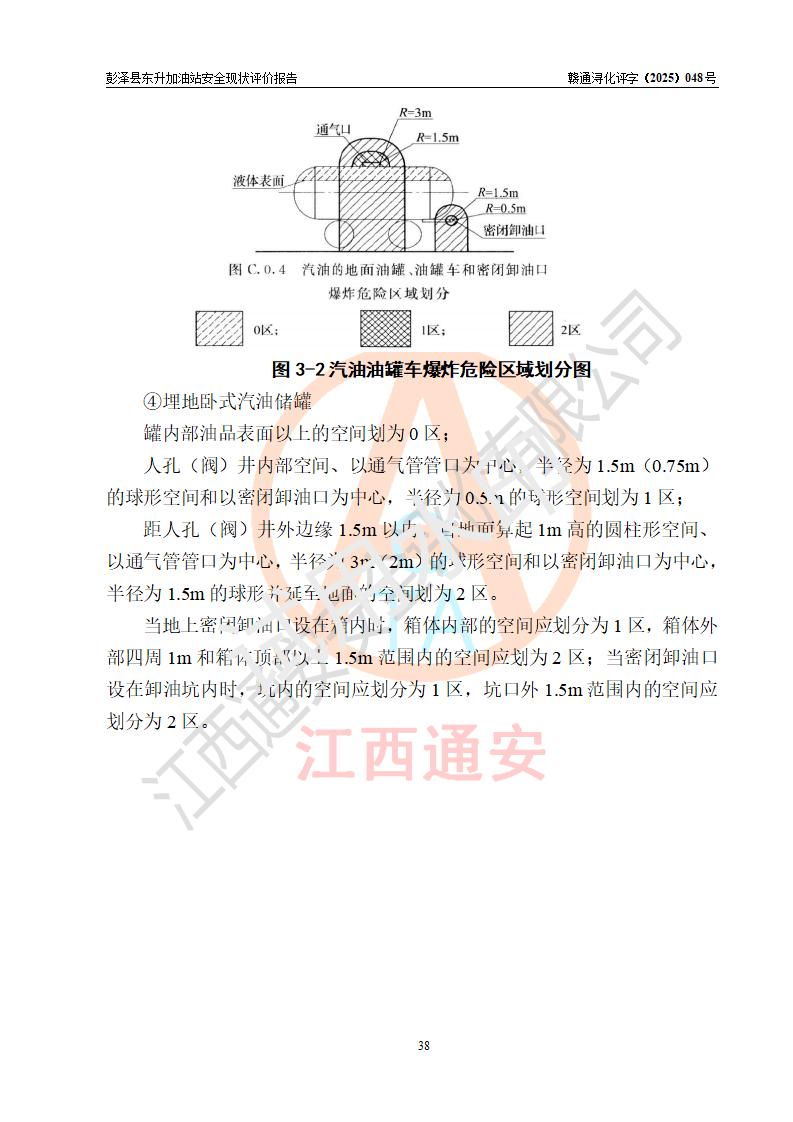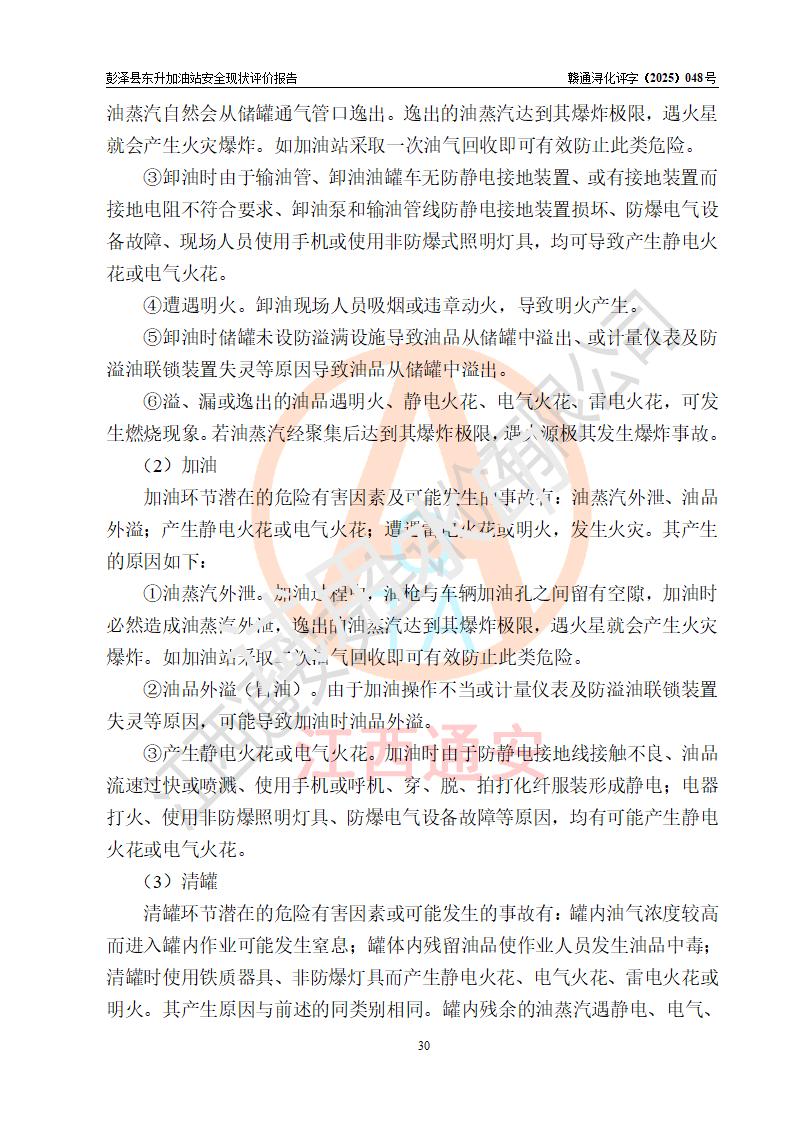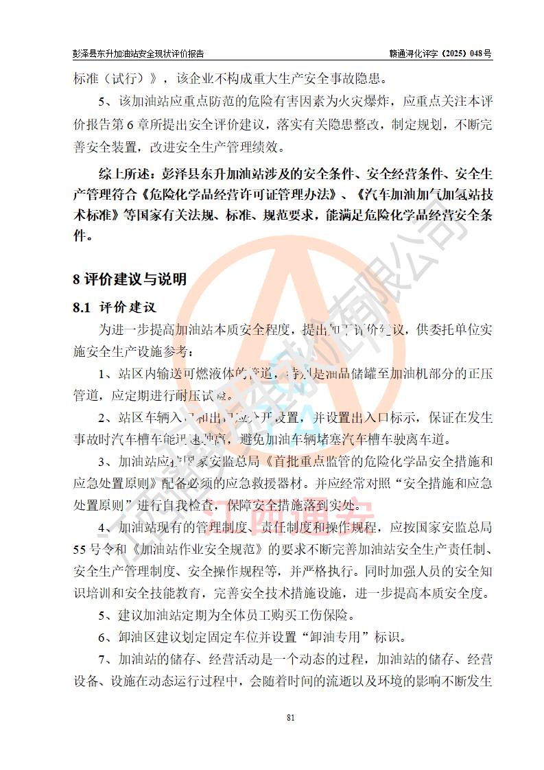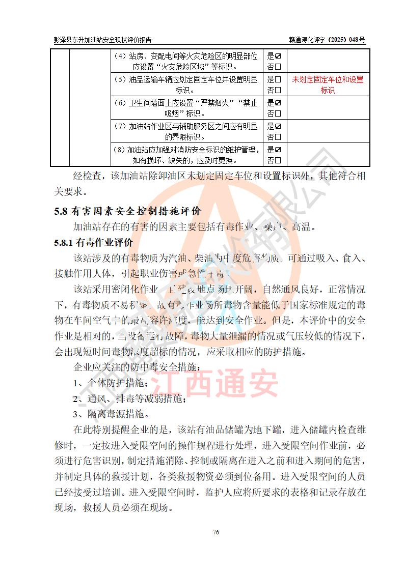 評(píng)價(jià)結(jié)論 | 彭澤縣東升加油站涉及的安全條件、安全經(jīng)營(yíng)條件、安全生產(chǎn)管理符合《危險(xiǎn)化學(xué)品經(jīng)營(yíng)許可證管理辦法》、《汽車加油加氣加氫站技術(shù)標(biāo)準(zhǔn)》等**有關(guān)法規(guī)、標(biāo)準(zhǔn)、規(guī)范要求,能滿足危險(xiǎn)化學(xué)品經(jīng)營(yíng)安全條件。 | |||