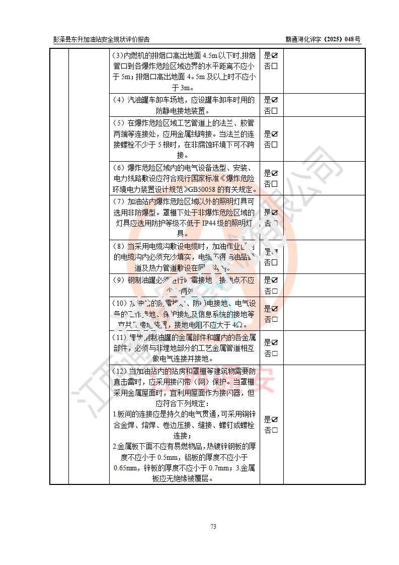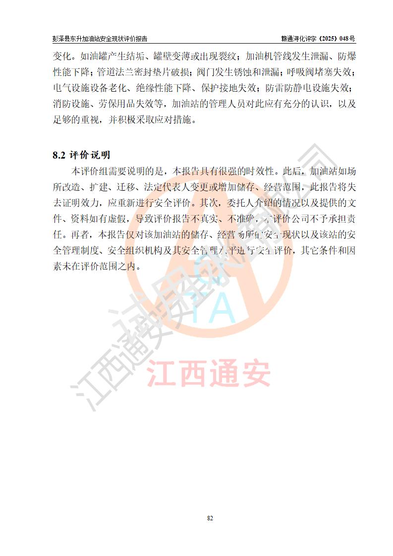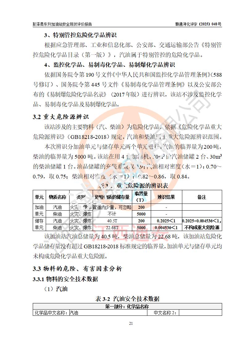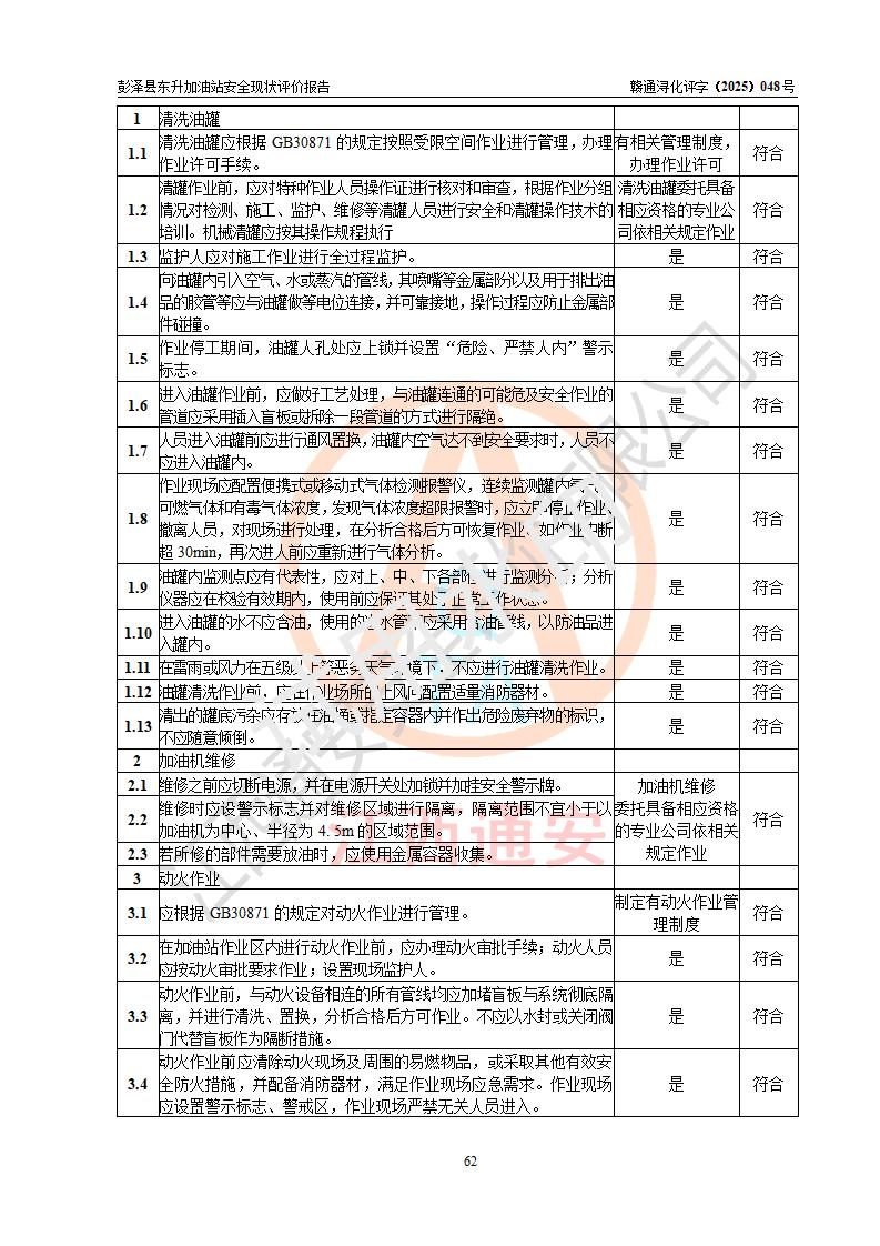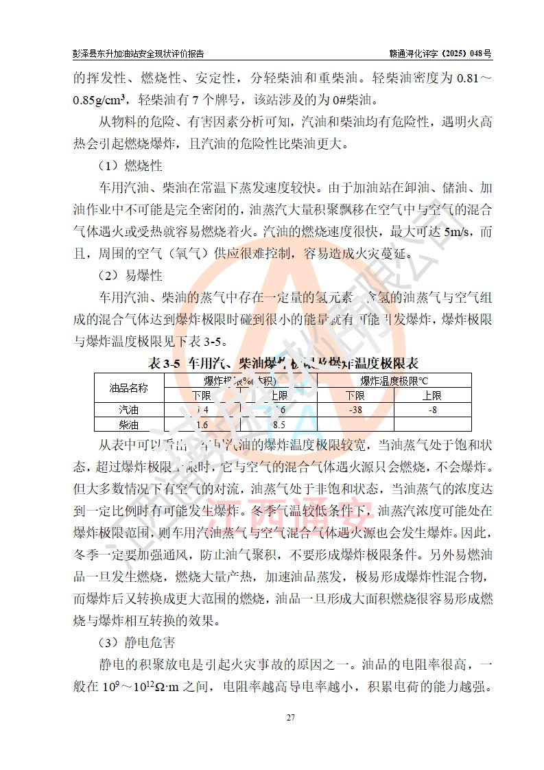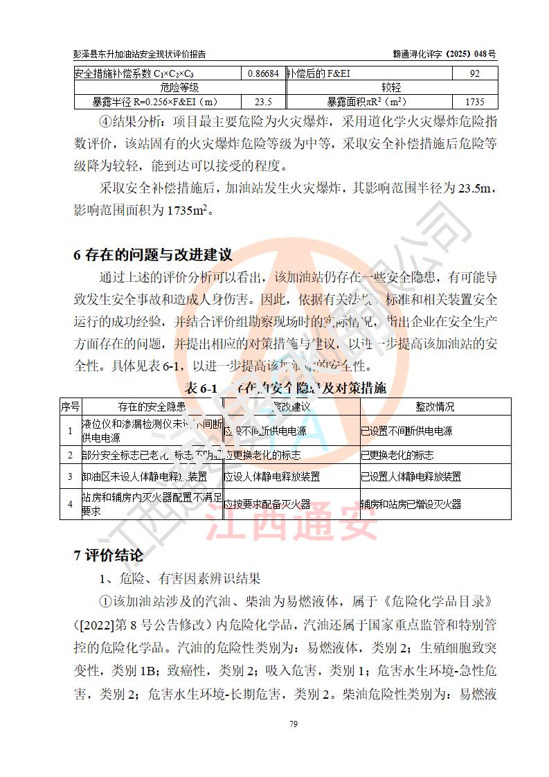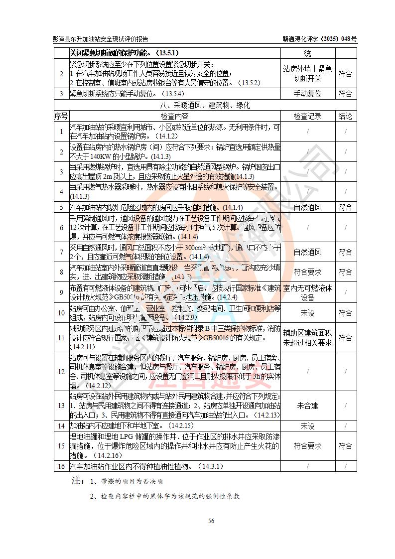 評(píng)價(jià)結(jié)論 | 彭澤縣東升加油站涉及的安全條件、安全經(jīng)營(yíng)條件、安全生產(chǎn)管理符合《危險(xiǎn)化學(xué)品經(jīng)營(yíng)許可證管理辦法》、《汽車加油加氣加氫站技術(shù)標(biāo)準(zhǔn)》等**有關(guān)法規(guī)、標(biāo)準(zhǔn)、規(guī)范要求,能滿足危險(xiǎn)化學(xué)品經(jīng)營(yíng)安全條件。 | |||