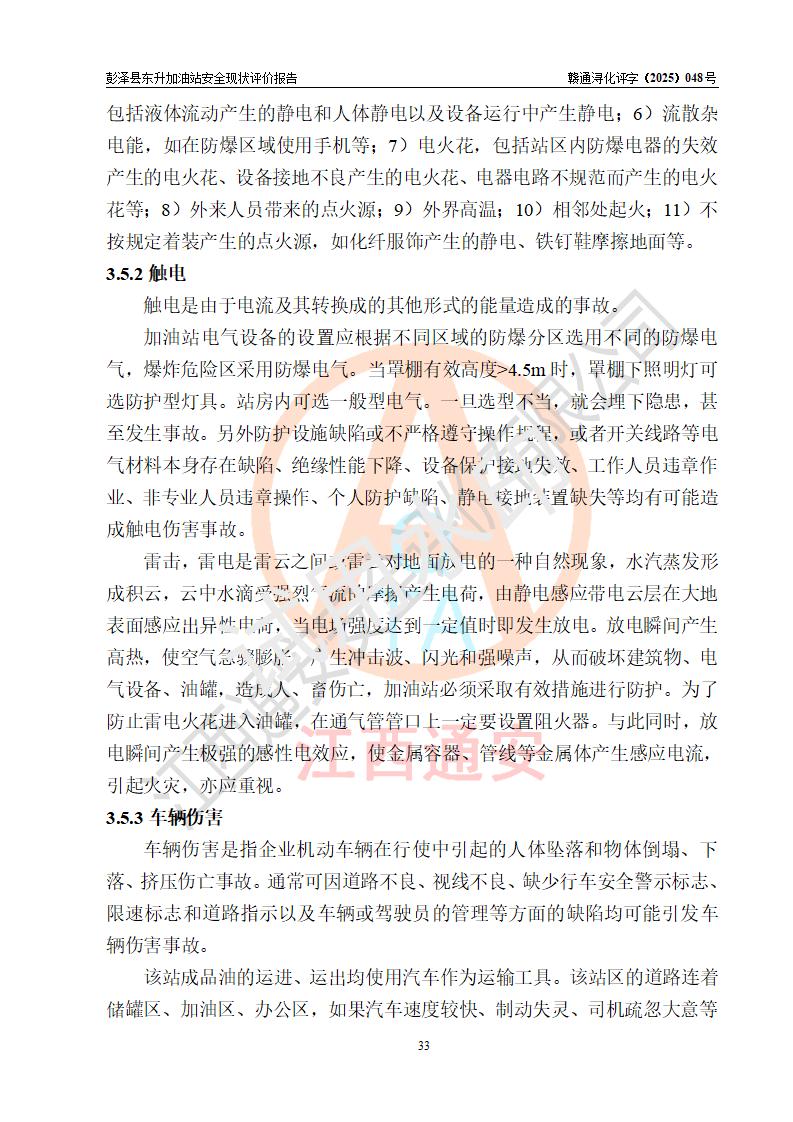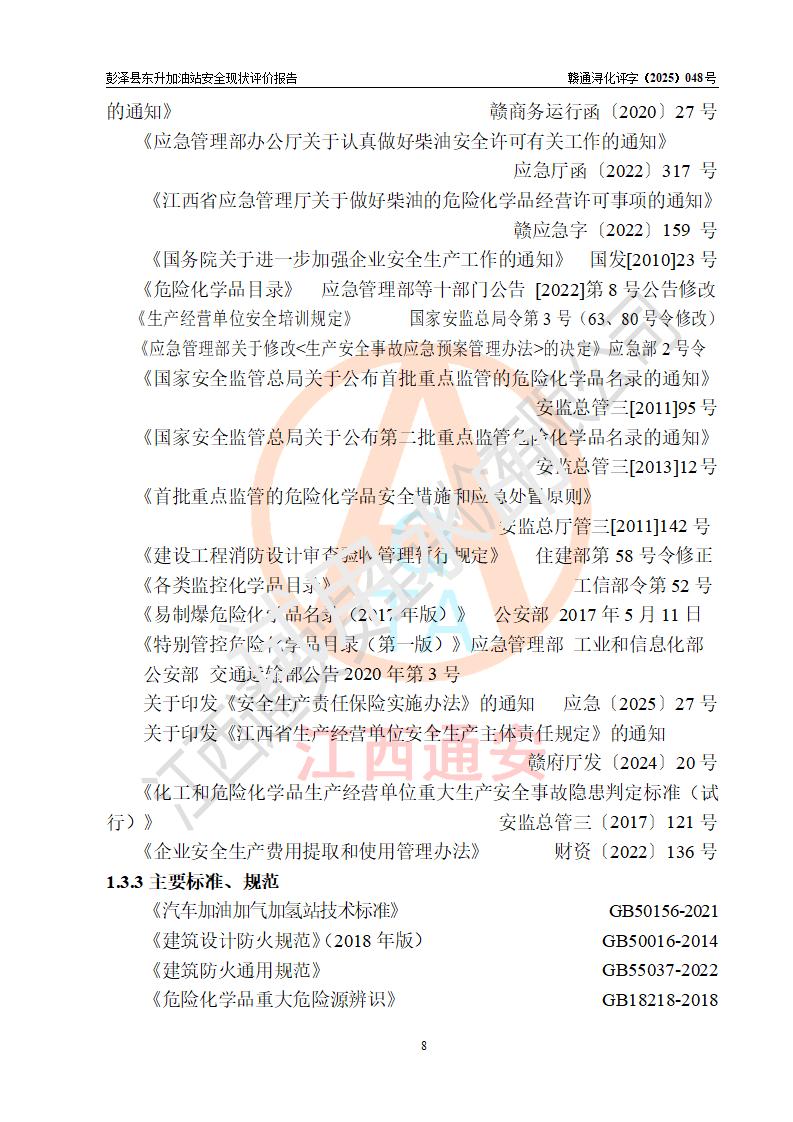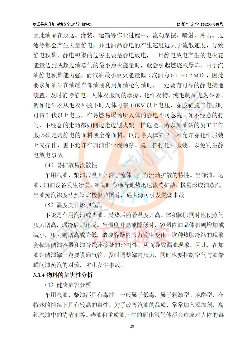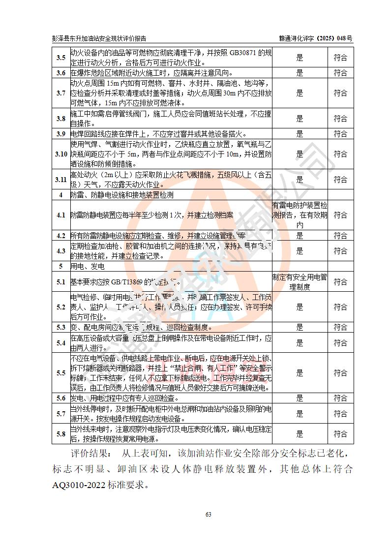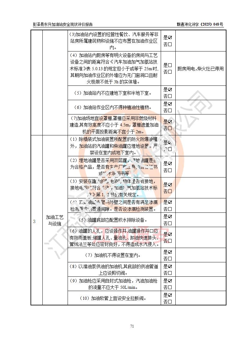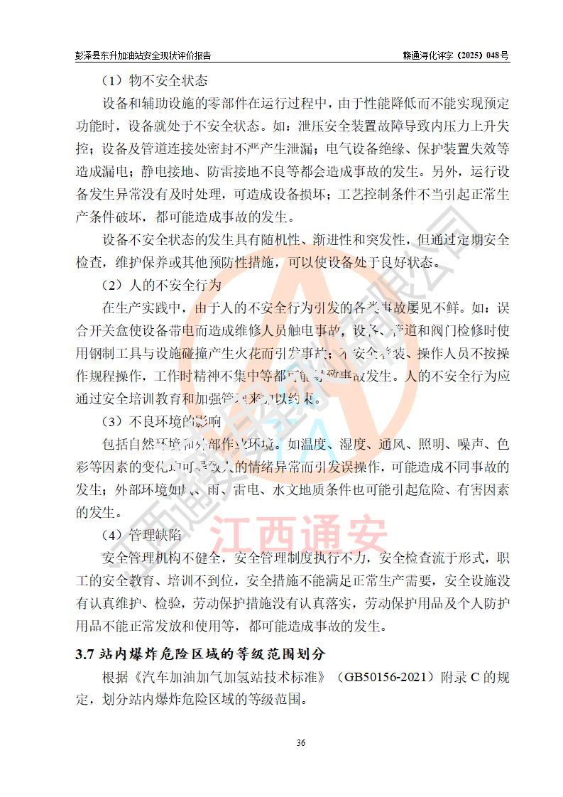 評(píng)價(jià)結(jié)論 | 彭澤縣東升加油站涉及的安全條件、安全經(jīng)營(yíng)條件、安全生產(chǎn)管理符合《危險(xiǎn)化學(xué)品經(jīng)營(yíng)許可證管理辦法》、《汽車加油加氣加氫站技術(shù)標(biāo)準(zhǔn)》等**有關(guān)法規(guī)、標(biāo)準(zhǔn)、規(guī)范要求,能滿足危險(xiǎn)化學(xué)品經(jīng)營(yíng)安全條件。 | |||