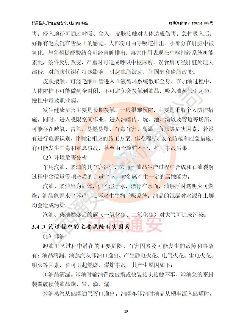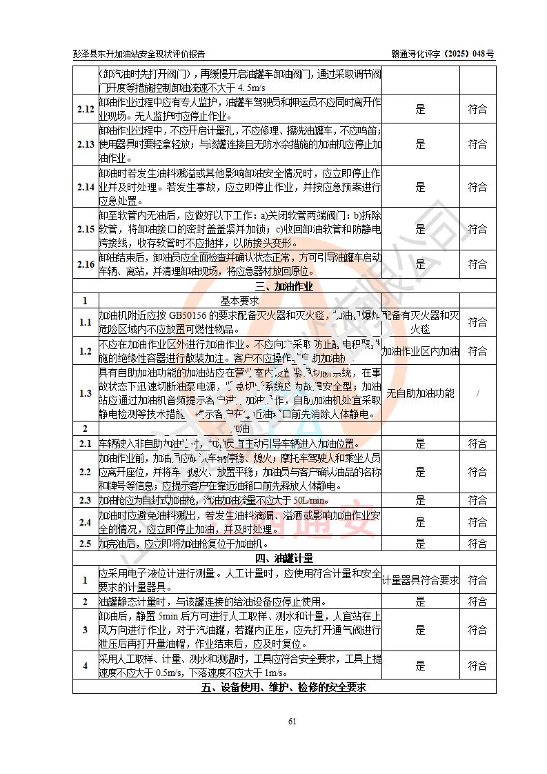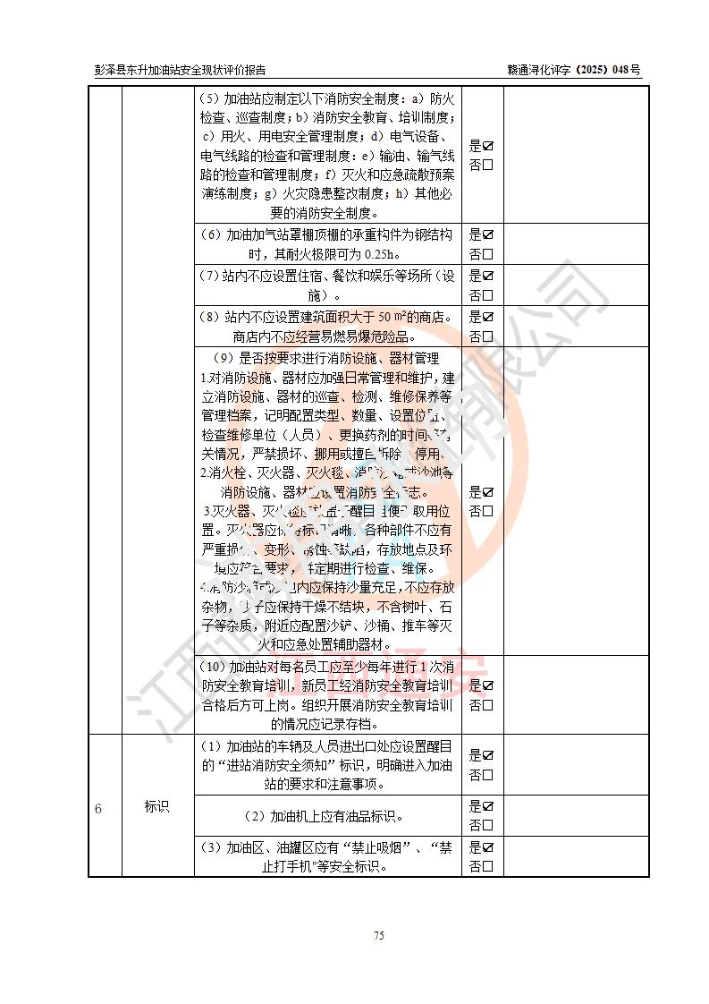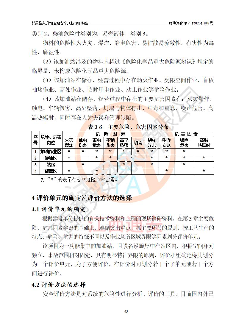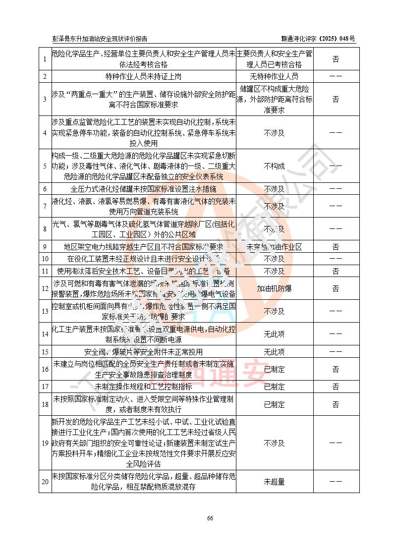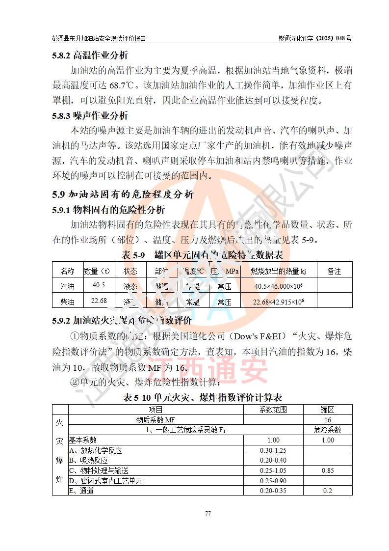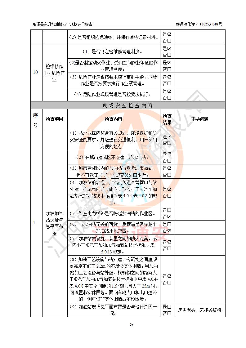 評(píng)價(jià)結(jié)論 | 彭澤縣東升加油站涉及的安全條件、安全經(jīng)營(yíng)條件、安全生產(chǎn)管理符合《危險(xiǎn)化學(xué)品經(jīng)營(yíng)許可證管理辦法》、《汽車加油加氣加氫站技術(shù)標(biāo)準(zhǔn)》等**有關(guān)法規(guī)、標(biāo)準(zhǔn)、規(guī)范要求,能滿足危險(xiǎn)化學(xué)品經(jīng)營(yíng)安全條件。 | |||