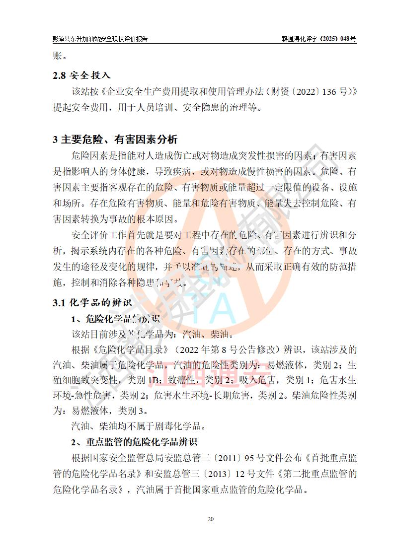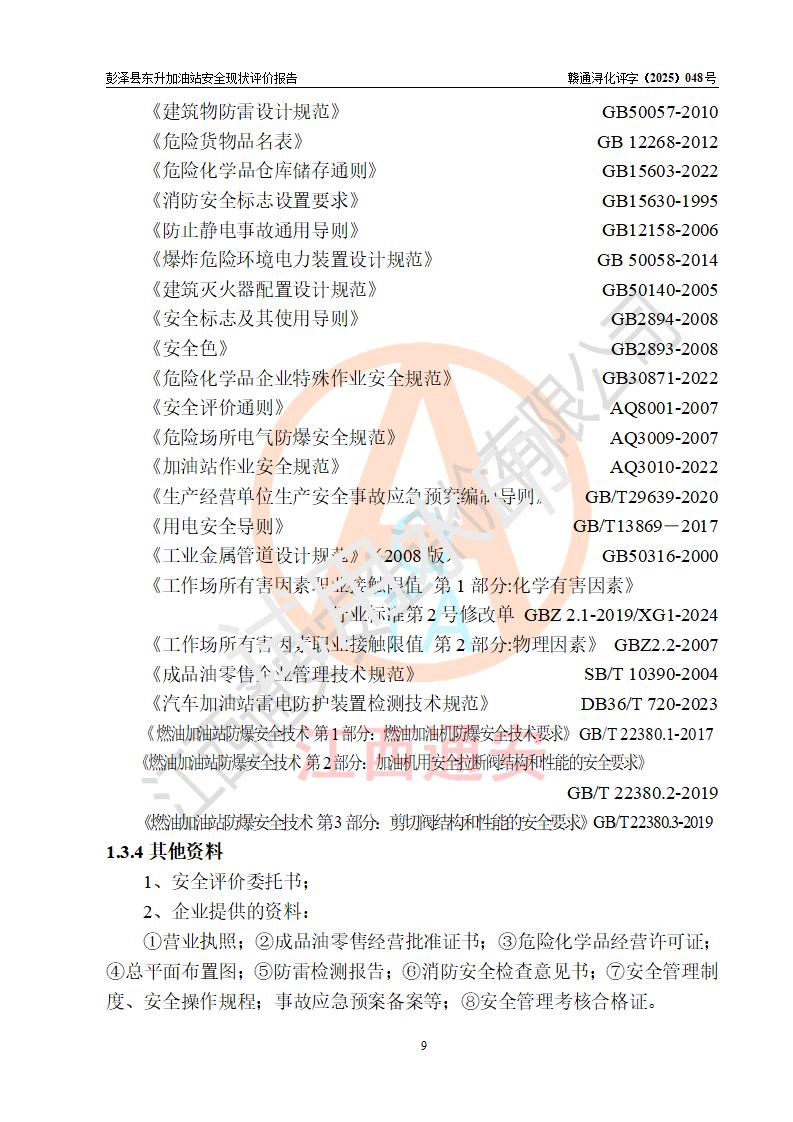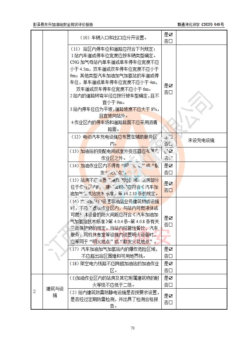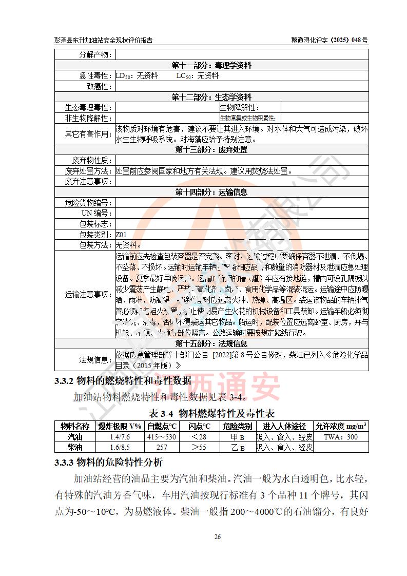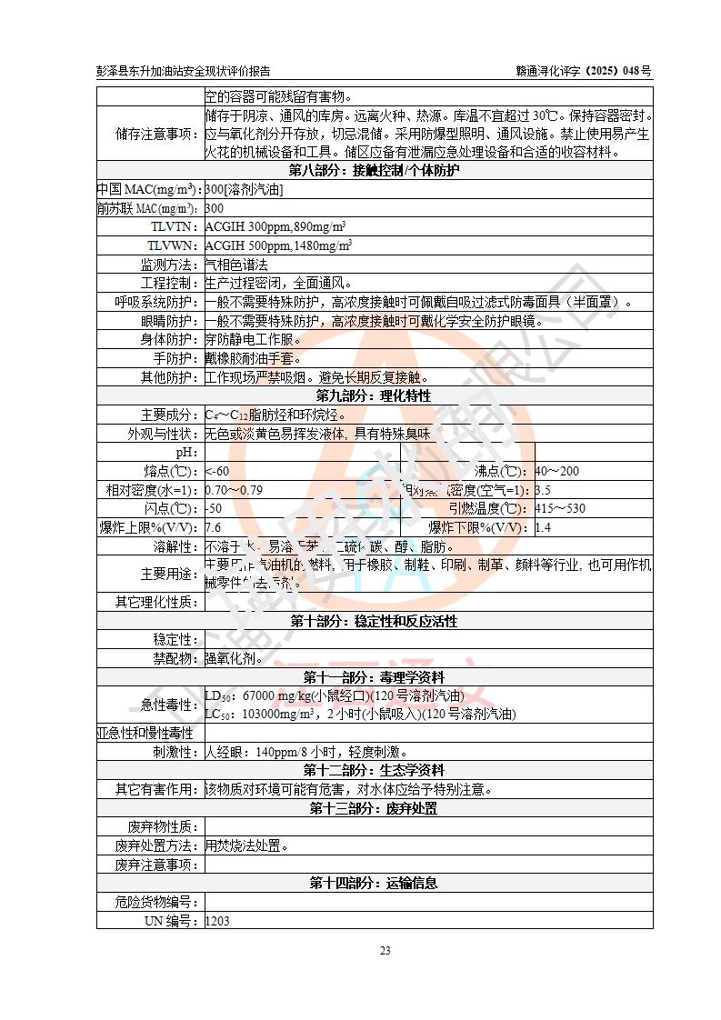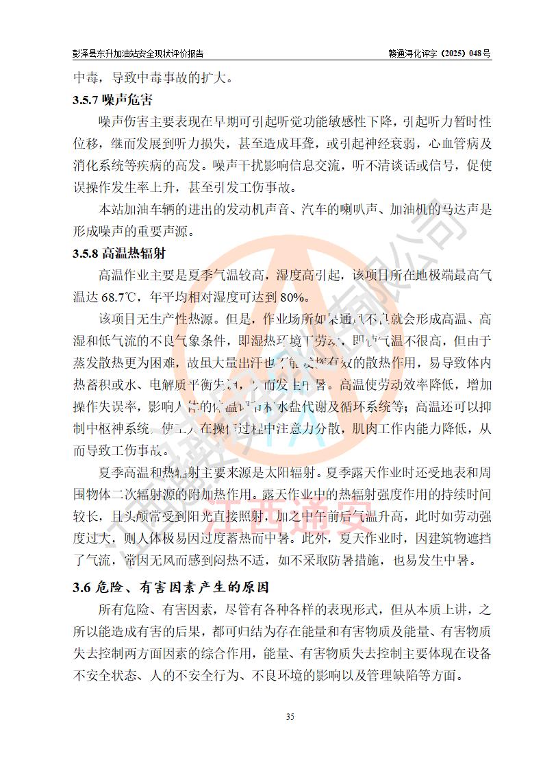 評(píng)價(jià)結(jié)論 | 彭澤縣東升加油站涉及的安全條件、安全經(jīng)營(yíng)條件、安全生產(chǎn)管理符合《危險(xiǎn)化學(xué)品經(jīng)營(yíng)許可證管理辦法》、《汽車加油加氣加氫站技術(shù)標(biāo)準(zhǔn)》等**有關(guān)法規(guī)、標(biāo)準(zhǔn)、規(guī)范要求,能滿足危險(xiǎn)化學(xué)品經(jīng)營(yíng)安全條件。 | |||