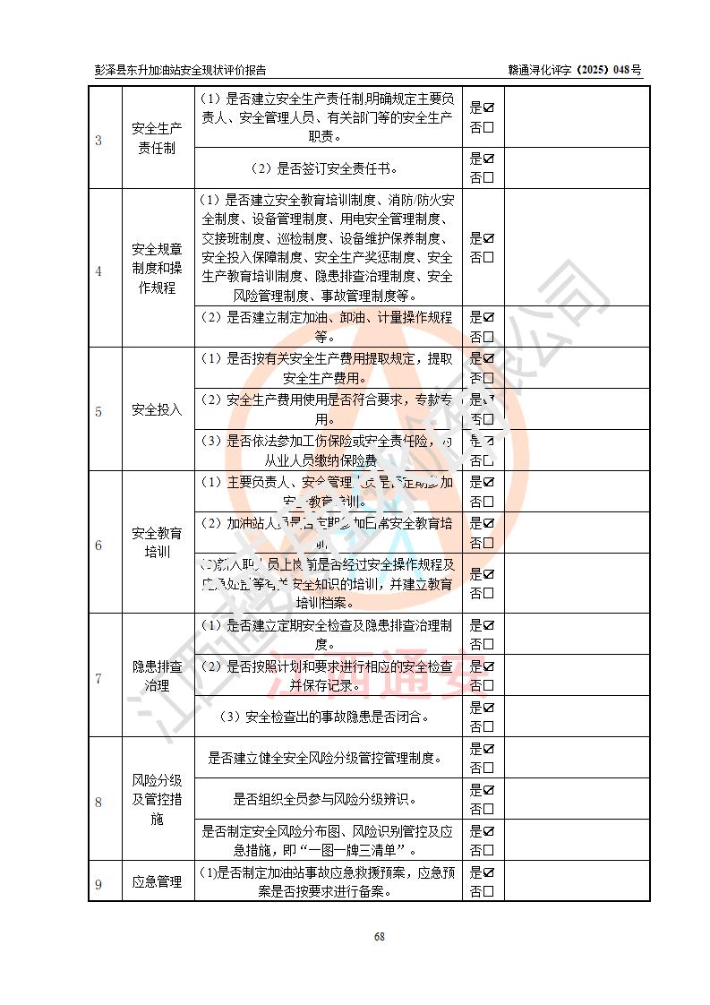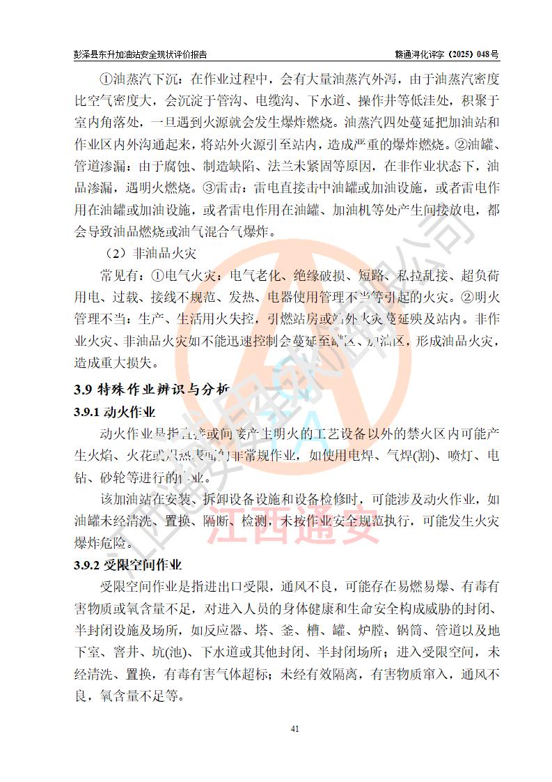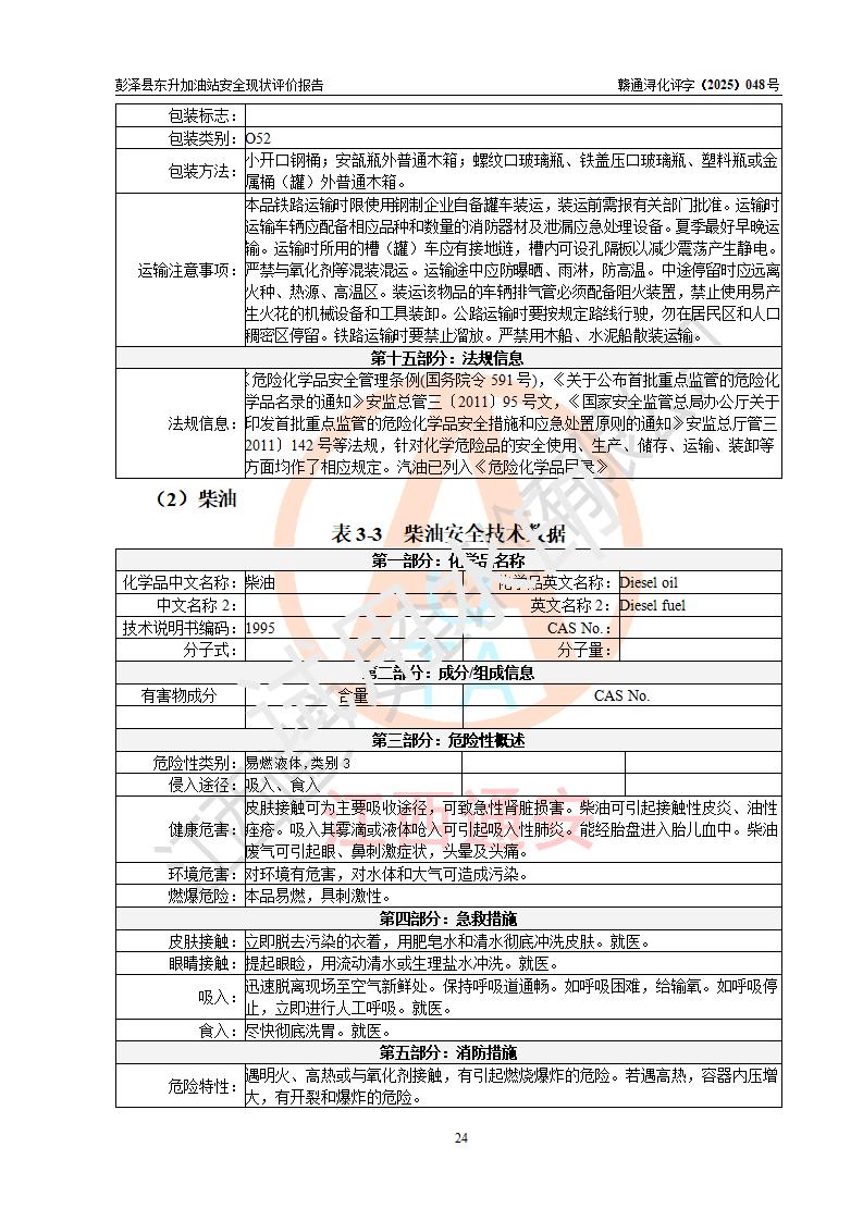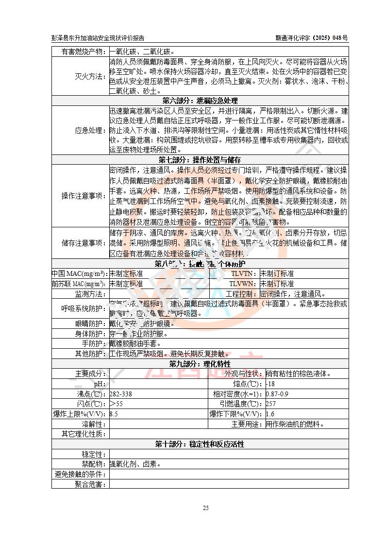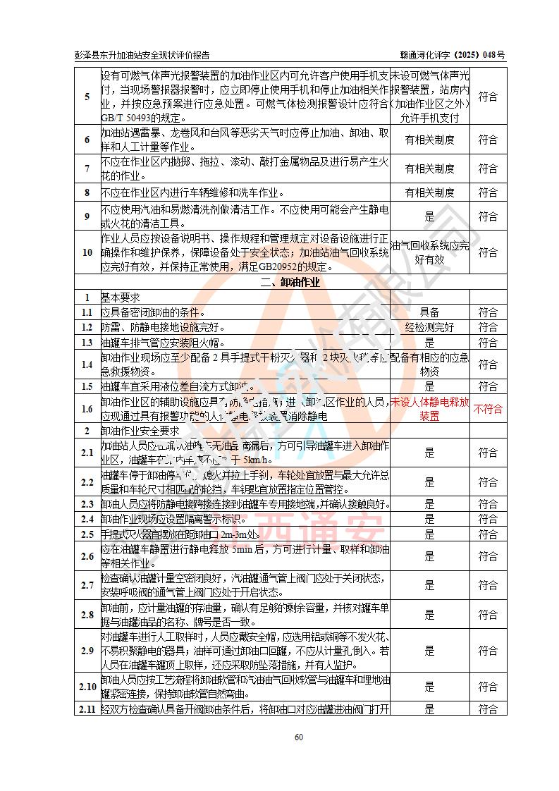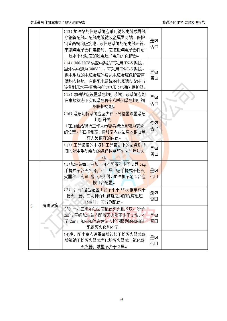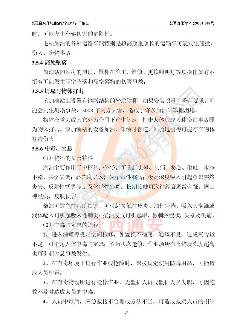 評(píng)價(jià)結(jié)論 | 彭澤縣東升加油站涉及的安全條件、安全經(jīng)營(yíng)條件、安全生產(chǎn)管理符合《危險(xiǎn)化學(xué)品經(jīng)營(yíng)許可證管理辦法》、《汽車加油加氣加氫站技術(shù)標(biāo)準(zhǔn)》等**有關(guān)法規(guī)、標(biāo)準(zhǔn)、規(guī)范要求,能滿足危險(xiǎn)化學(xué)品經(jīng)營(yíng)安全條件。 | |||