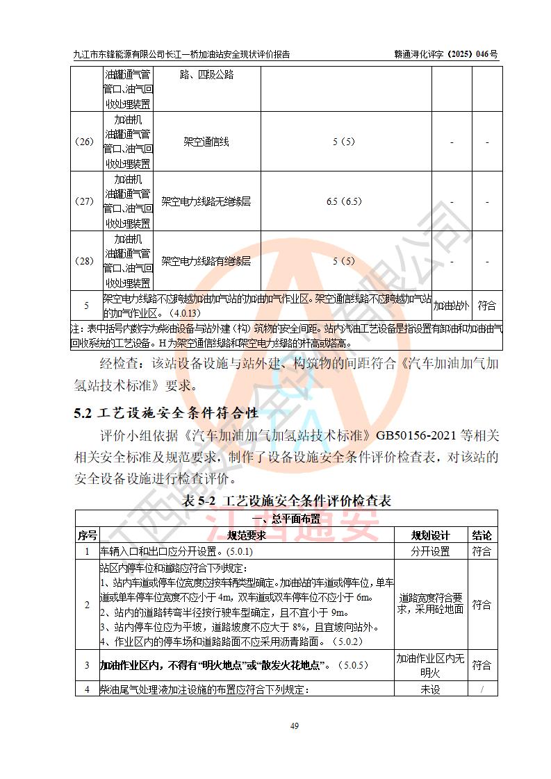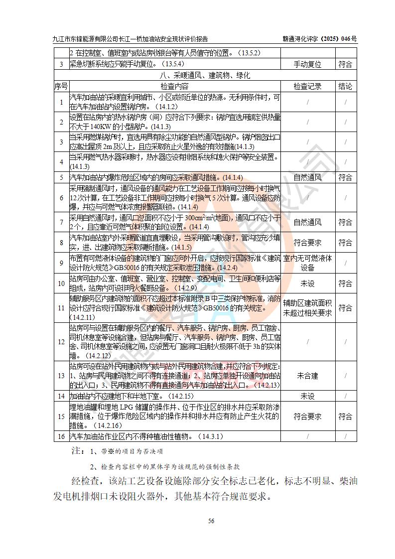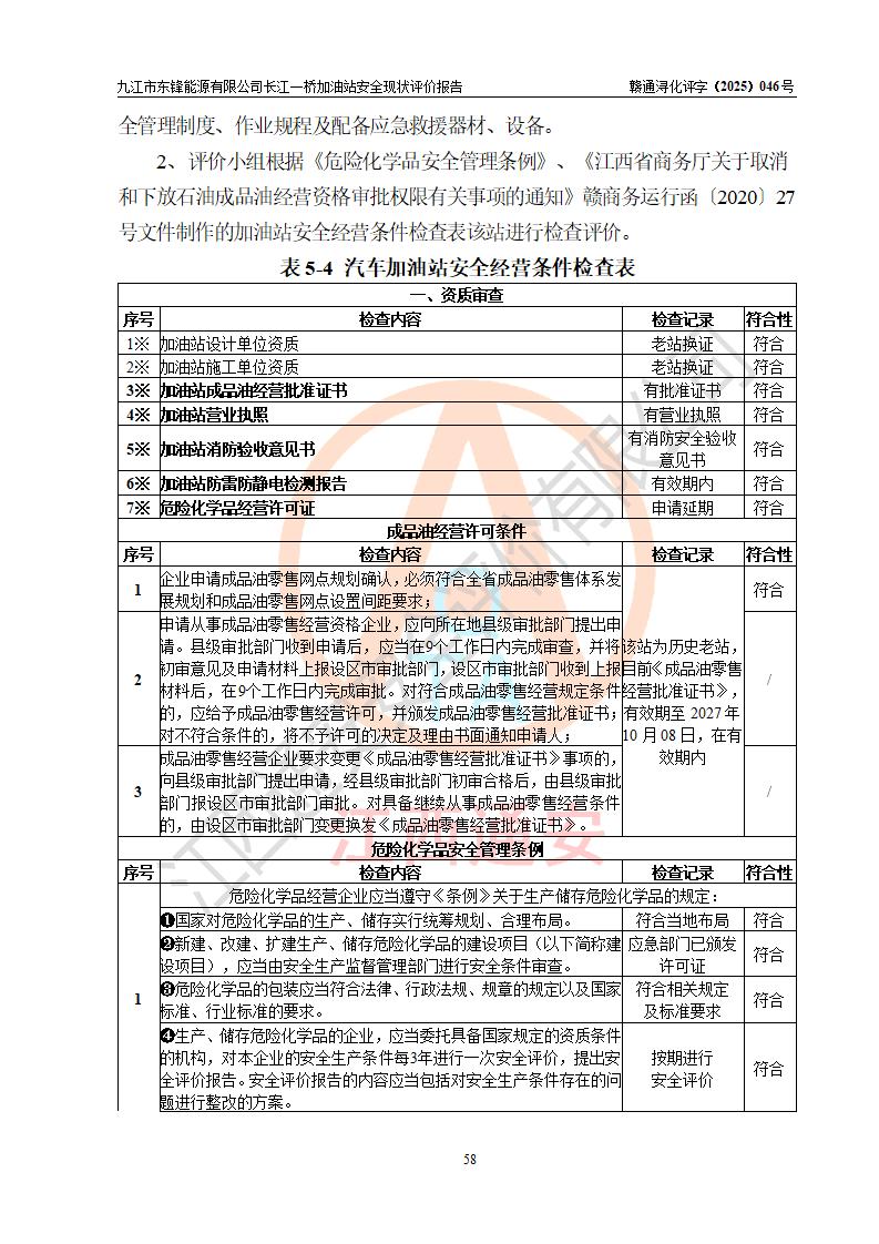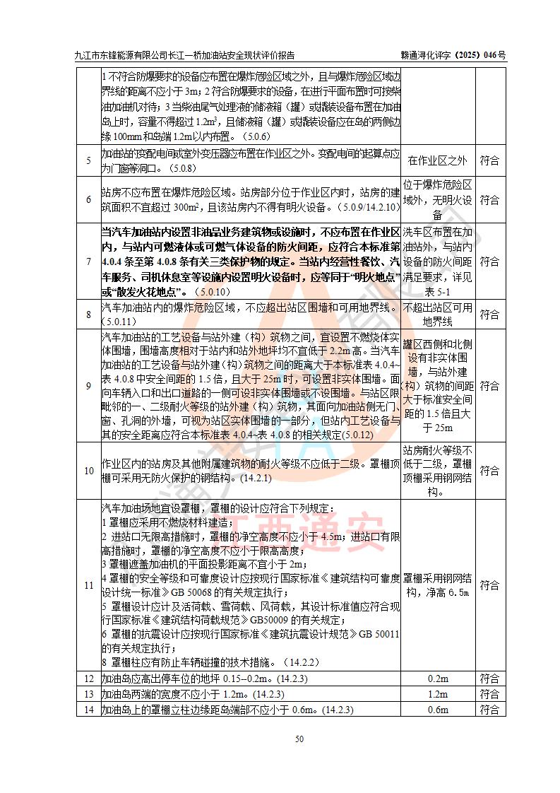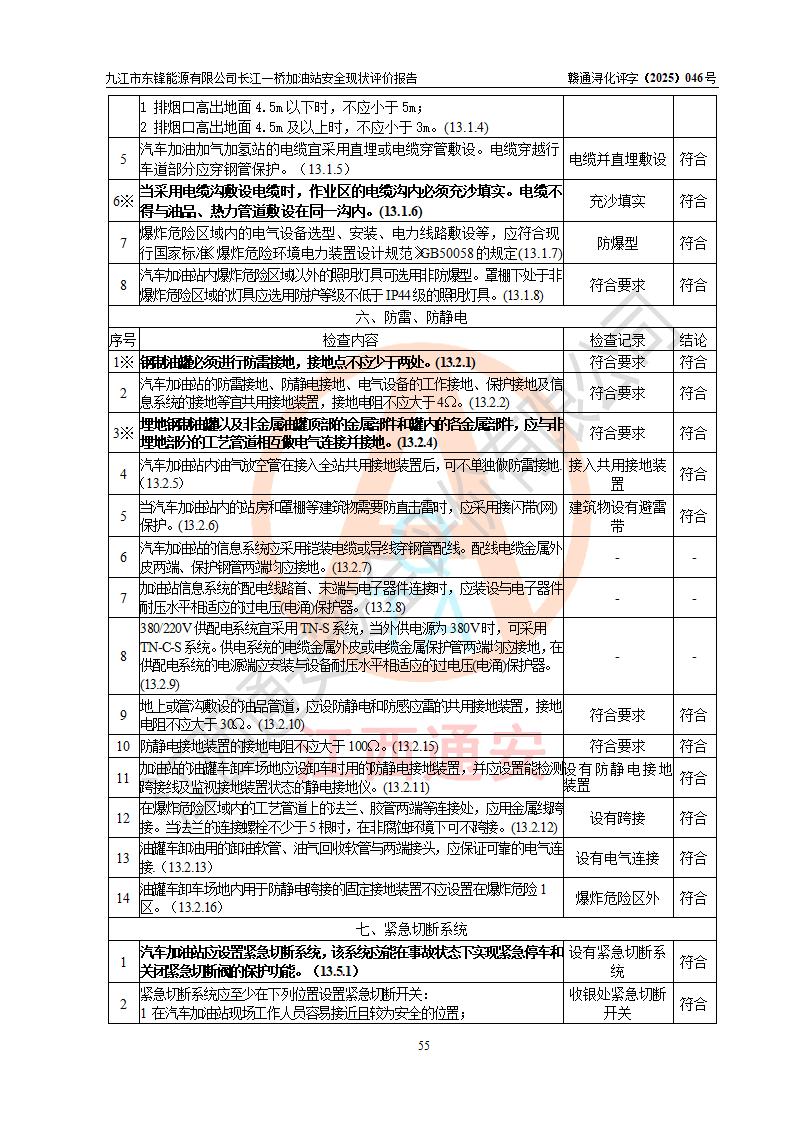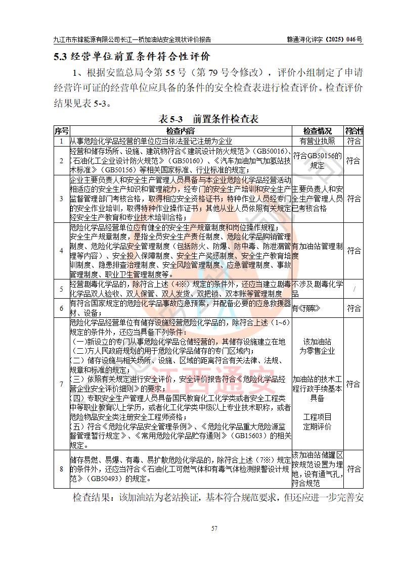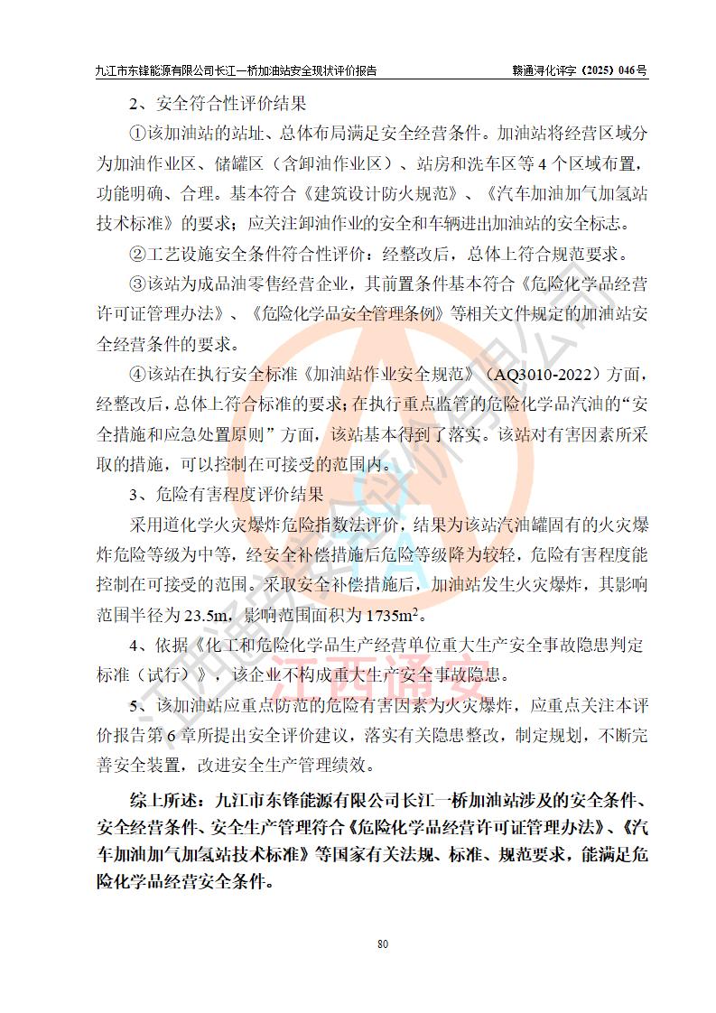 評價結(jié)論 | 九江市東鋒能源有限公司長江一橋加油站涉及的安全條件、安全經(jīng)營條件、安全生產(chǎn)管理符合《危險化學(xué)品經(jīng)營許可證管理辦法》、《汽車加油加氣加氫站技術(shù)標(biāo)準(zhǔn)》等**有關(guān)法規(guī)、標(biāo)準(zhǔn)、規(guī)范要求,能滿足危險化學(xué)品經(jīng)營安全條件。 | |||