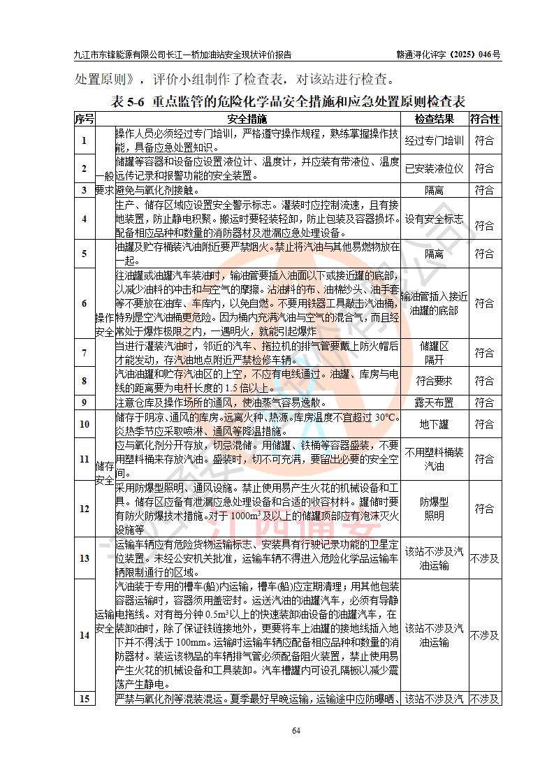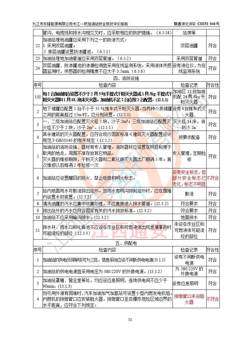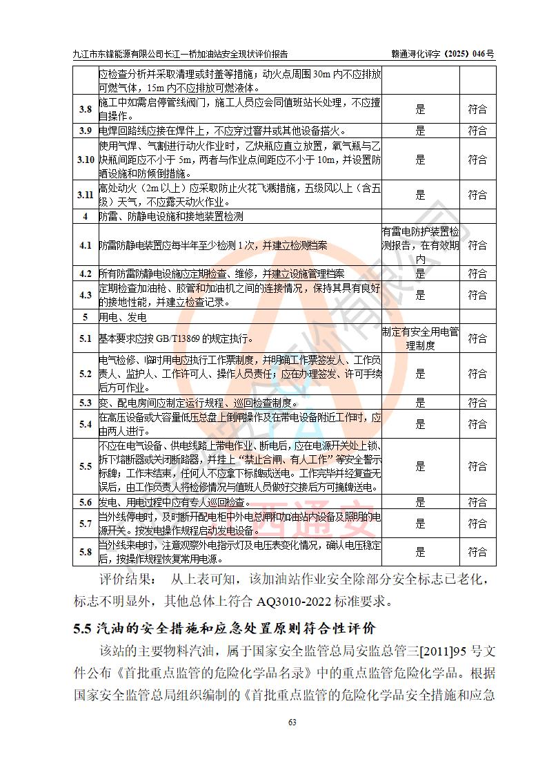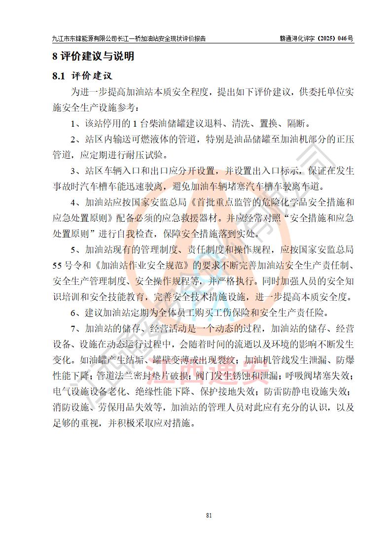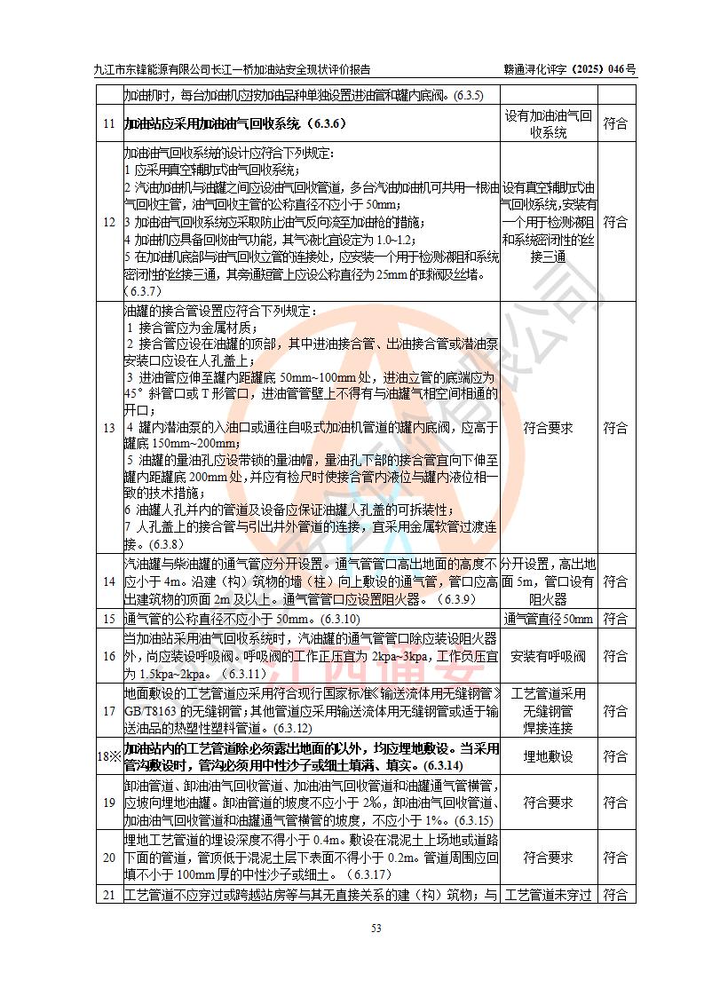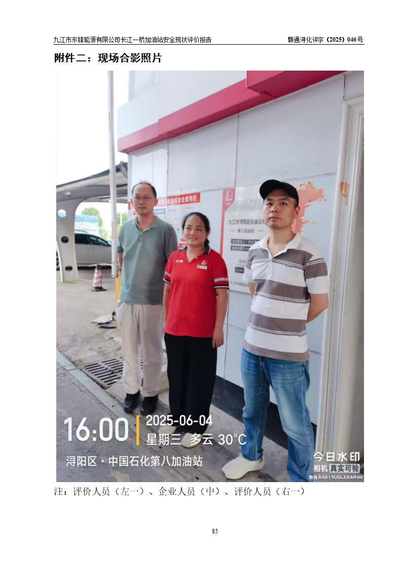 評價結(jié)論 | 九江市東鋒能源有限公司長江一橋加油站涉及的安全條件、安全經(jīng)營條件、安全生產(chǎn)管理符合《危險化學(xué)品經(jīng)營許可證管理辦法》、《汽車加油加氣加氫站技術(shù)標(biāo)準(zhǔn)》等**有關(guān)法規(guī)、標(biāo)準(zhǔn)、規(guī)范要求,能滿足危險化學(xué)品經(jīng)營安全條件。 | |||