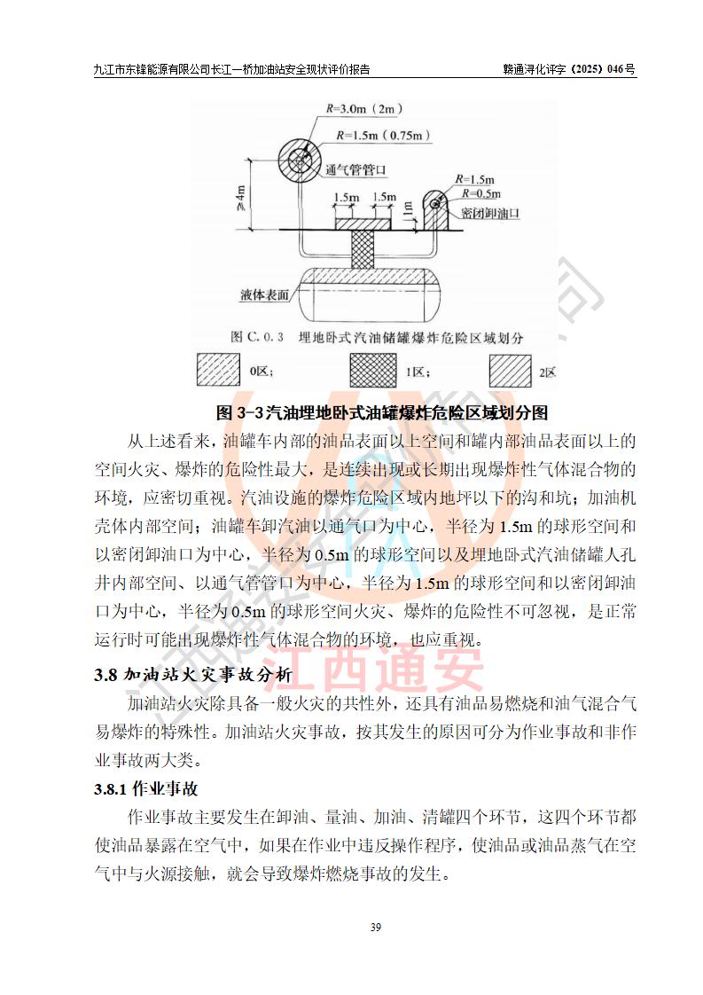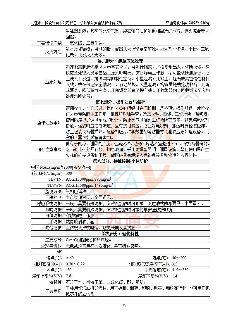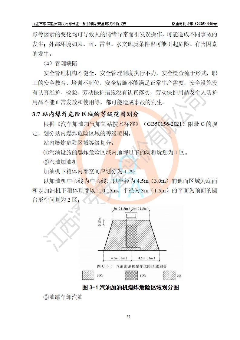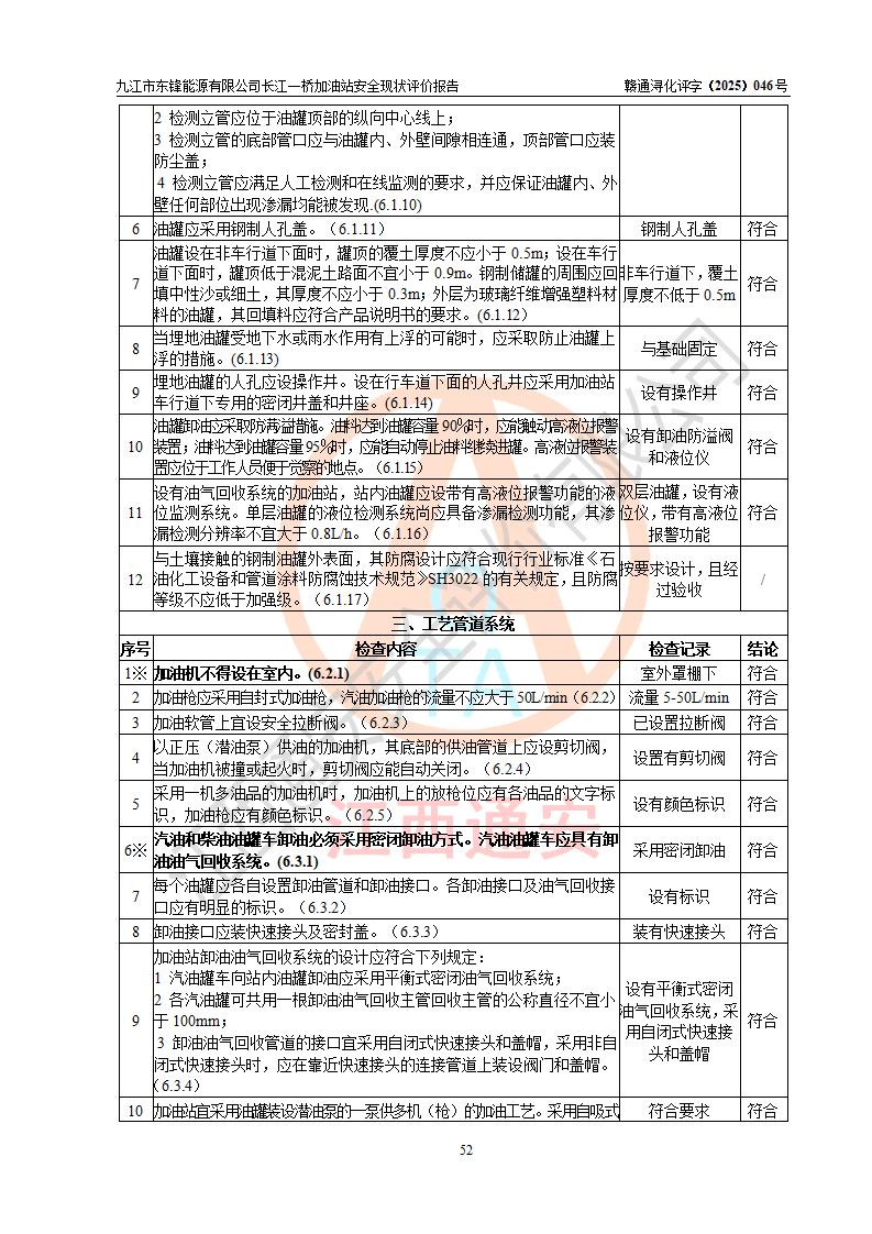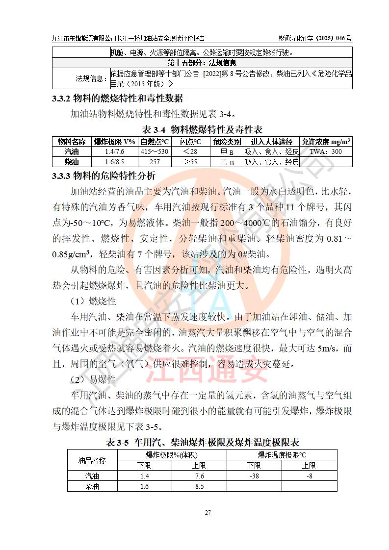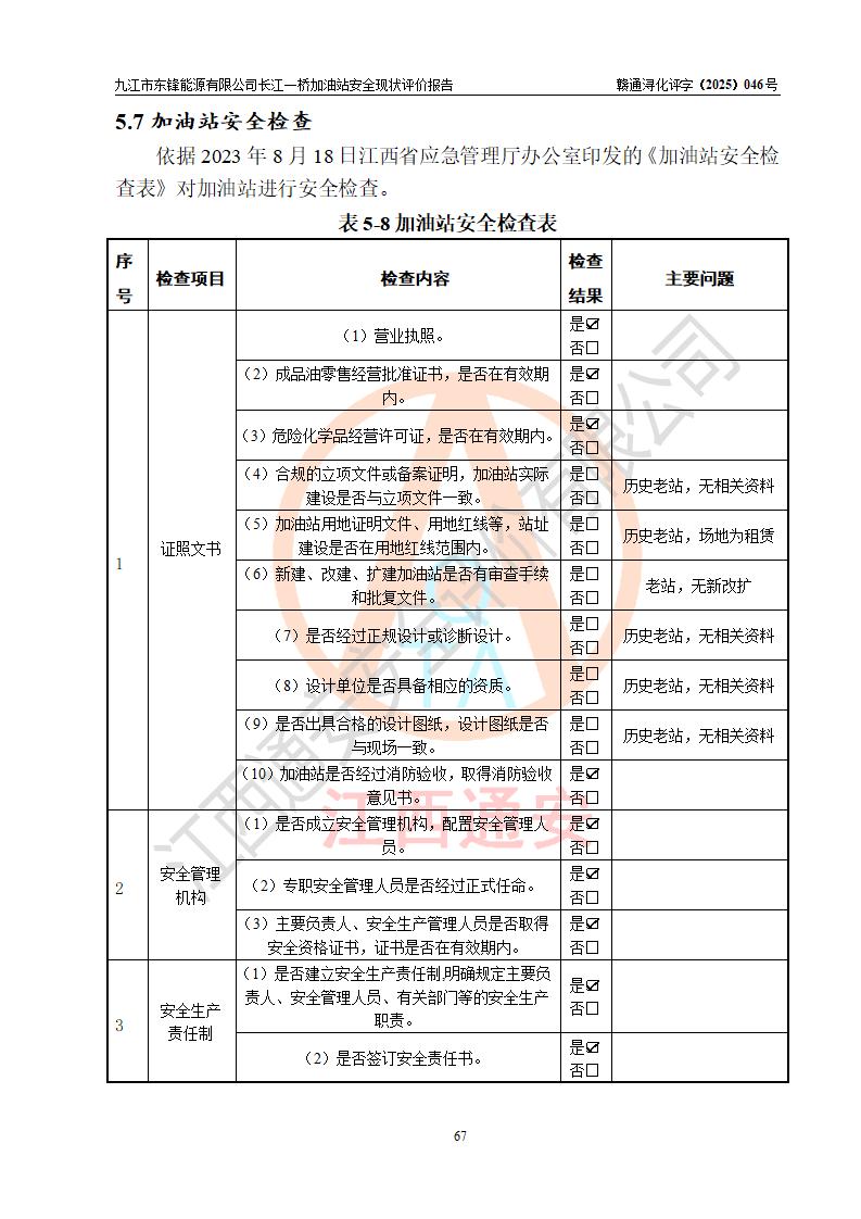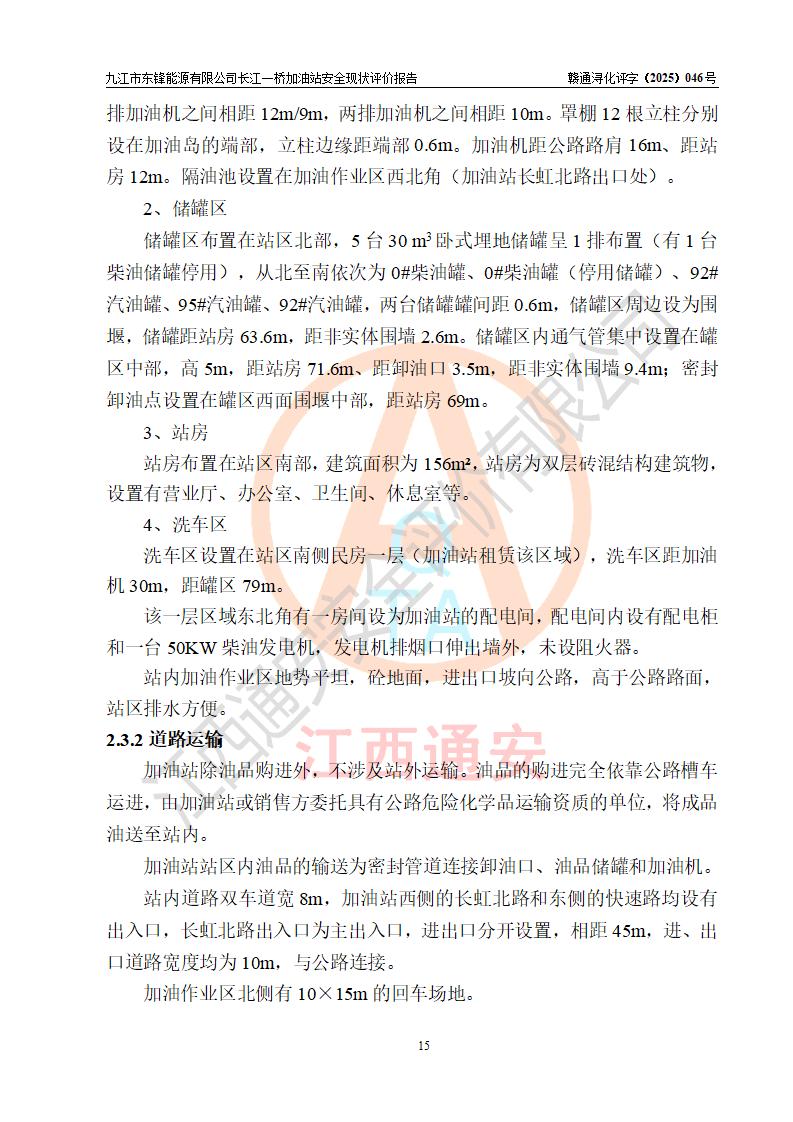 評價結(jié)論 | 九江市東鋒能源有限公司長江一橋加油站涉及的安全條件、安全經(jīng)營條件、安全生產(chǎn)管理符合《危險化學(xué)品經(jīng)營許可證管理辦法》、《汽車加油加氣加氫站技術(shù)標(biāo)準(zhǔn)》等**有關(guān)法規(guī)、標(biāo)準(zhǔn)、規(guī)范要求,能滿足危險化學(xué)品經(jīng)營安全條件。 | |||