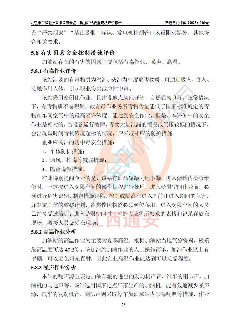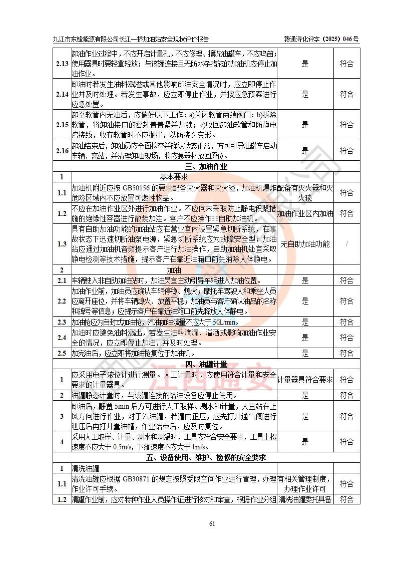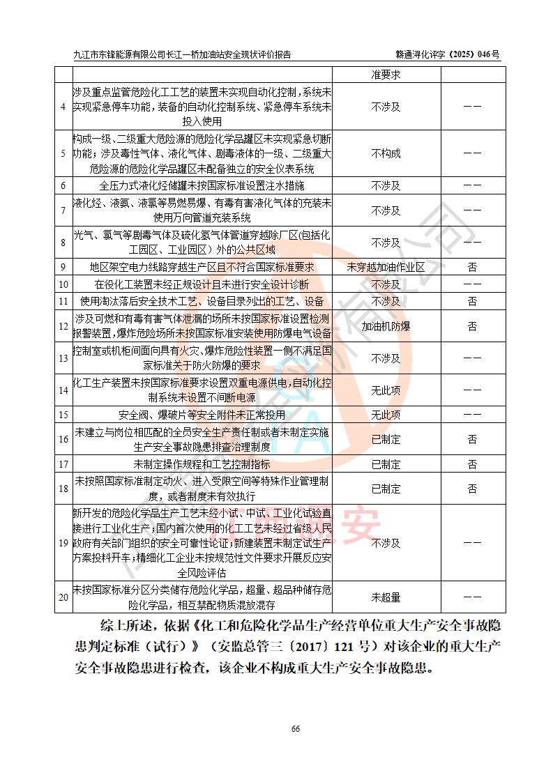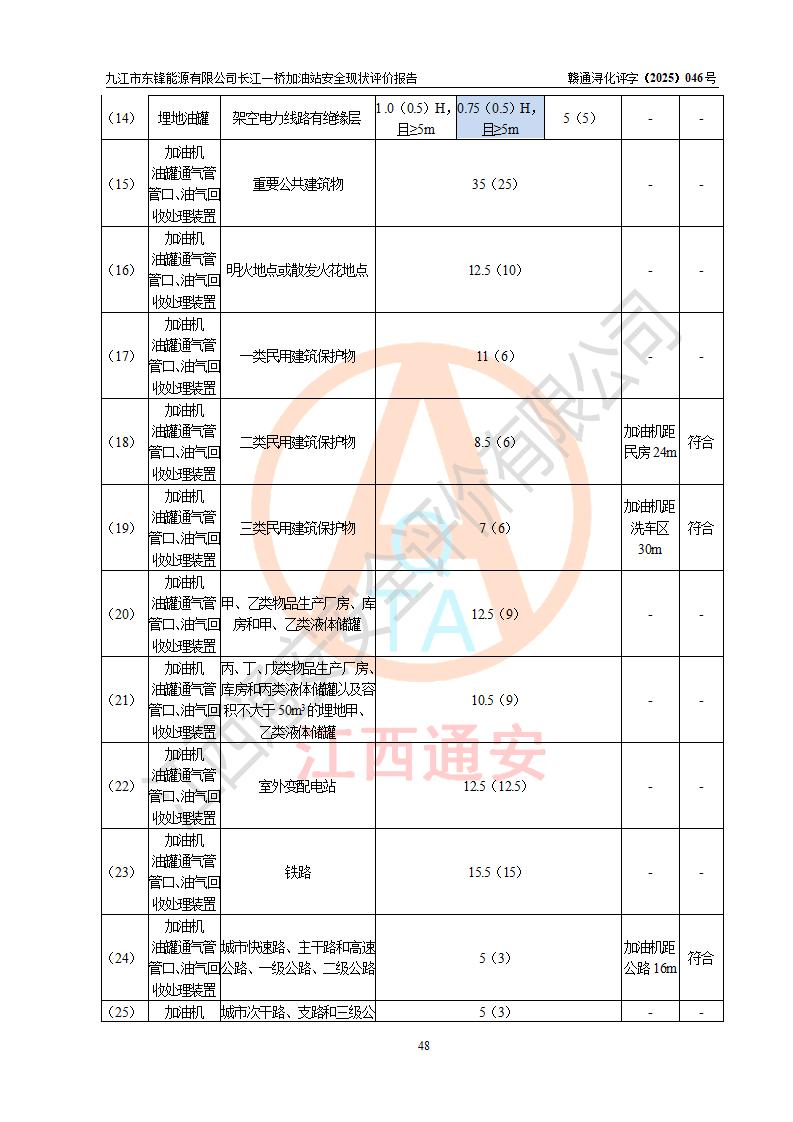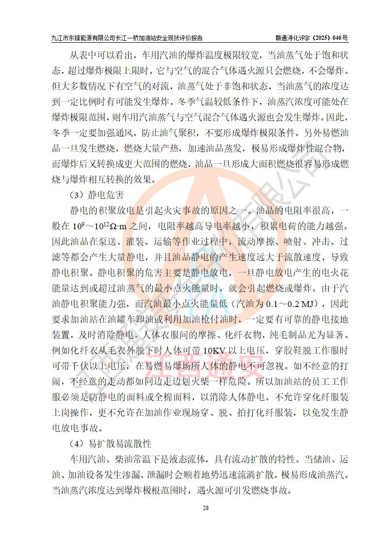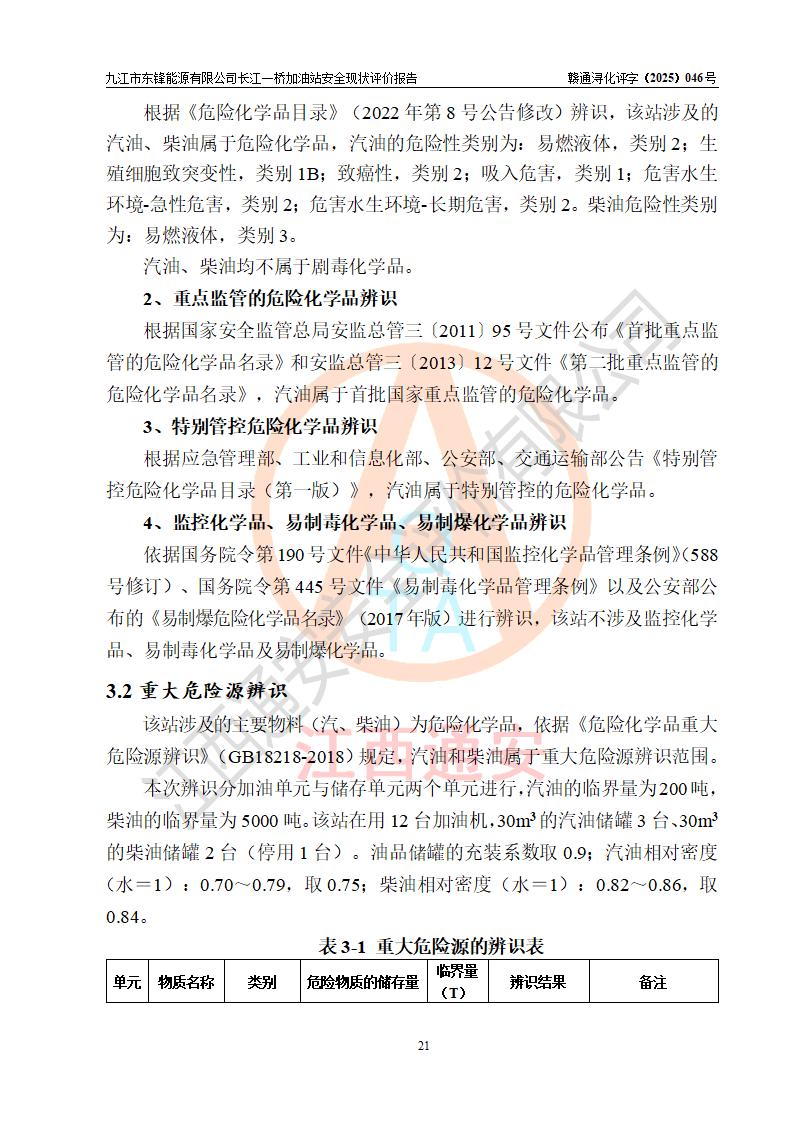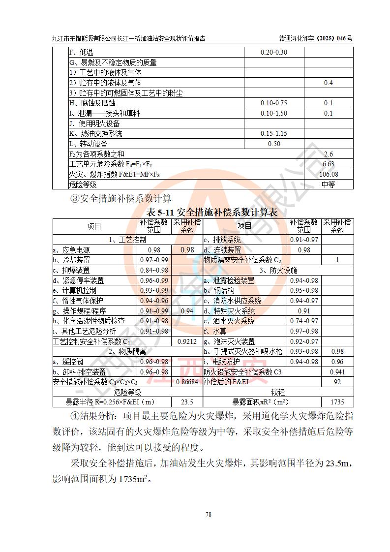 評價結(jié)論 | 九江市東鋒能源有限公司長江一橋加油站涉及的安全條件、安全經(jīng)營條件、安全生產(chǎn)管理符合《危險化學(xué)品經(jīng)營許可證管理辦法》、《汽車加油加氣加氫站技術(shù)標(biāo)準(zhǔn)》等**有關(guān)法規(guī)、標(biāo)準(zhǔn)、規(guī)范要求,能滿足危險化學(xué)品經(jīng)營安全條件。 | |||