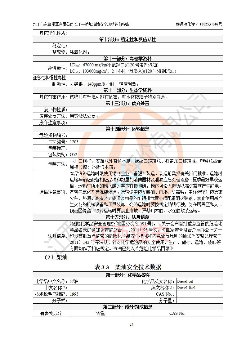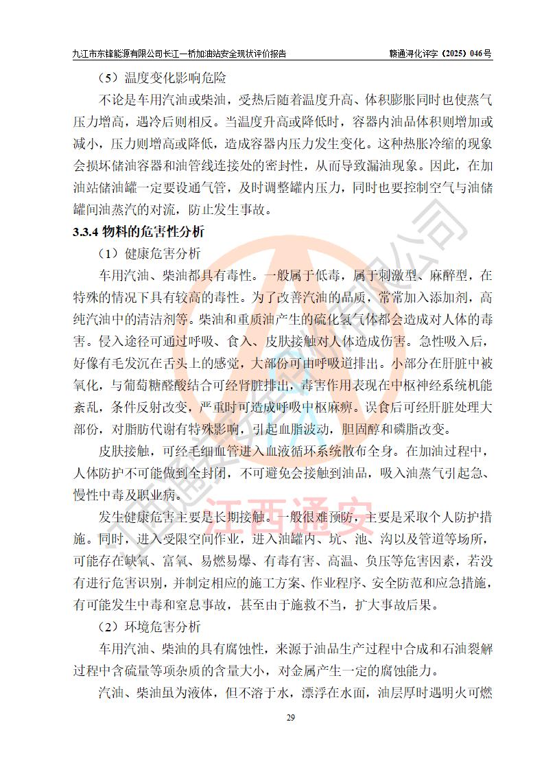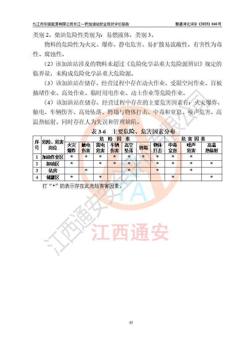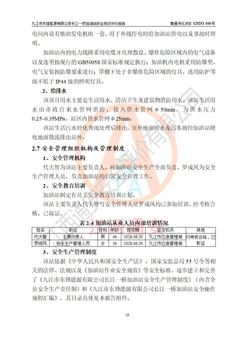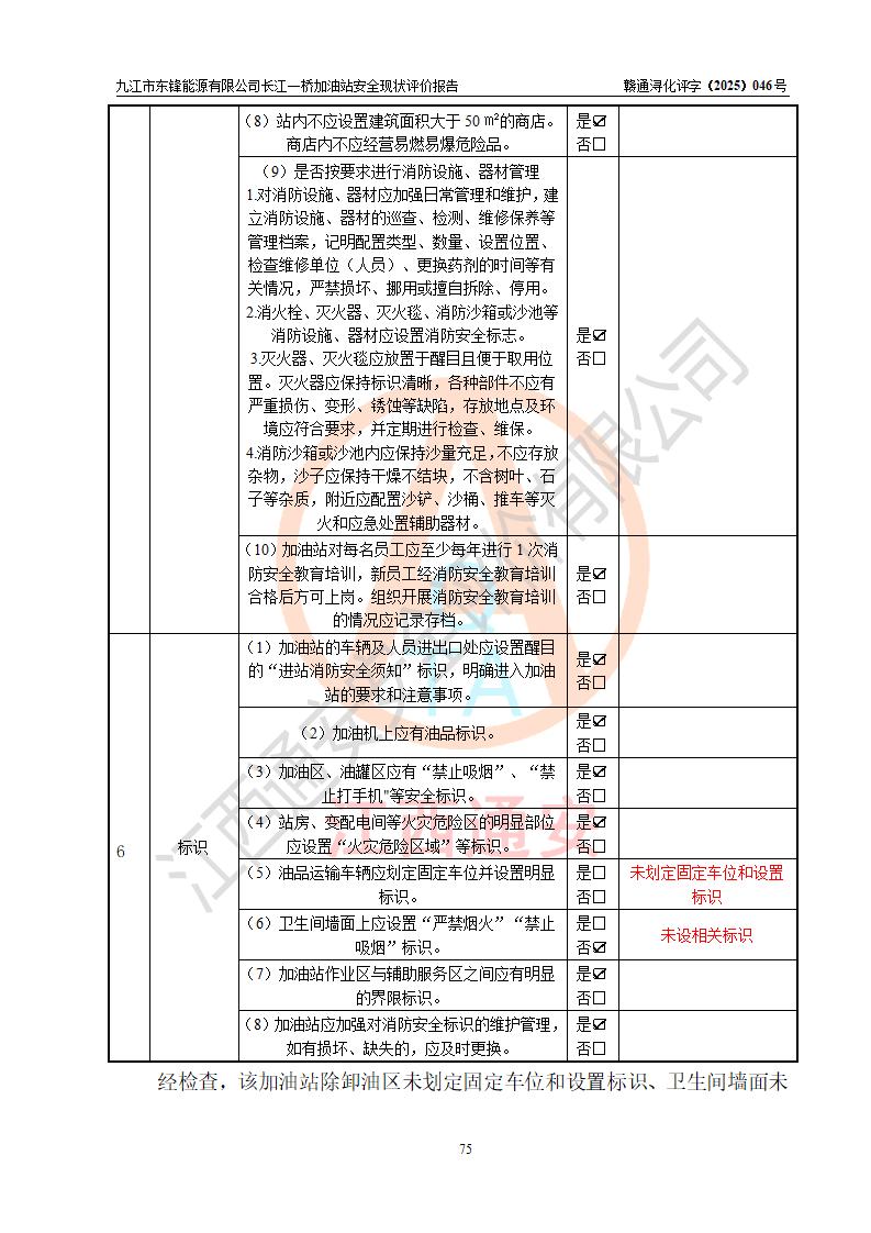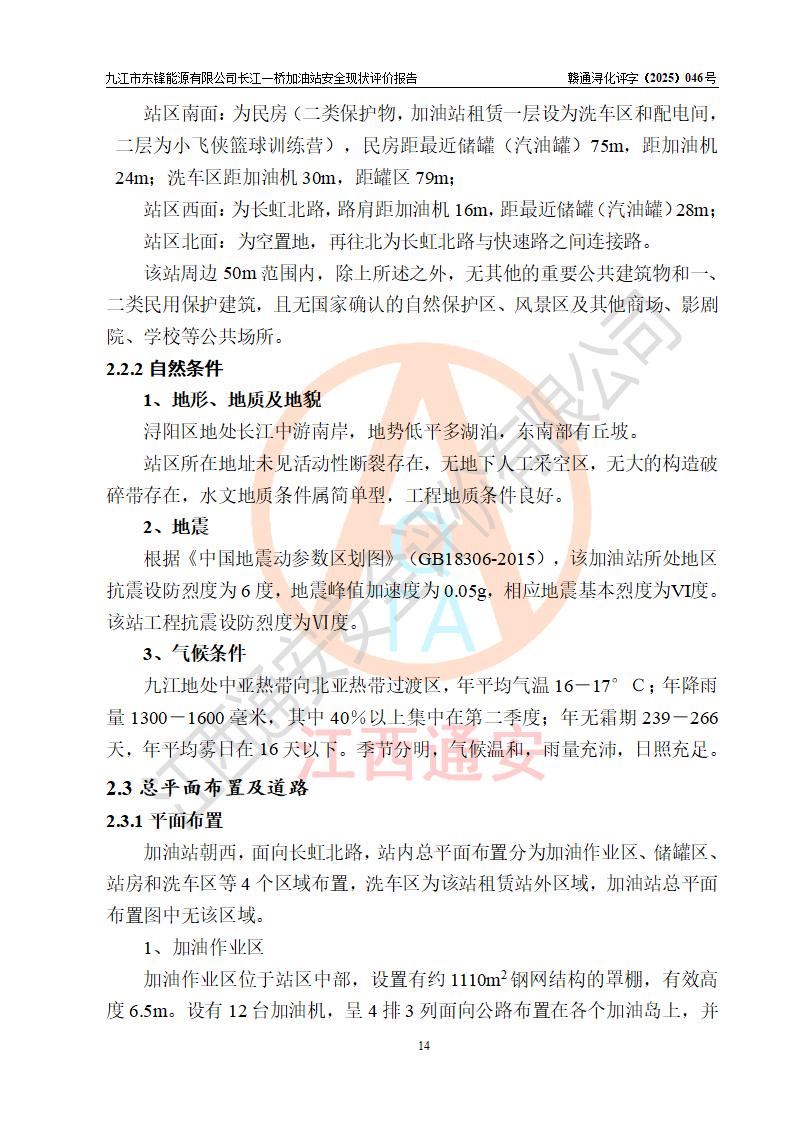 評價結(jié)論 | 九江市東鋒能源有限公司長江一橋加油站涉及的安全條件、安全經(jīng)營條件、安全生產(chǎn)管理符合《危險化學(xué)品經(jīng)營許可證管理辦法》、《汽車加油加氣加氫站技術(shù)標(biāo)準(zhǔn)》等**有關(guān)法規(guī)、標(biāo)準(zhǔn)、規(guī)范要求,能滿足危險化學(xué)品經(jīng)營安全條件。 | |||