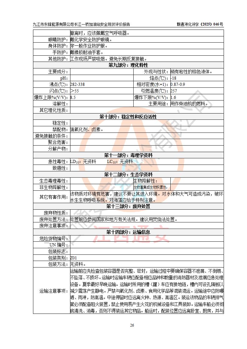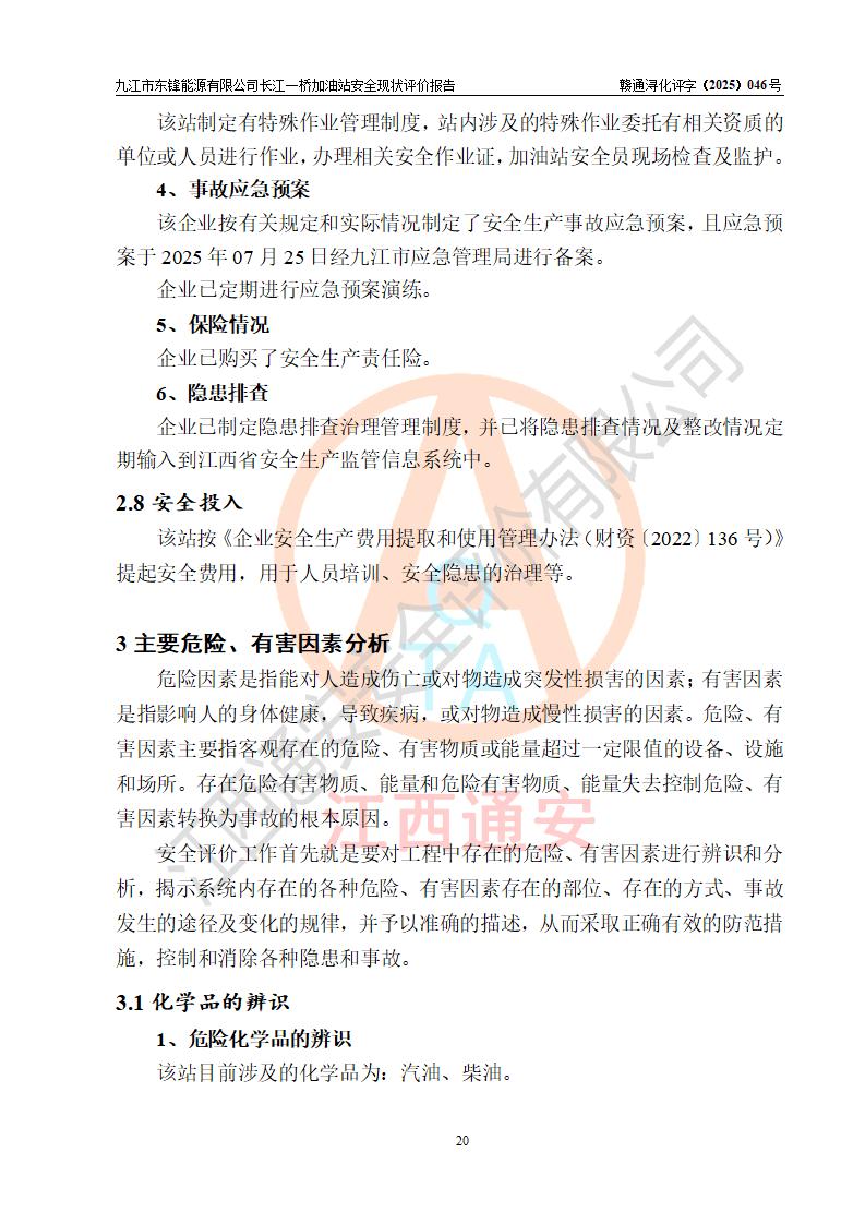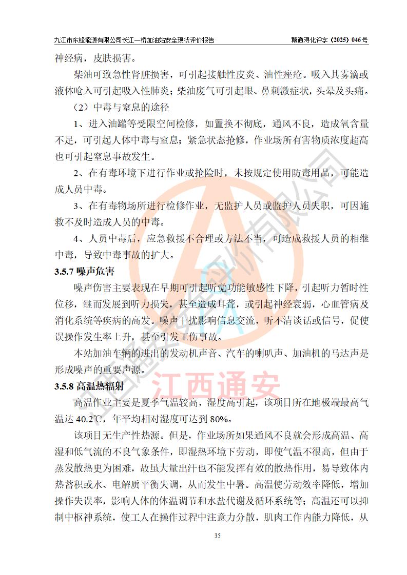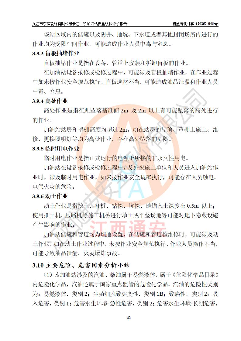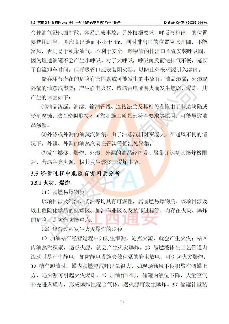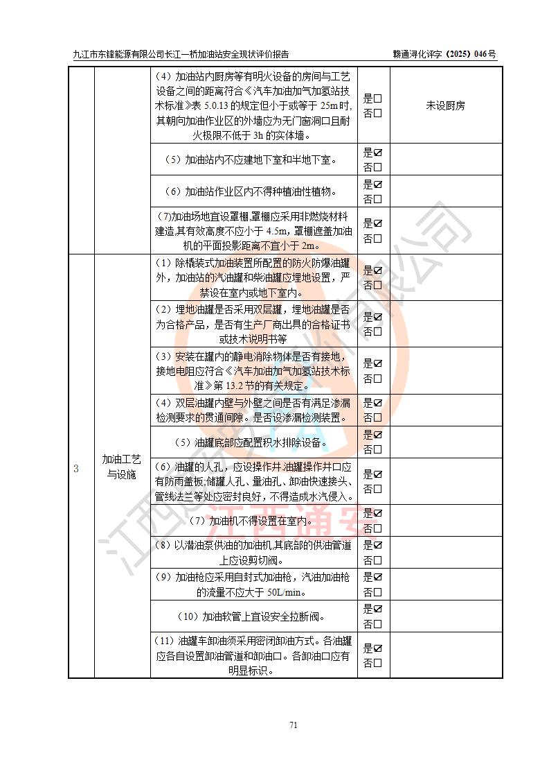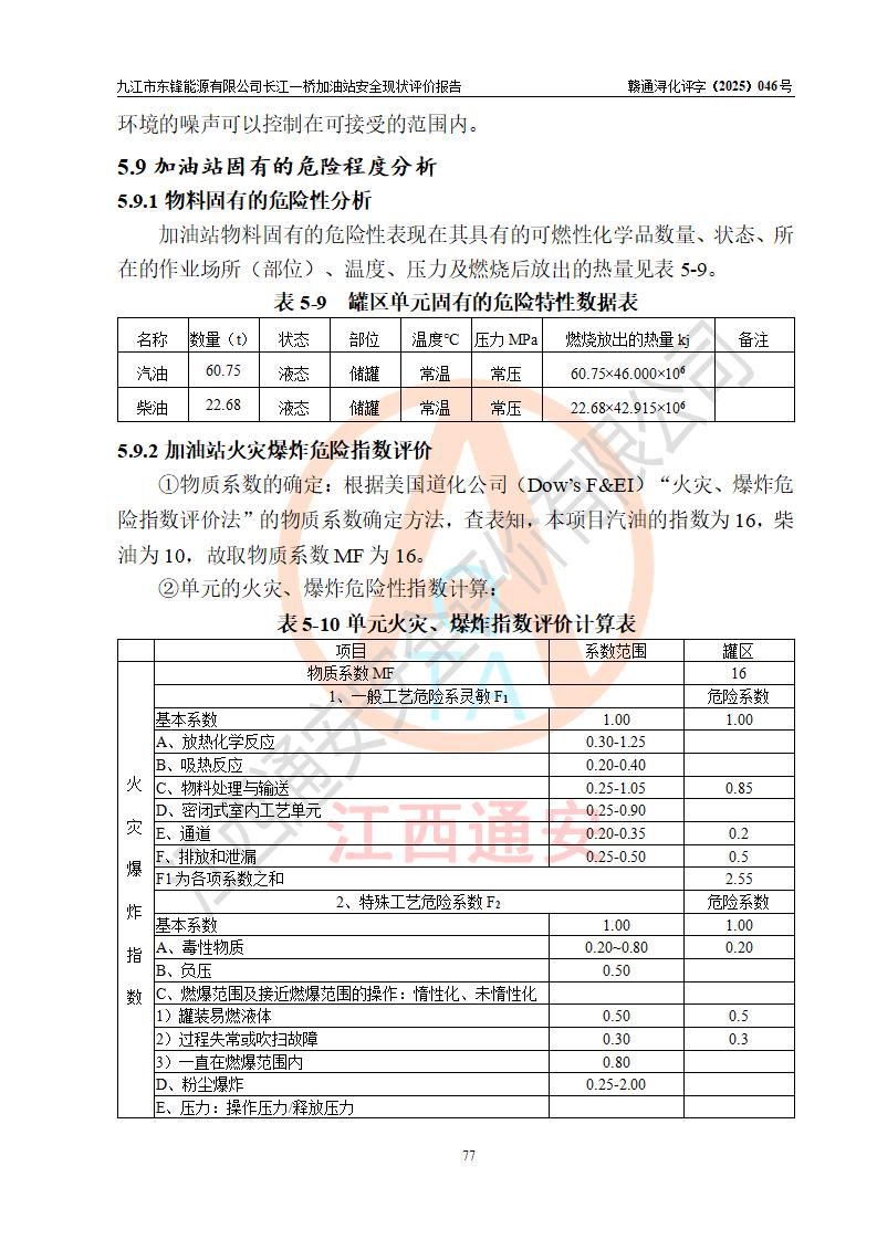 評價結(jié)論 | 九江市東鋒能源有限公司長江一橋加油站涉及的安全條件、安全經(jīng)營條件、安全生產(chǎn)管理符合《危險化學(xué)品經(jīng)營許可證管理辦法》、《汽車加油加氣加氫站技術(shù)標(biāo)準(zhǔn)》等**有關(guān)法規(guī)、標(biāo)準(zhǔn)、規(guī)范要求,能滿足危險化學(xué)品經(jīng)營安全條件。 | |||