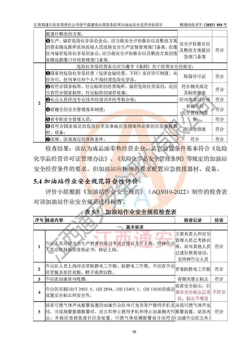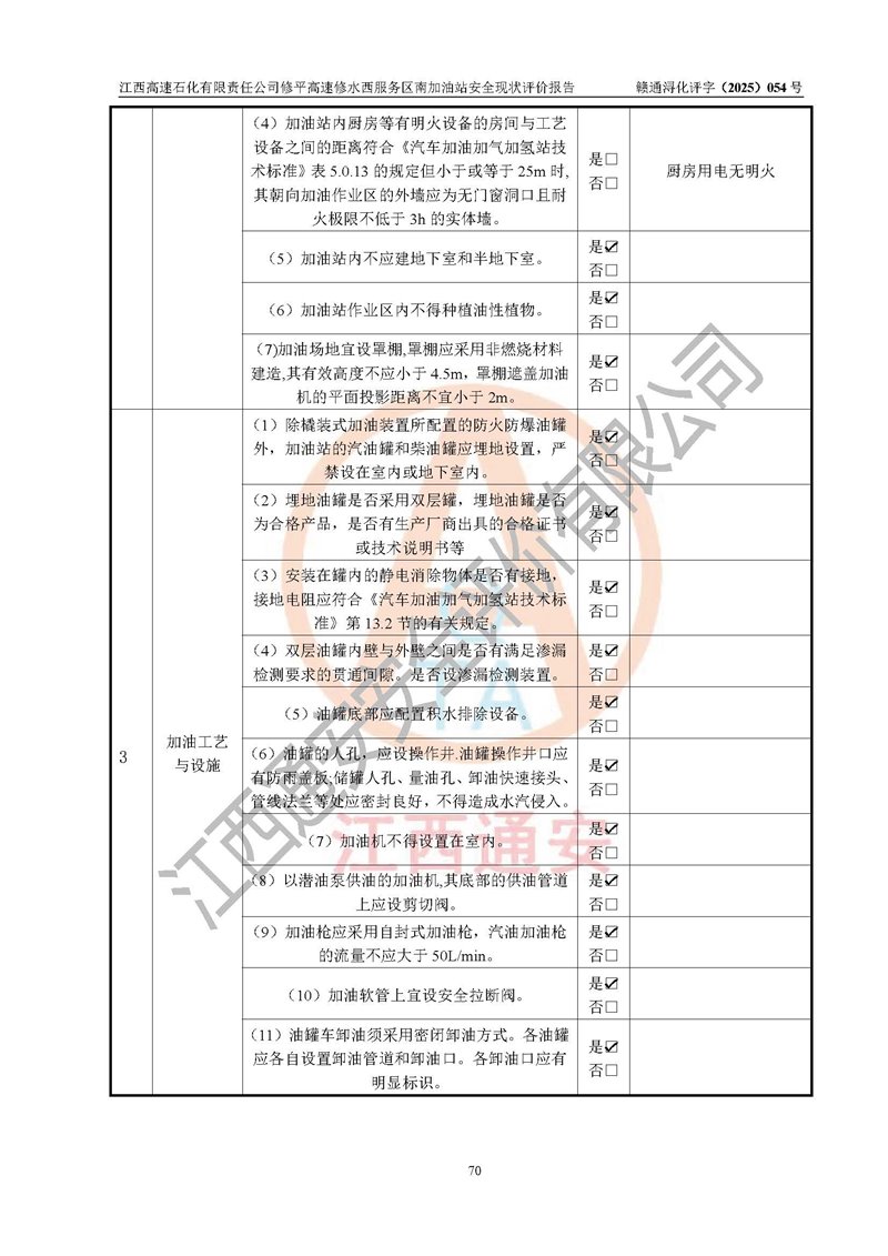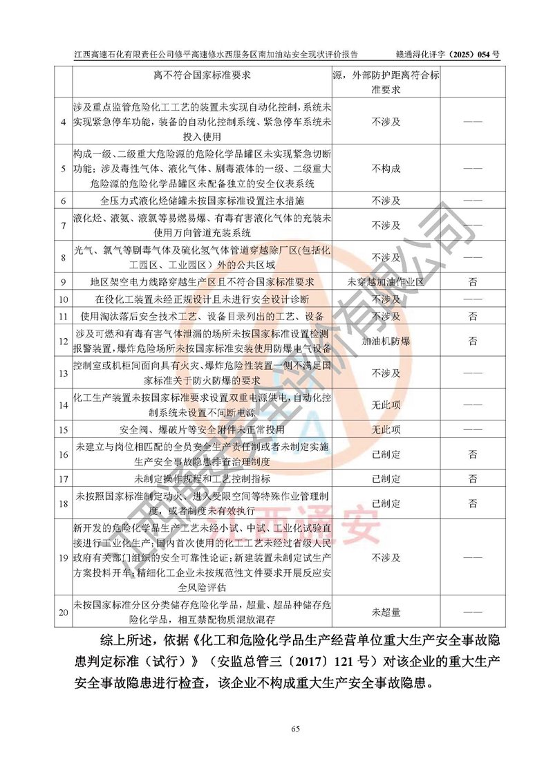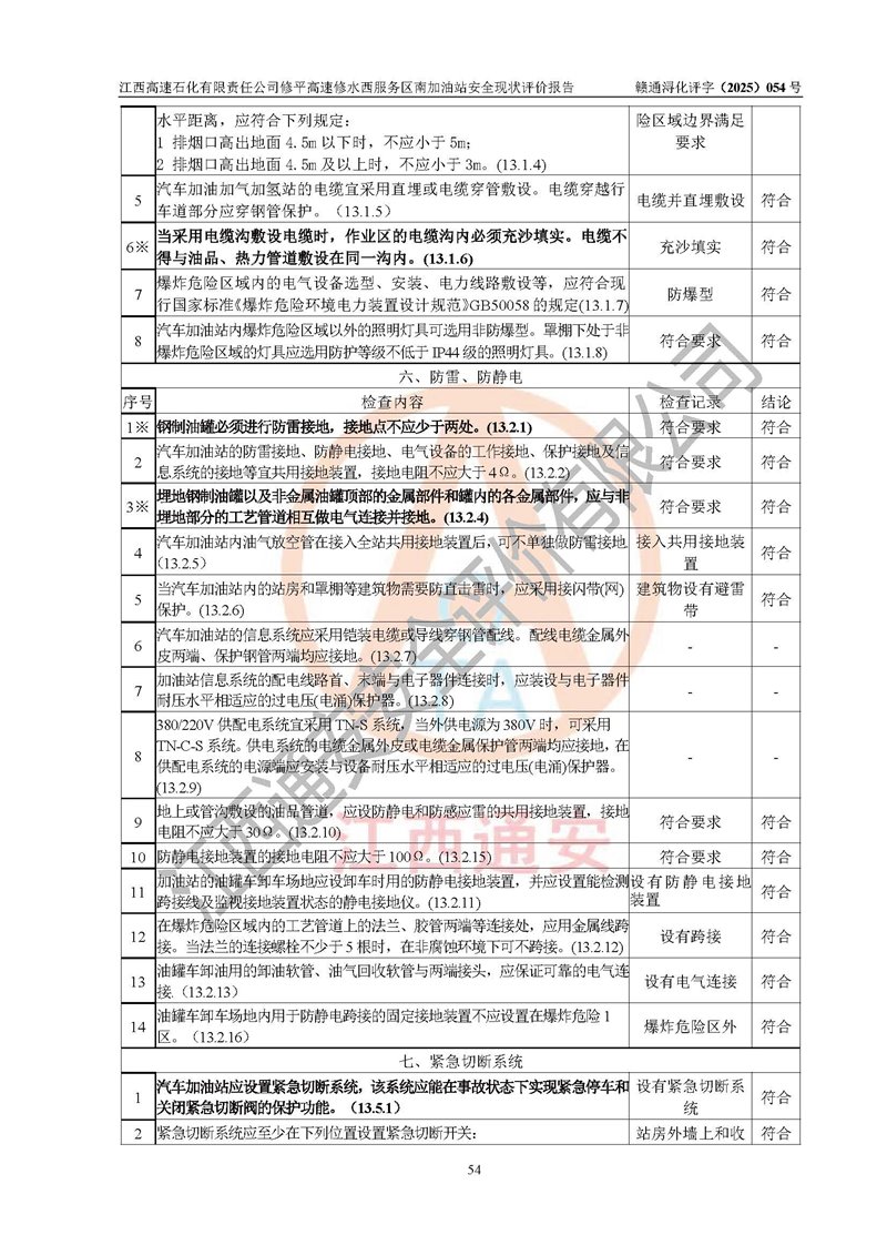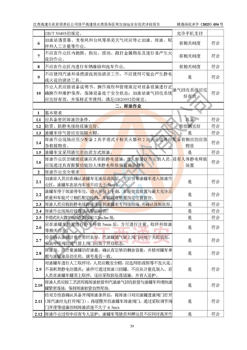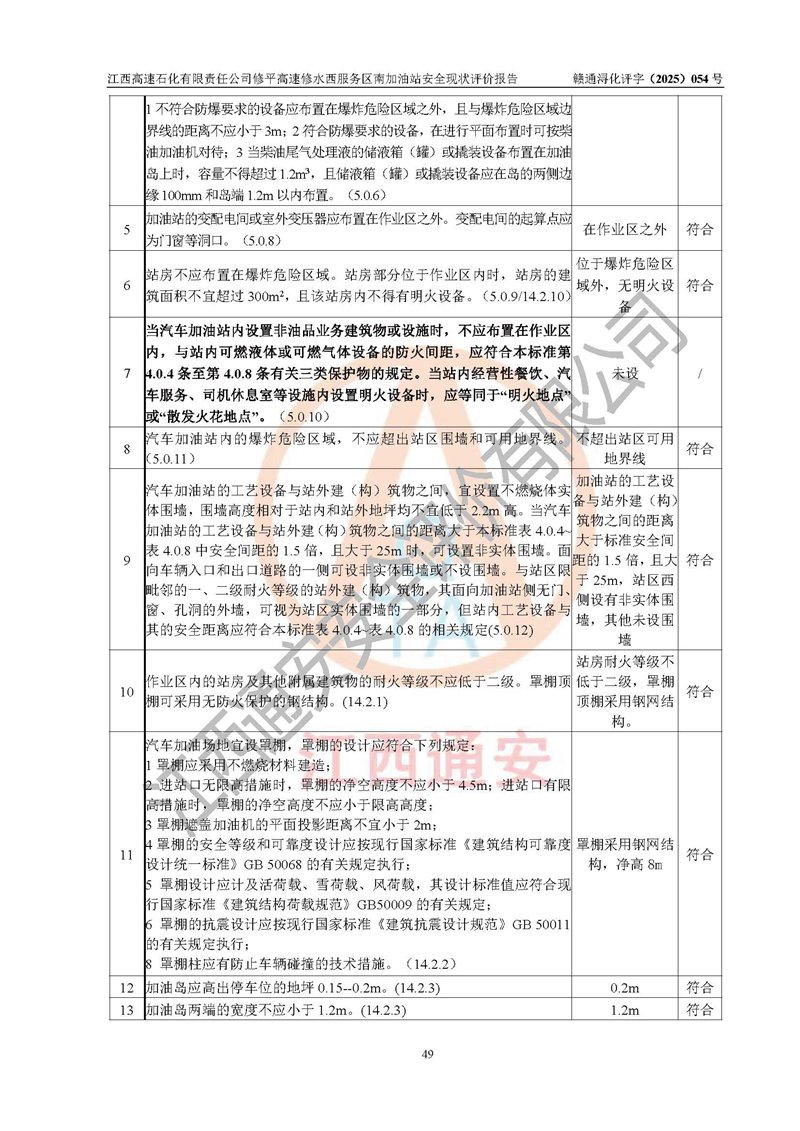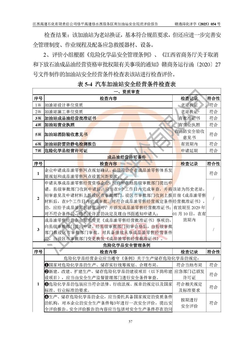 評價(jià)結(jié)論 | 江西高速石化有限責(zé)任公司修平高速修水西服務(wù)區(qū)南加油站涉及的安全條件、安全經(jīng)營條件、安全生產(chǎn)管理符合《危險(xiǎn)化學(xué)品經(jīng)營許可證管理辦法》、《汽車加油加氣加氫站技術(shù)標(biāo)準(zhǔn)》等**有關(guān)法規(guī)、標(biāo)準(zhǔn)、規(guī)范要求,能滿足危險(xiǎn)化學(xué)品經(jīng)營安全條件。 | |||